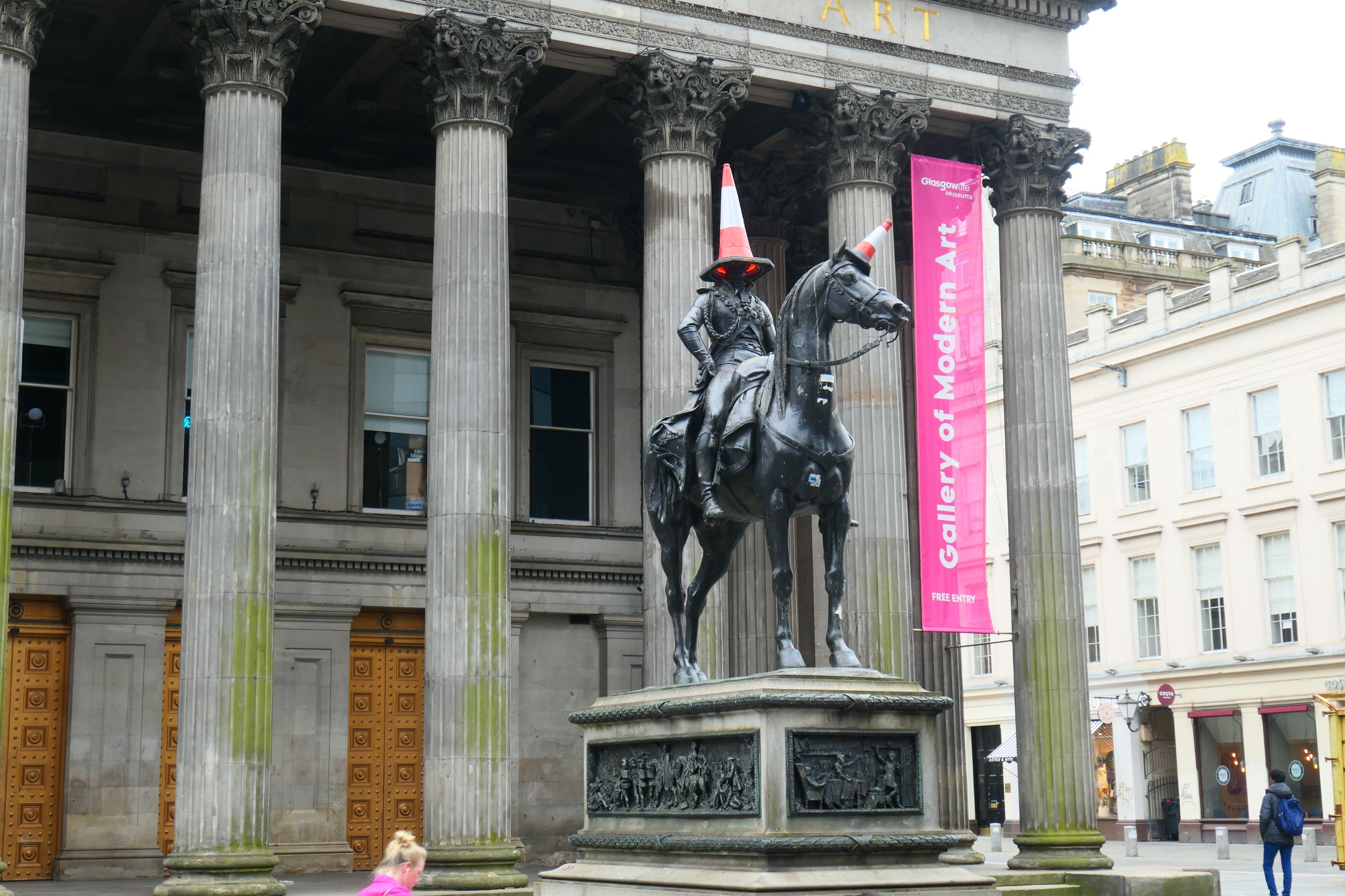 Back aboard the bus once again, we returned to George Square where we had boarded the first bus this morning. Google Maps directed us to a pharmacy a few blocks away. Marg was doing her best to hobble along, but her ankle was still really sore. We got what we needed and headed back to our hotel, past the famous Duke of Wellington statue, perhaps better known these days as Conehead. It started as a uni student prank. Every time the cone was removed, someone replaced it. Eventually, in the spirit of fun, the city council left it there and now they actually use it in their promotion of Glasgow.