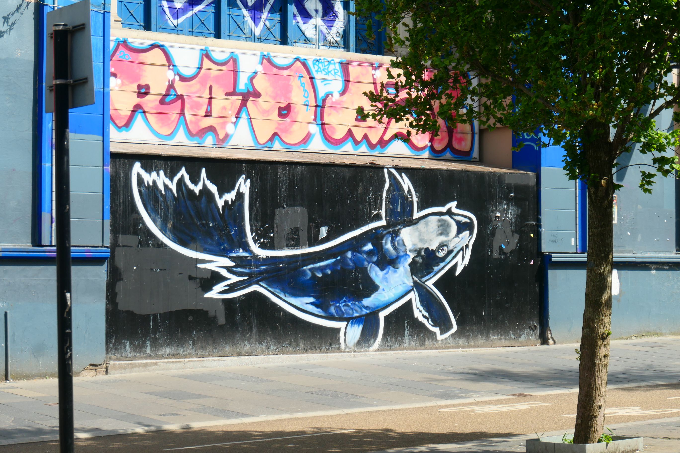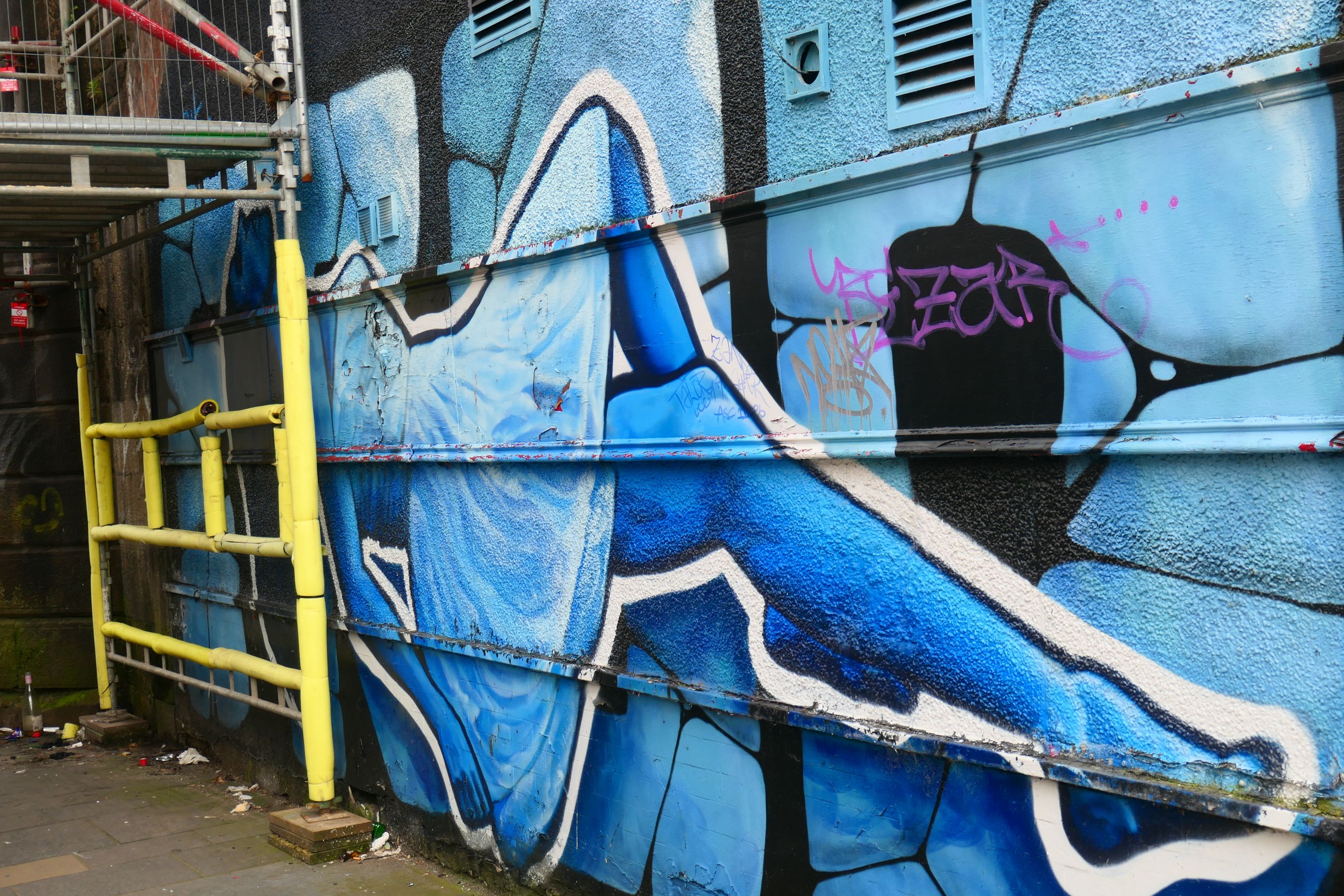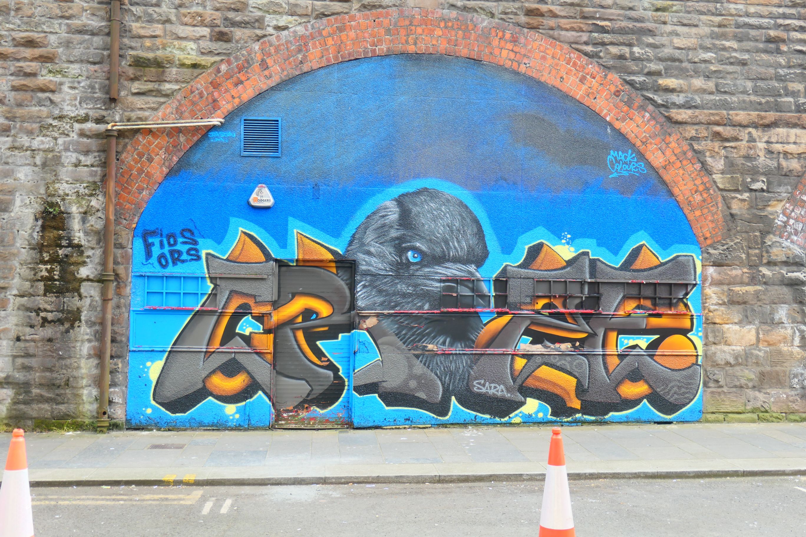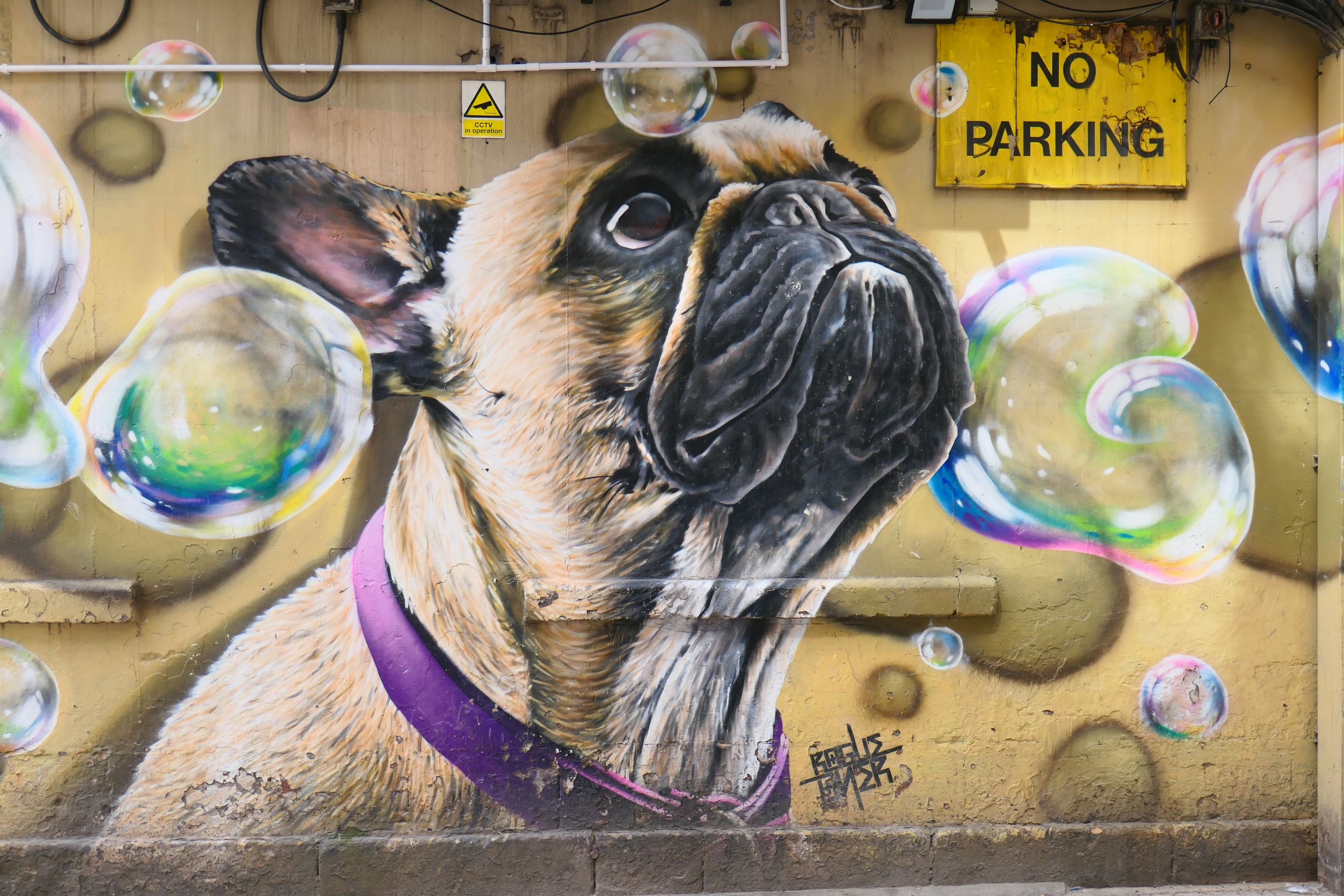 Renfield Lane features a work called Bubbles, which is in two parts on facing walls. I liked the No Parking sign by the dog, which some wag has now changed to No Barking.