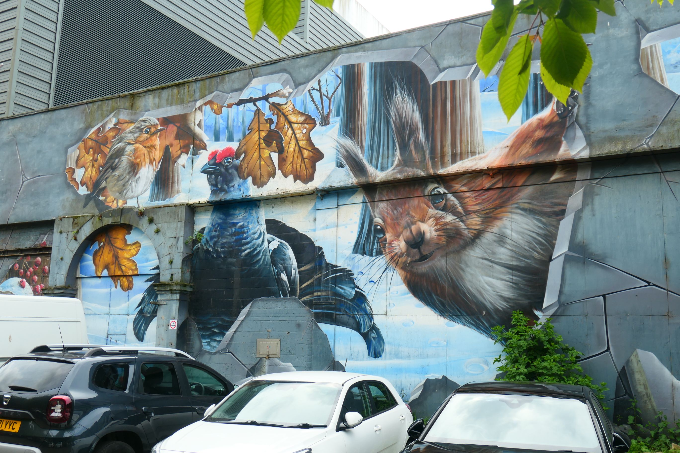 In the Ingram St car park, the artist has painted many of the small animals that inhabit Glasgow. The mural, Fellow Glasgow Residents, is another work by Smug. It stretches the entire length of the car park.