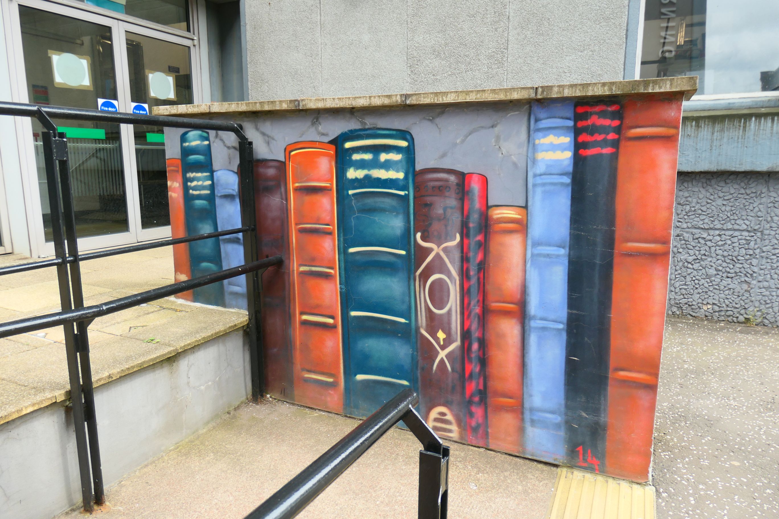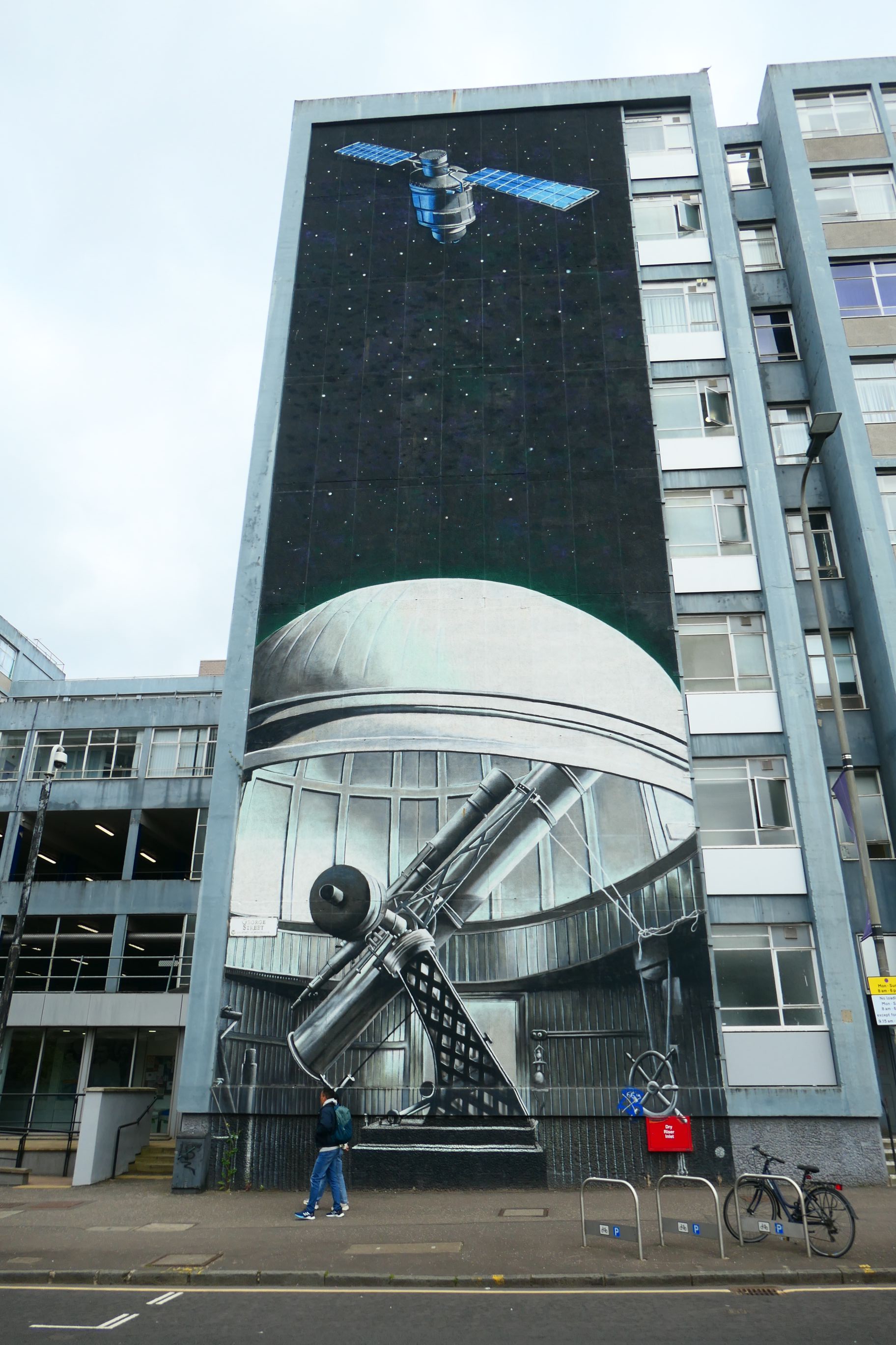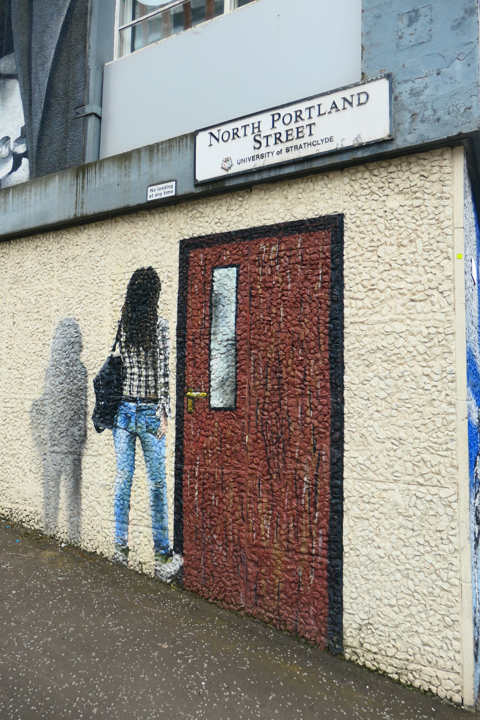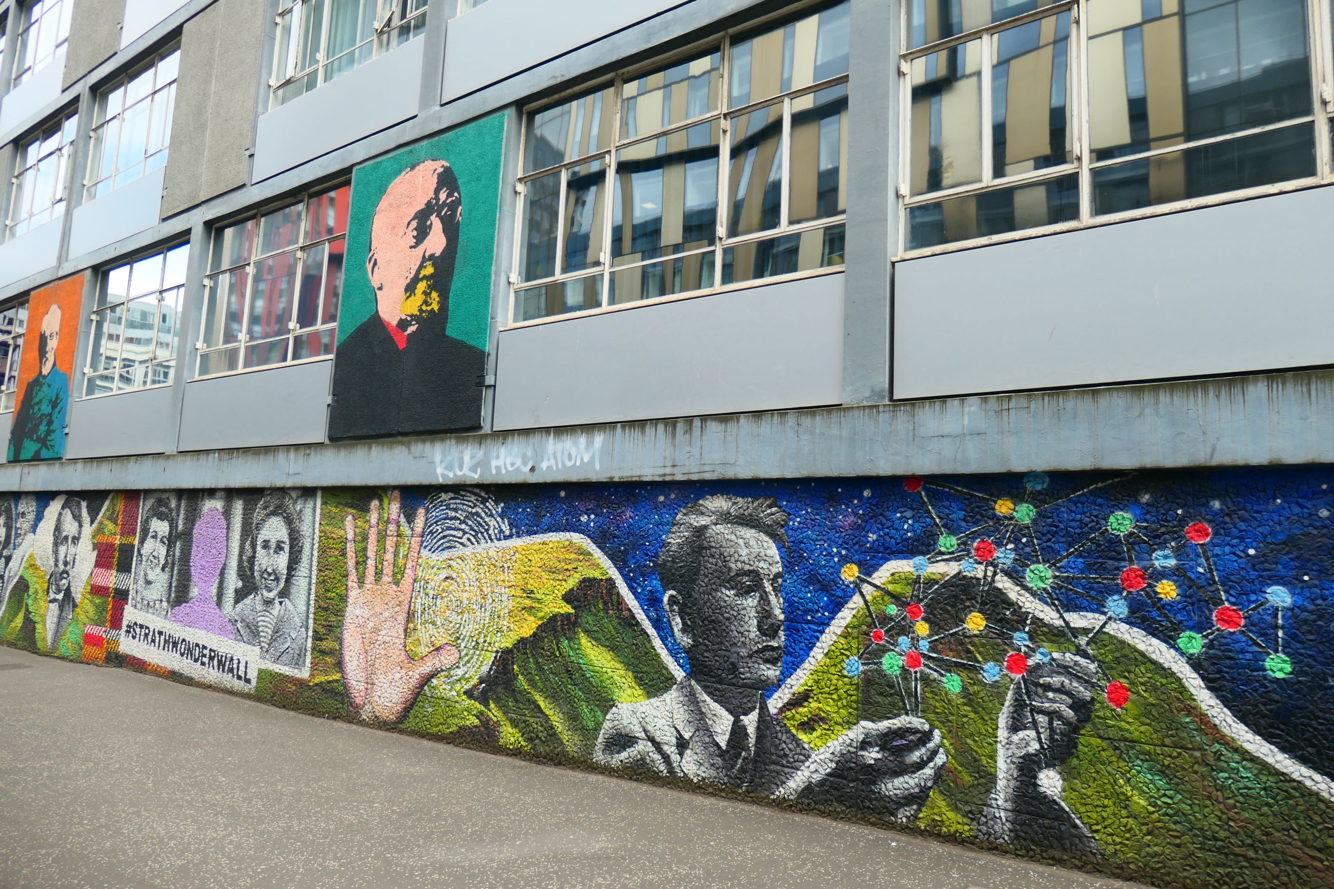 The University of Strathclyde promotes itself as a place for ‘useful learning’. Its subjects include the sciences and engineering. Its murals celebrate some of its famous alumni and their achievements. There are also some fun art works that blend in with the structure, such as a girl entering a door and a pedestrian hanging onto a railing.