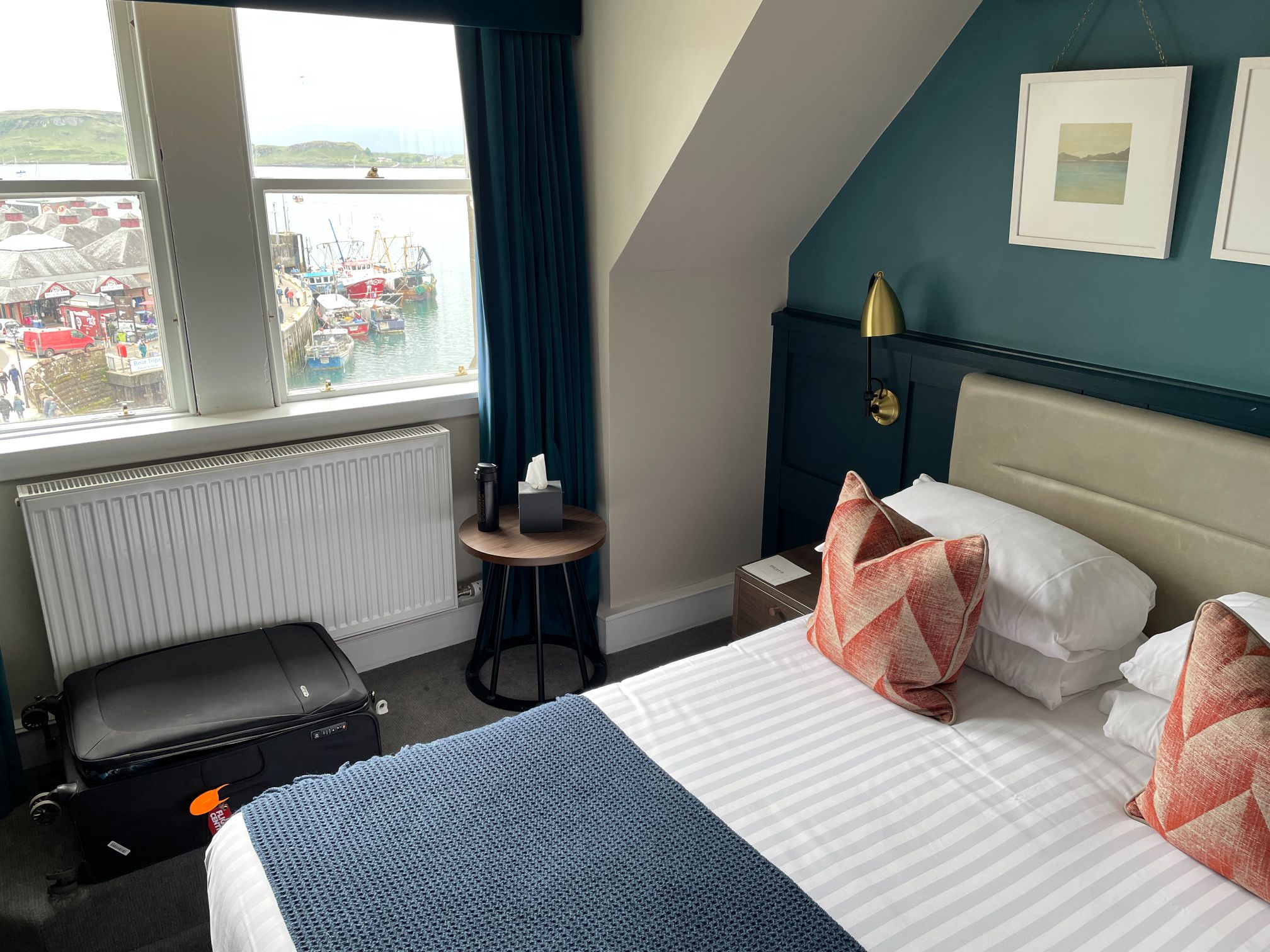 Our hotel, the historic Perle, is directly across the road from the station – literally a 50 metre walk. We couldn’t believe our luck when we stepped into our room and set eyes upon the stunning view out over the pier and the harbour. Boats and ferries were going to and fro from the pier and occasionally the cries of gulls could be heard. It’s an idyllic seaside setting, and just what we were hoping for from our rail tour of Scotland.