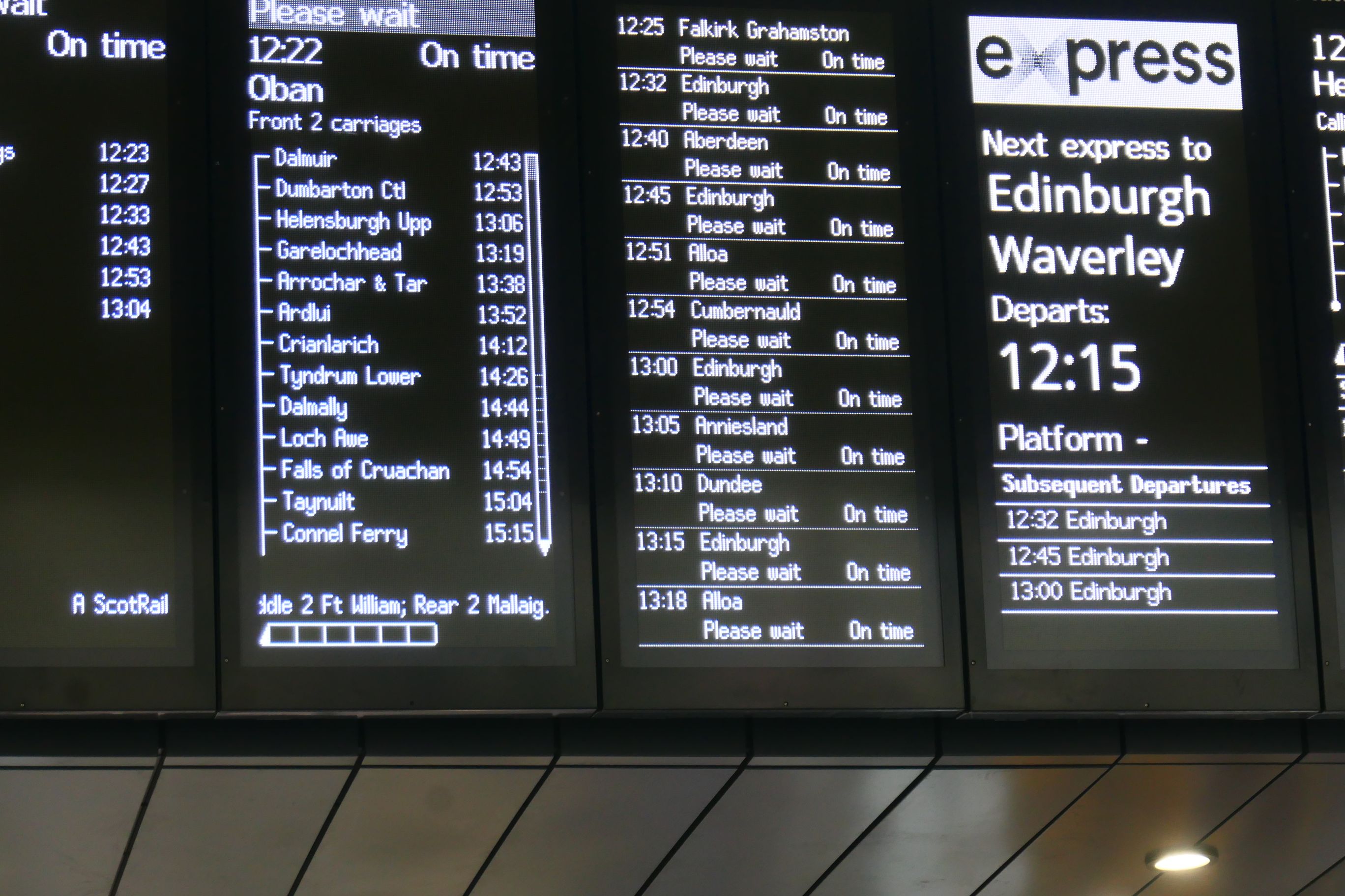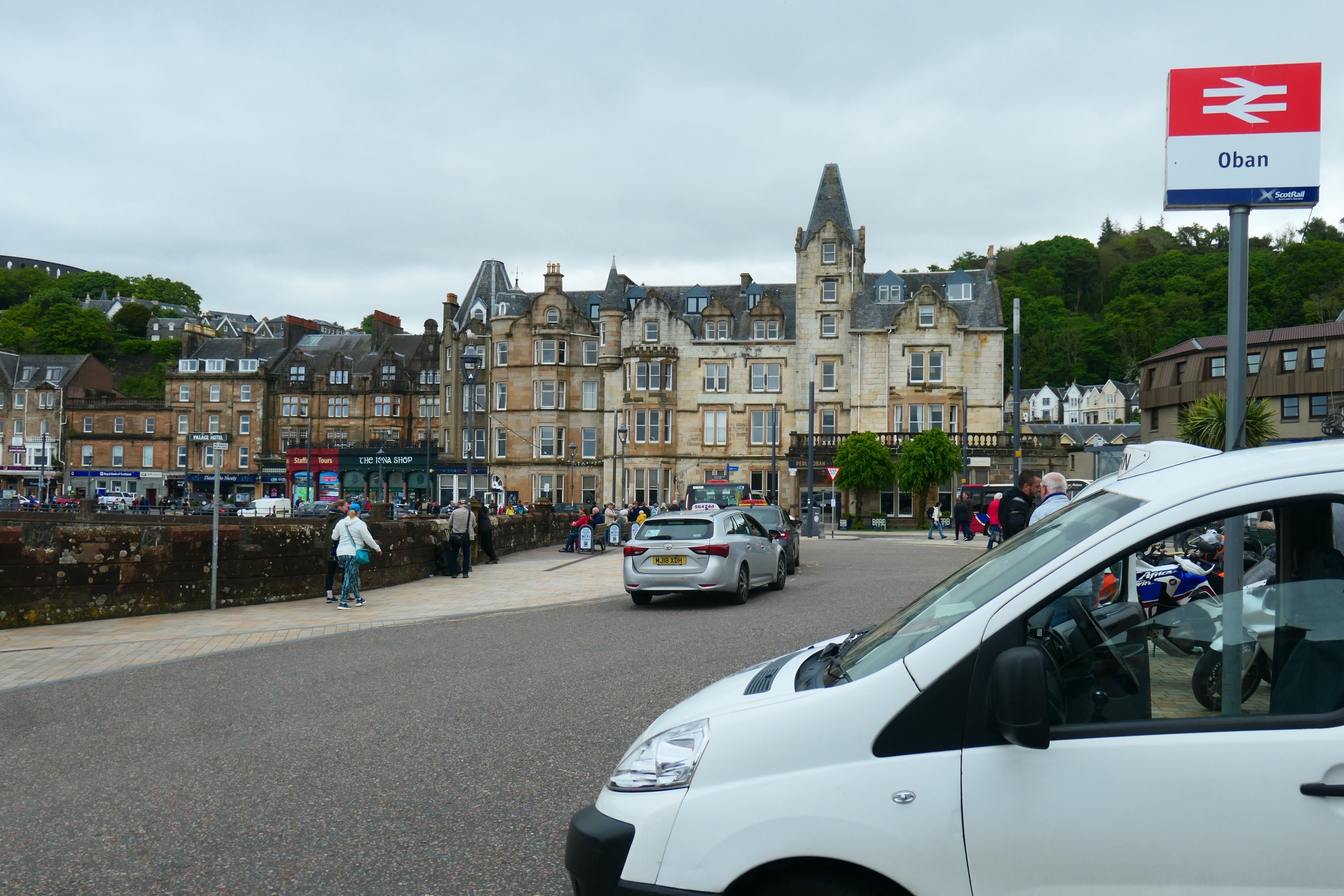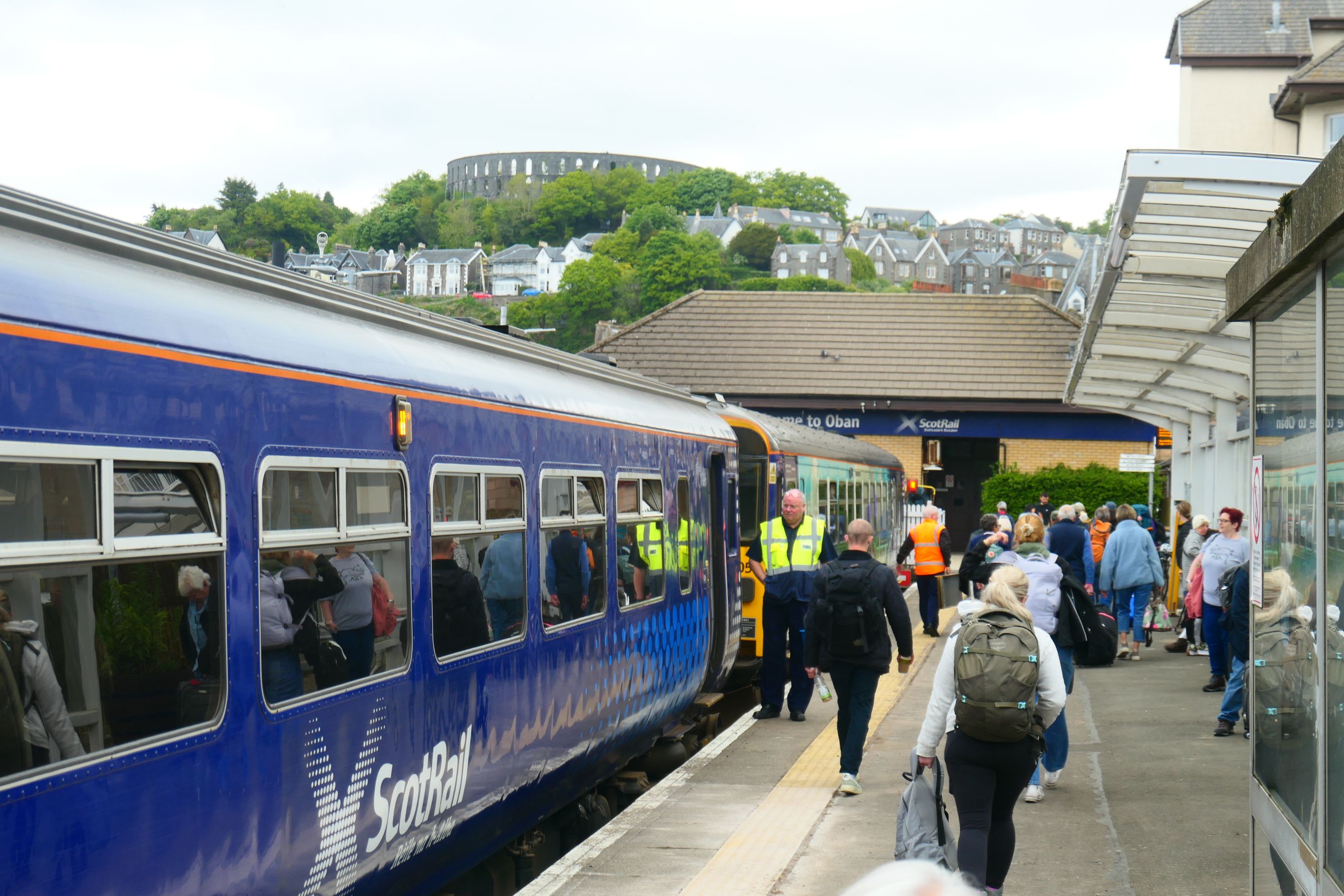 We returned to our hotel to check out, then walked back to the station, which is probably only about 200 metres away. We stood in front of the departures board for about an hour, waiting for the platform number for the train to Oban. When it finally appeared, we saw that the first two carriages were going to Oban, the next two to Fort William, and the final two to Mallaig. (Although we didn’t hear carriages being removed, when we finally arrived in Oban, our train was certainly much shorter than when we left Glasgow).