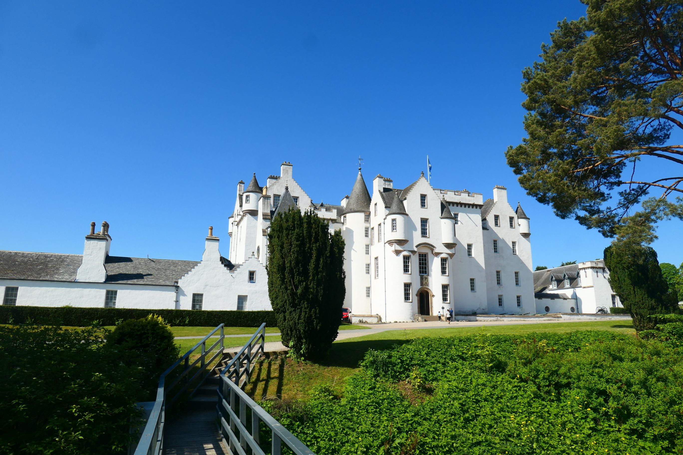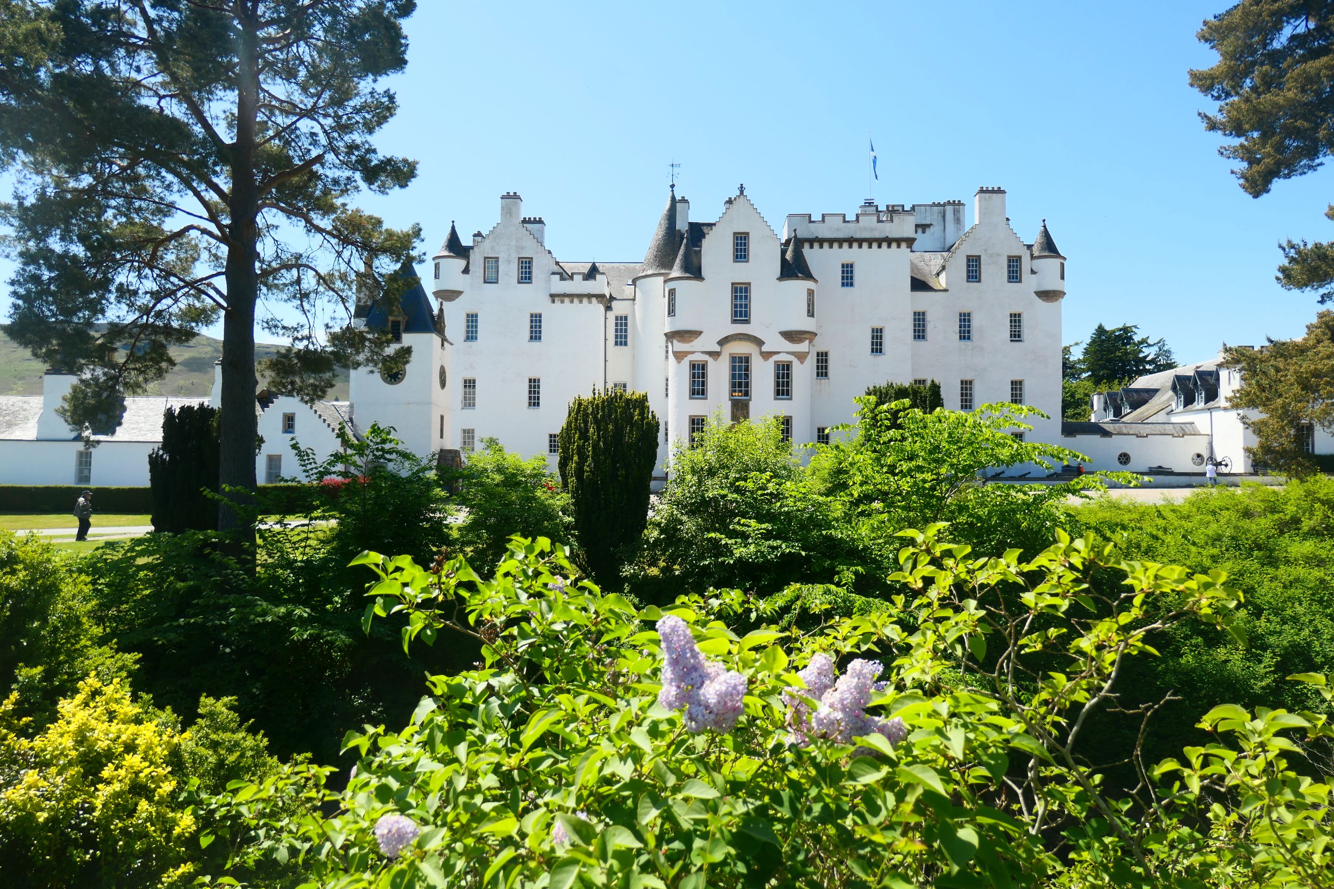 The bus drove into the grounds of Blair Castle and dropped us off by the carpark. In such amazing sunshine, the white castle walls set against the backdrop of a blue sky made a striking contrast. Marg and I had visited the castle four years ago, but it was a first visit for Janie and Neil. And it’s probably not quite correct to refer to it as a castle, because in the 1740s, the second Duke of Atholl transformed what had been a medieval castle into a grand Georgian mansion.