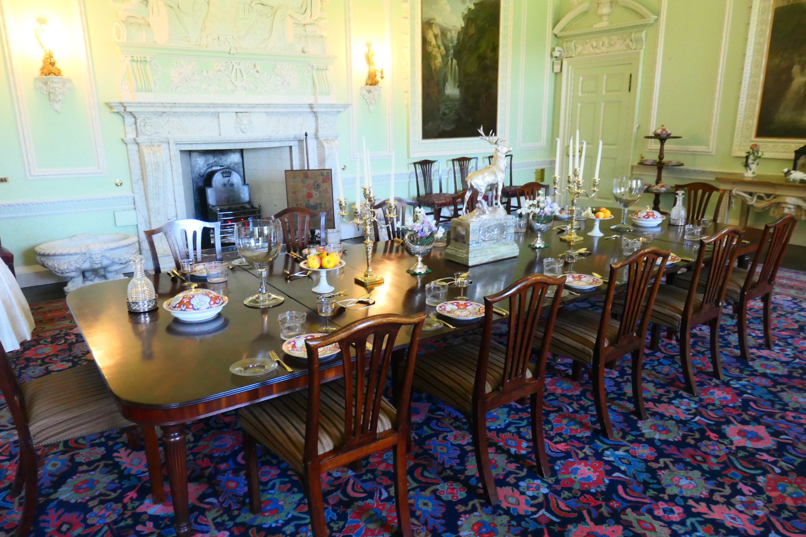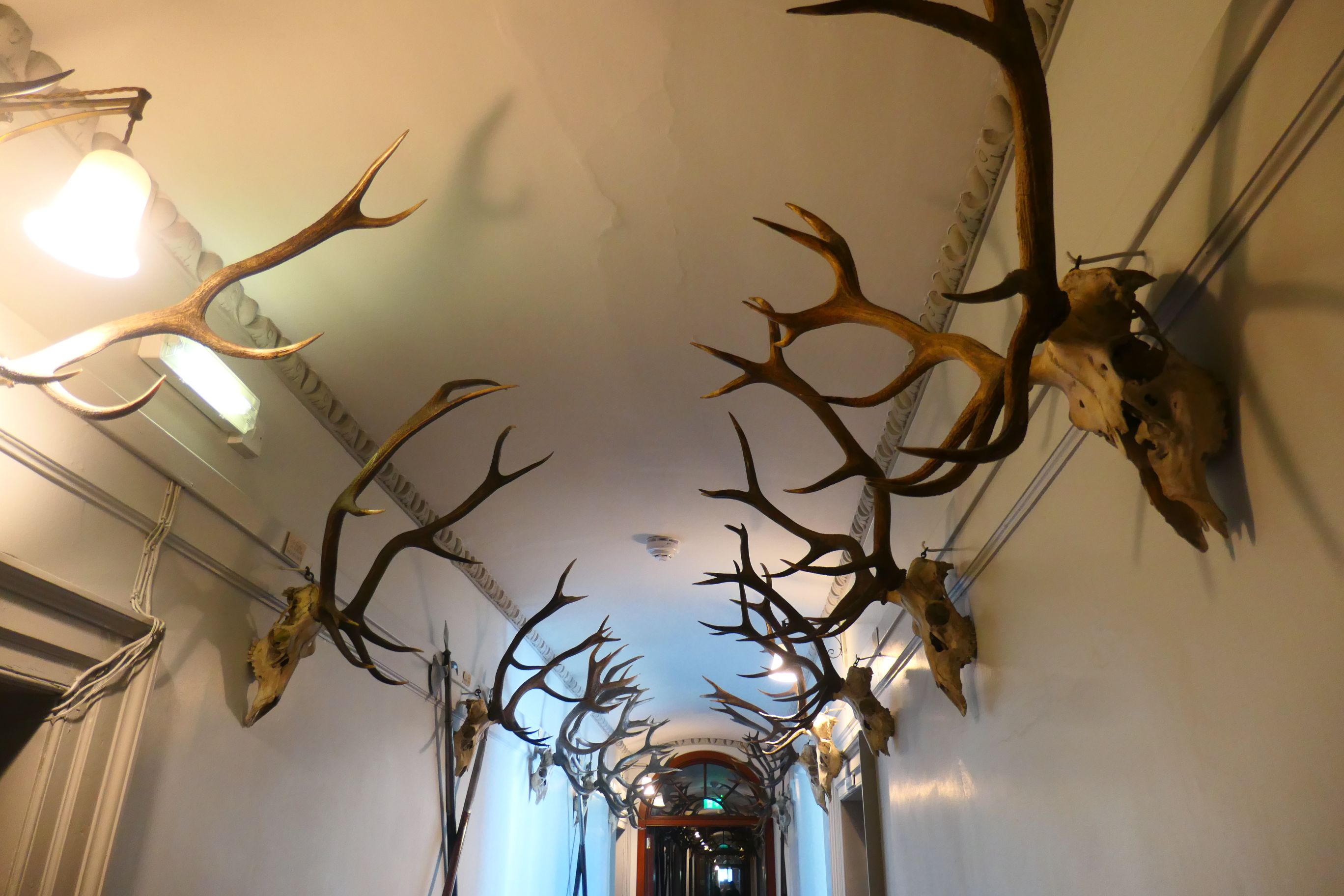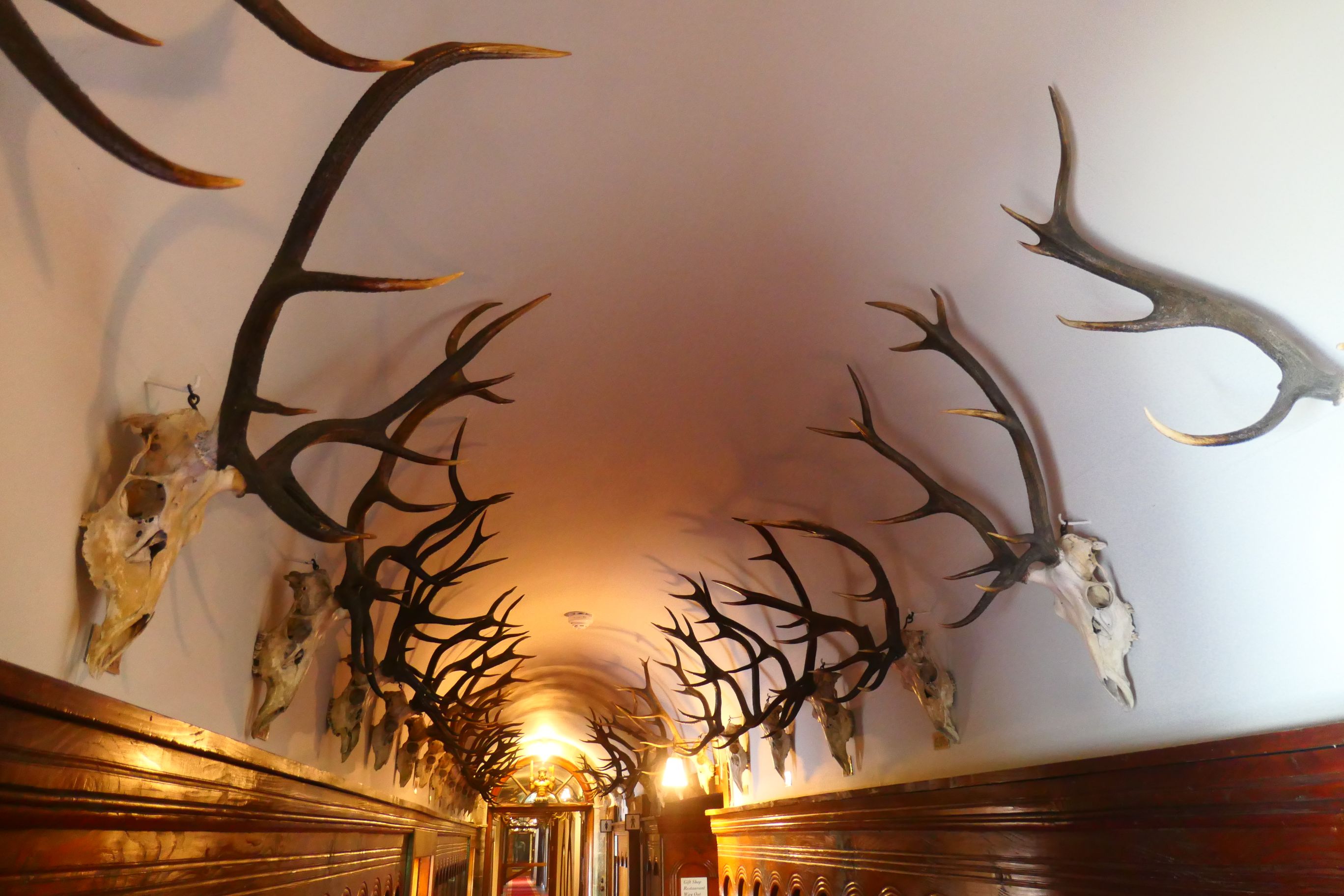 The photos below give an indication of what a grand mansion Blair Castle was. Stag horns and weaponry adorn the passageways and staircases. Fine hand-crafted furniture, painted portraits, silver tableware, ornate ceilings and mantlepieces, wall tapestries, fine china crockery and other adornments are all indicators of the status of the Murray family and their wealth.