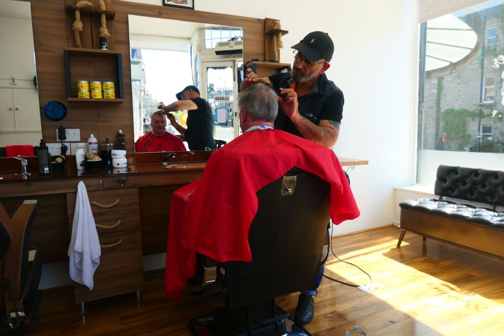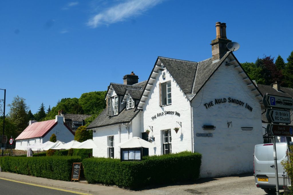 After a visit lasting almost three and a half hours, we took the bus back to Pitlochry. Marg and Janie wanted to visit a couple of shops, so Neil and I took the opportunity to call into a barber shop and get trimmed in readiness for the next part of our travels. Tonight’s dinner was at the Auld Smithy Inn, where we shared a table with our Canadian friends, Lynn and Don. It, too, looked resplendent in today’s brilliant sunshine.