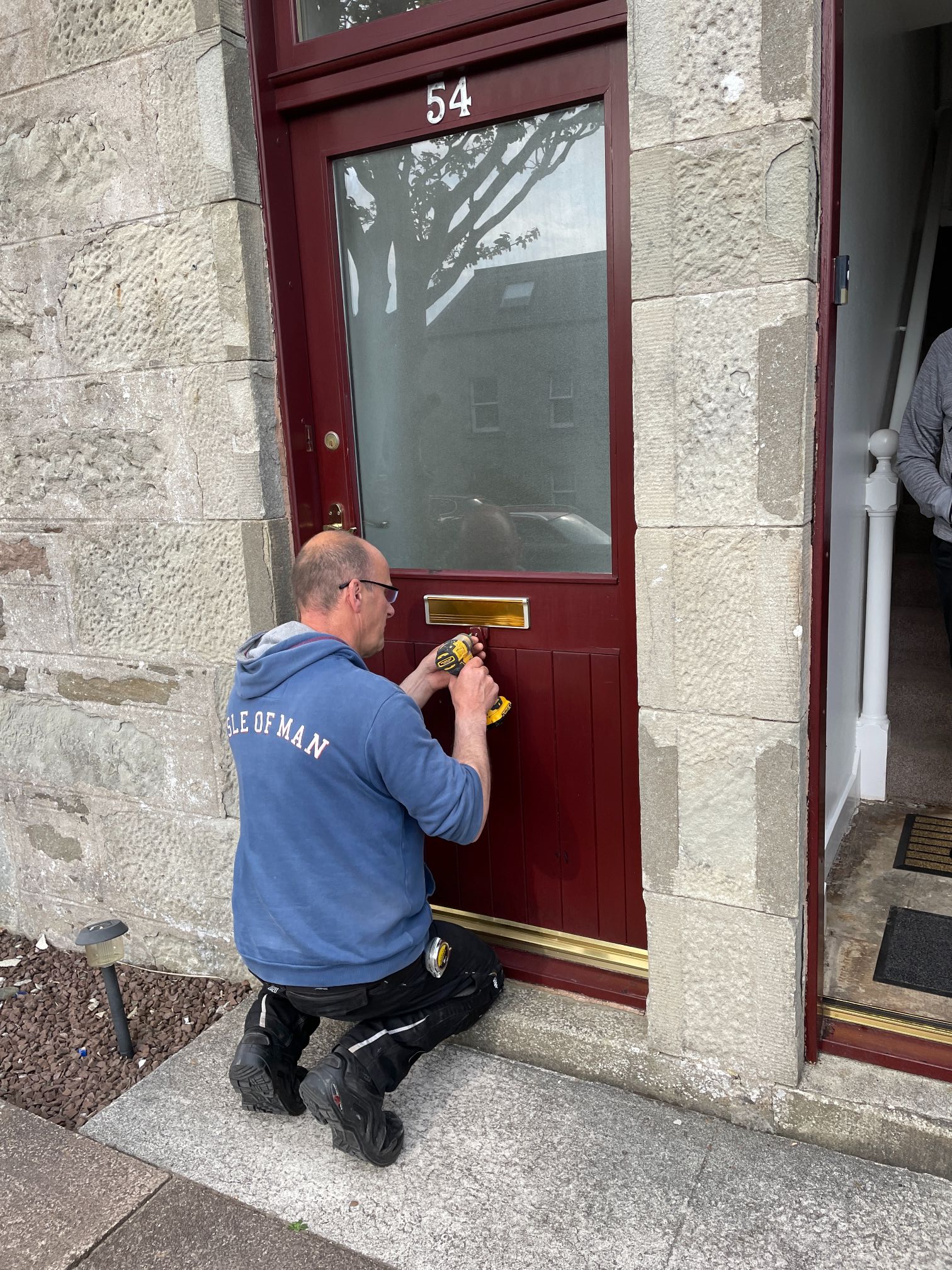 While Steve was working on the door and the lock, making sure it wouldn’t happen again, Denise hung around for a chat. She was lovely. And Steve kept joining in too. Then the next door neighbours turned up. They were also really nice people. We must have stood outside the front door for almost an hour laughing and chatting. The neighbours mentioned an issue with their door, so Steve fixed that too. What a guy! It seemed appropriate to ask everyone to pose for a photo.
