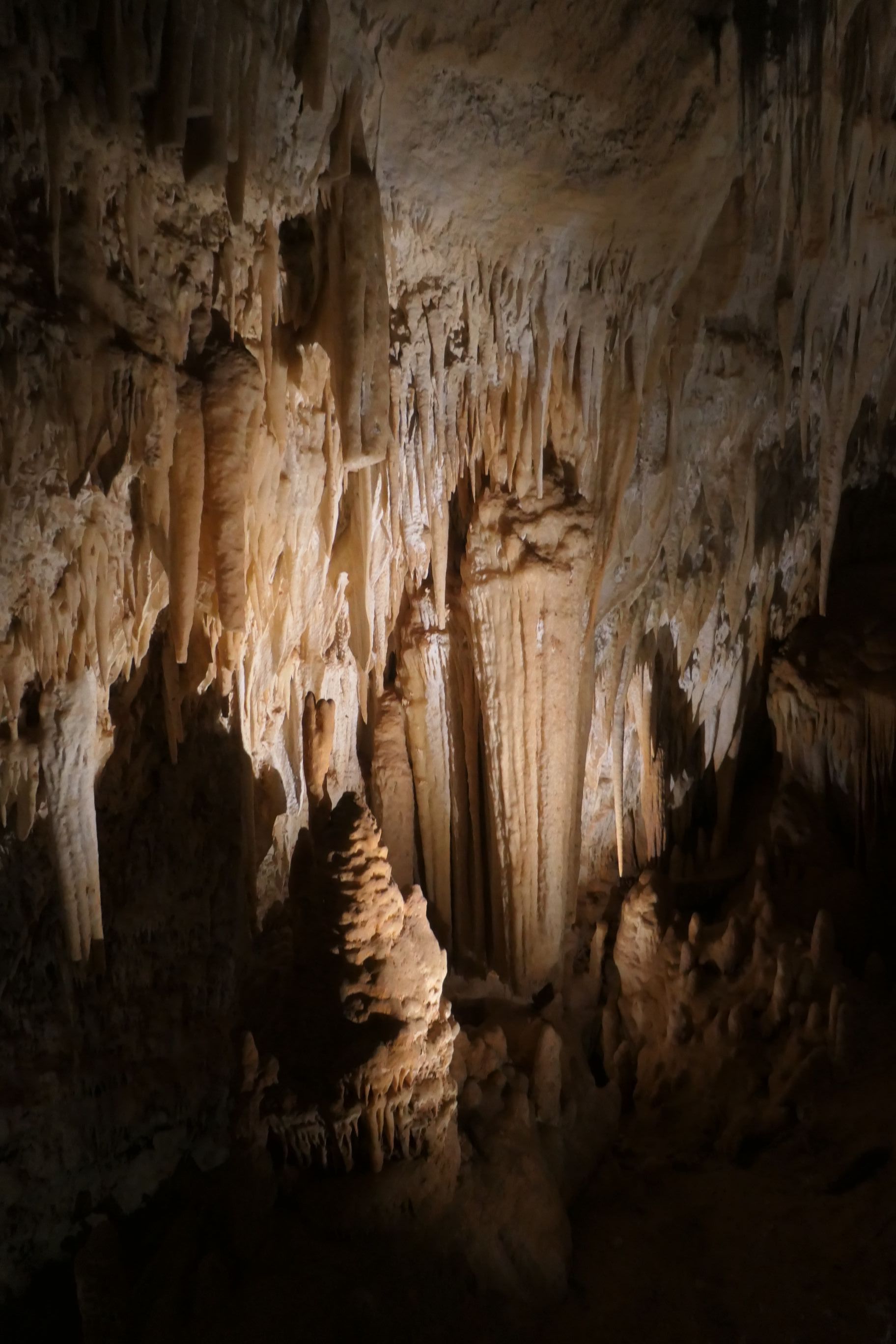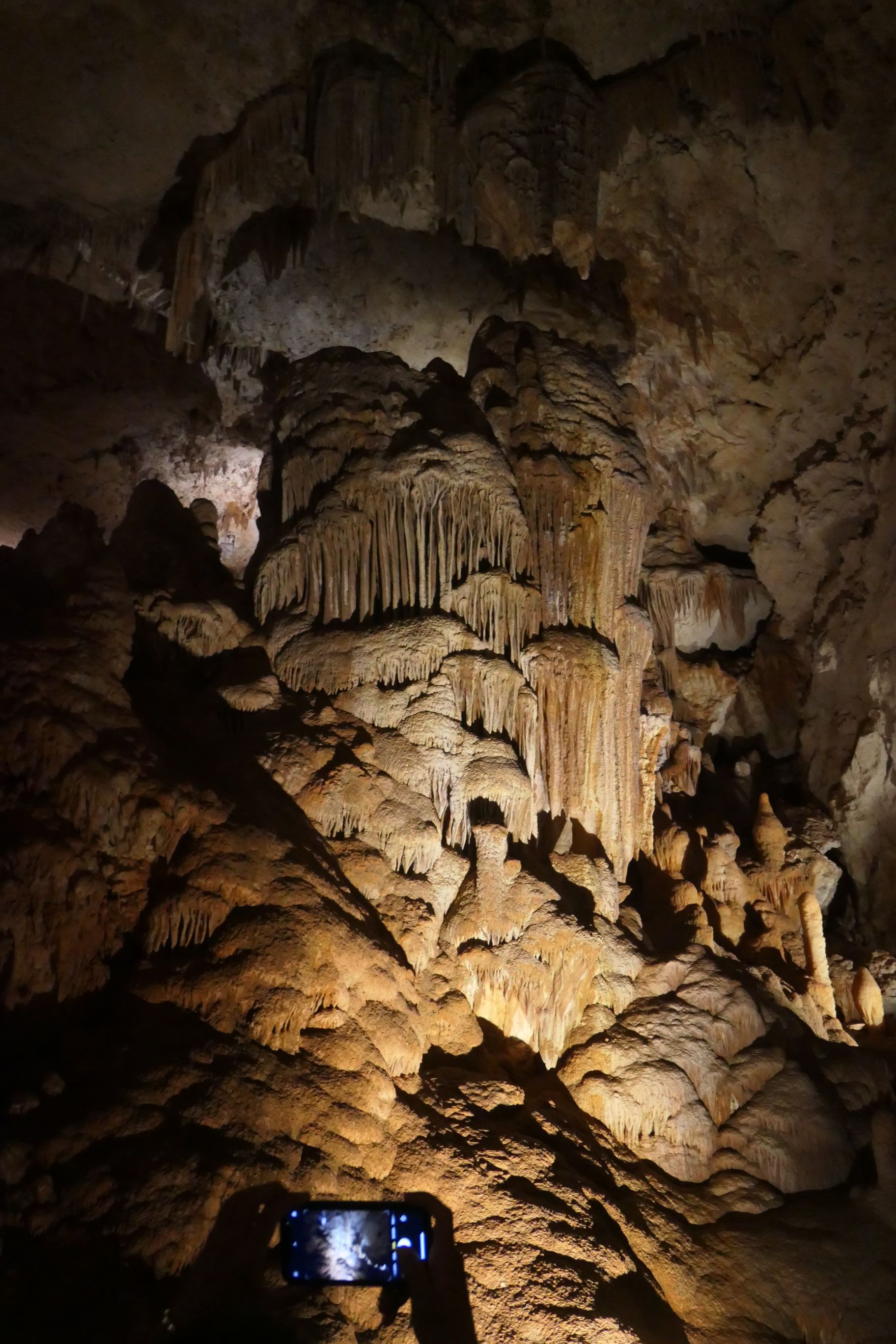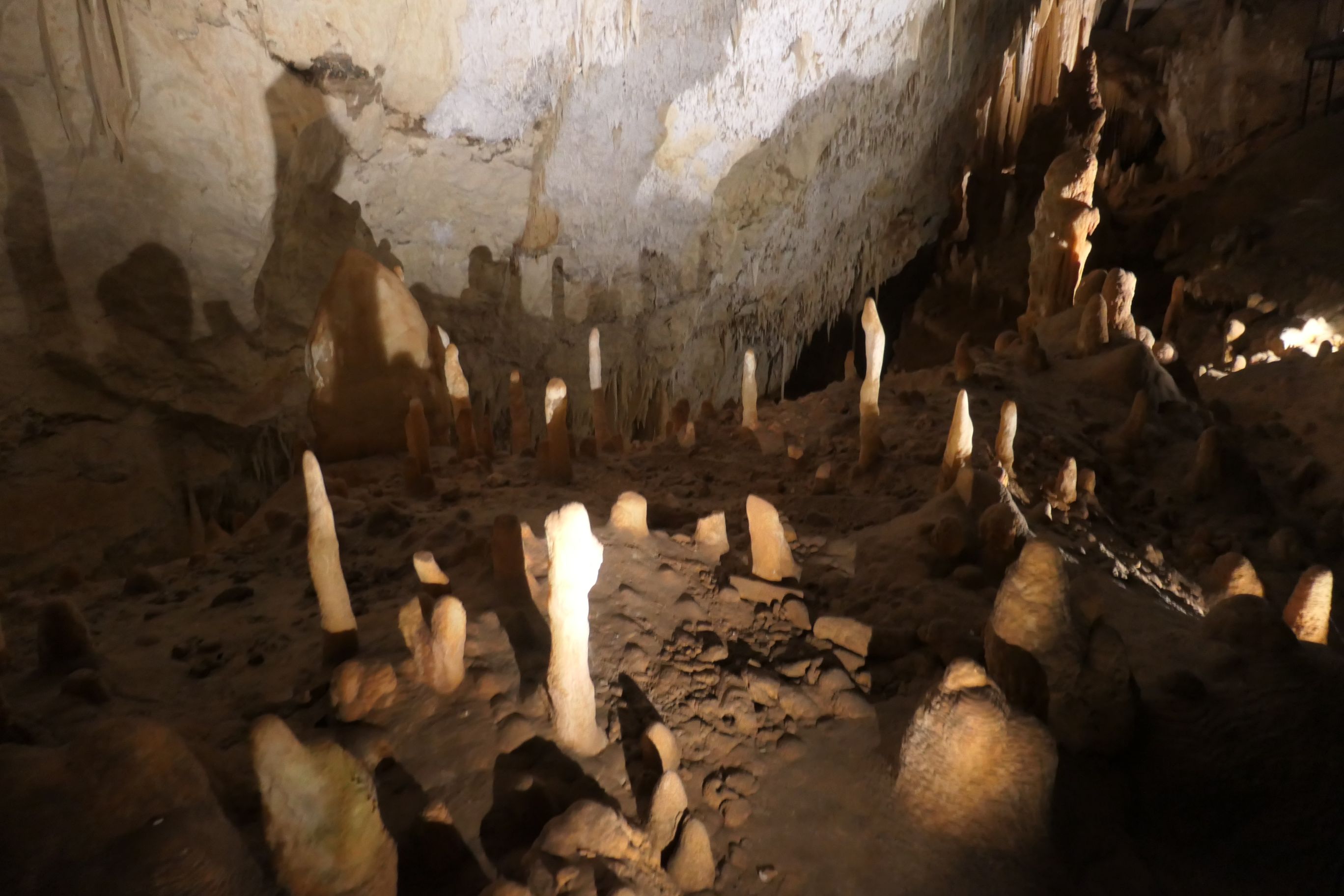 The cave opened up into a broad chamber where impressive stalactites extending down from the roof of the cave and huge stalagmites extending up from the cave floor were illuminated so that we could view them in all their glory. In some places, long winding tree roots trailed down almost to the floor. There were broad viewing platforms that allowed us to view some of the cave’s features from relatively close range. It’s been some time since I was last in a cave and I’d forgotten how beautiful some of the natural structures within truly are.