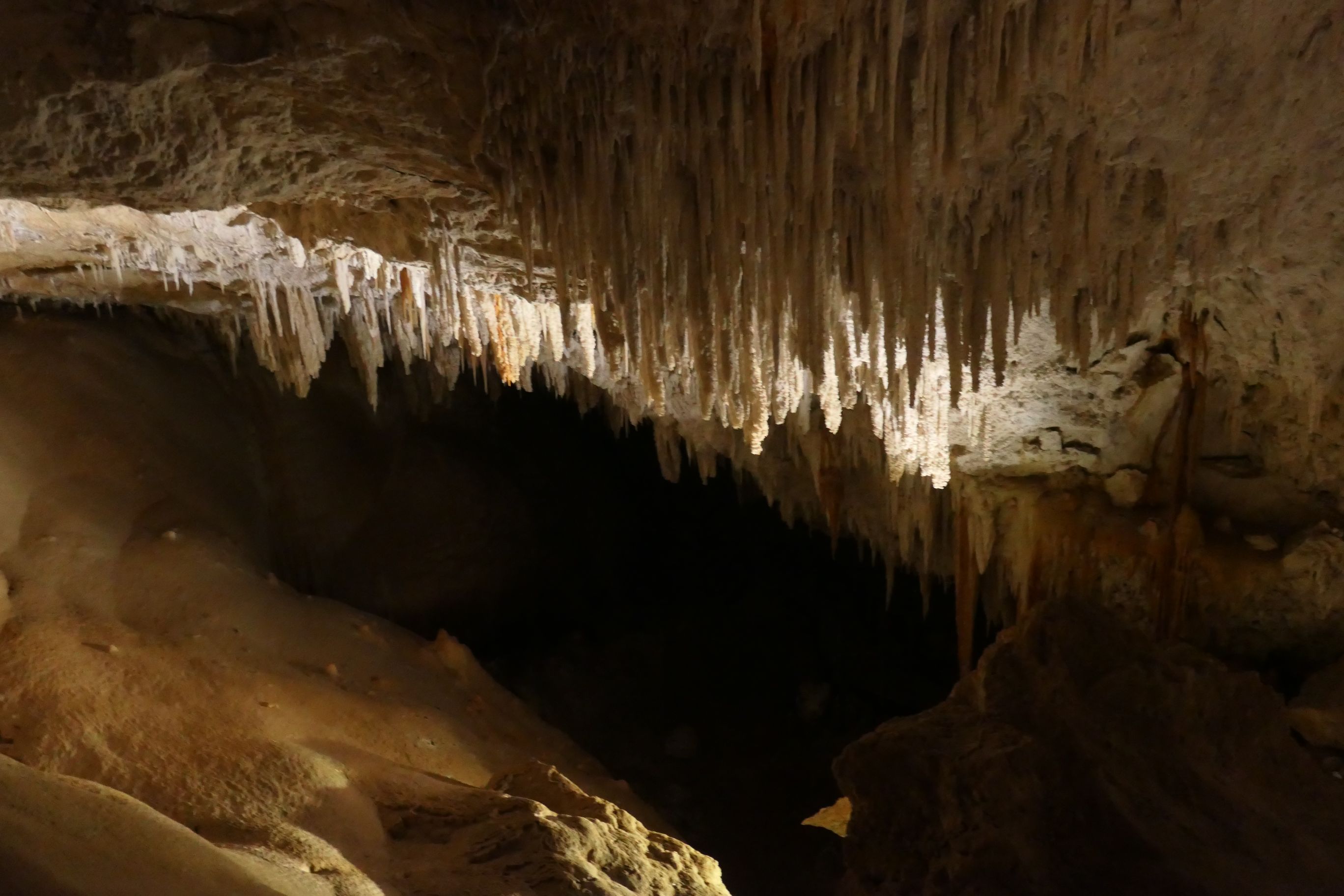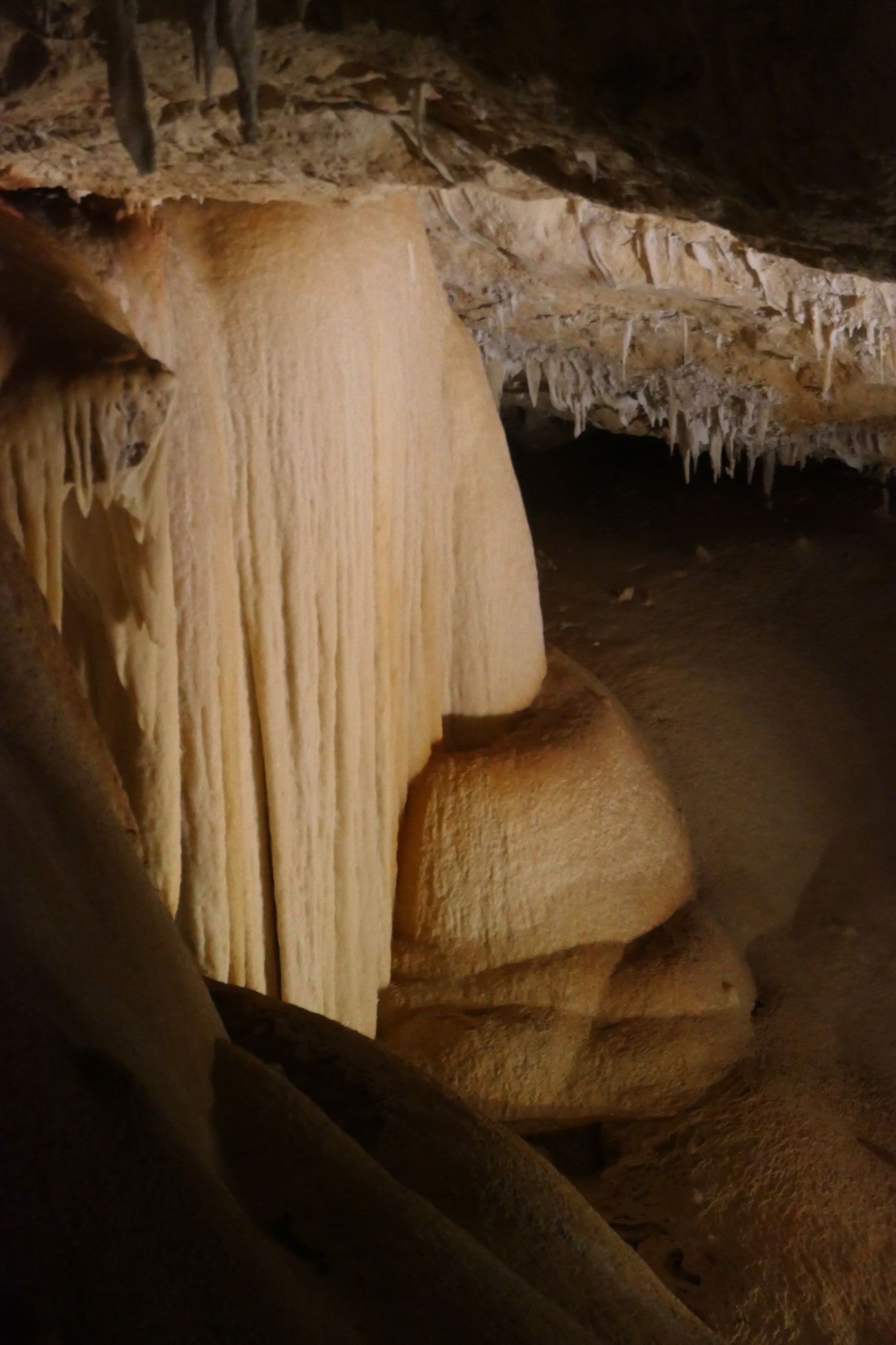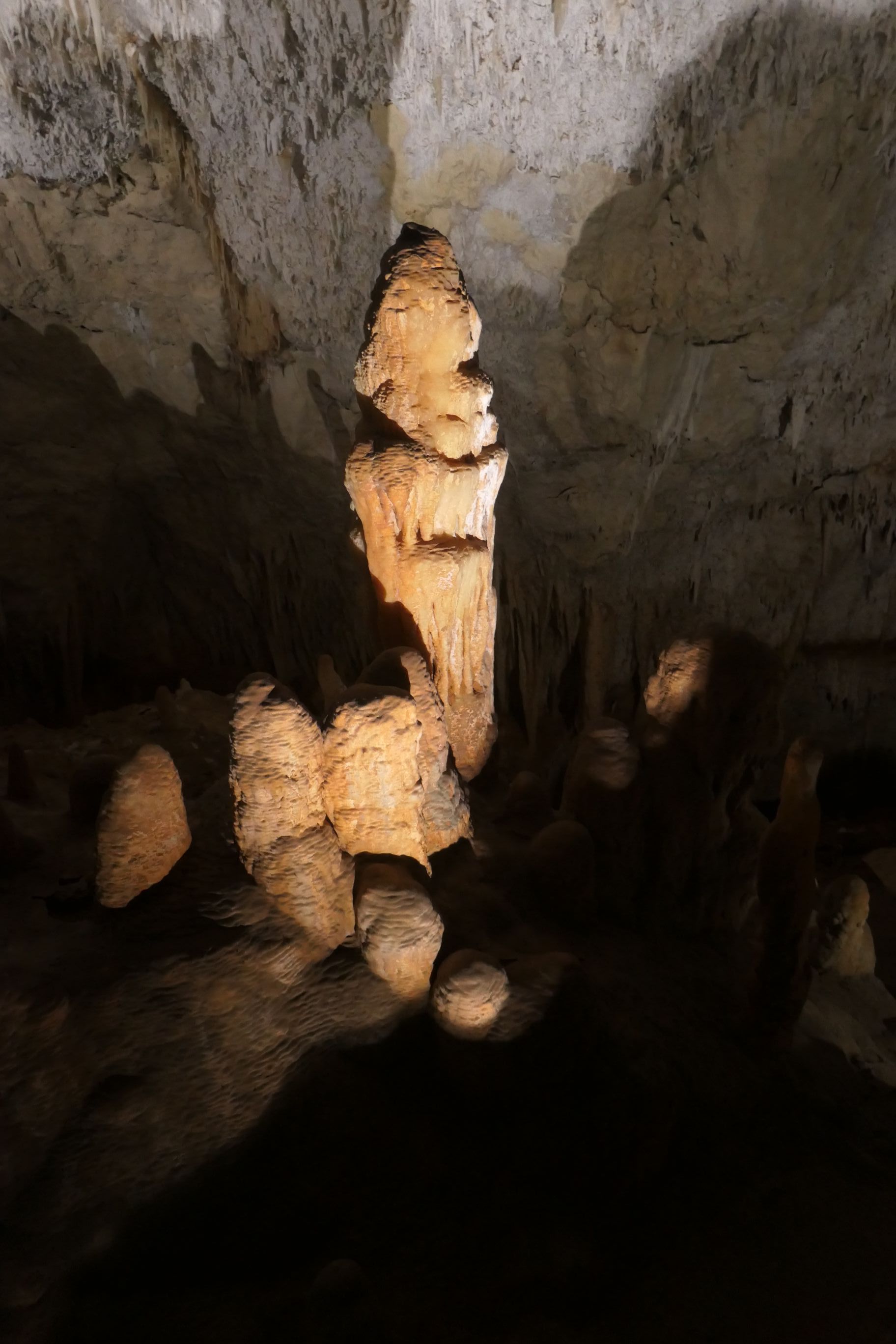 The cave opened up into a broad chamber where impressive stalactites extending down from the roof of the cave and huge stalagmites extending up from the cave floor were illuminated so that we could view them in all their glory. In some places, long winding tree roots trailed down almost to the floor. There were broad viewing platforms that allowed us to view some of the cave’s features from relatively close range. It’s been some time since I was last in a cave and I’d forgotten how beautiful some of the natural structures within truly are.