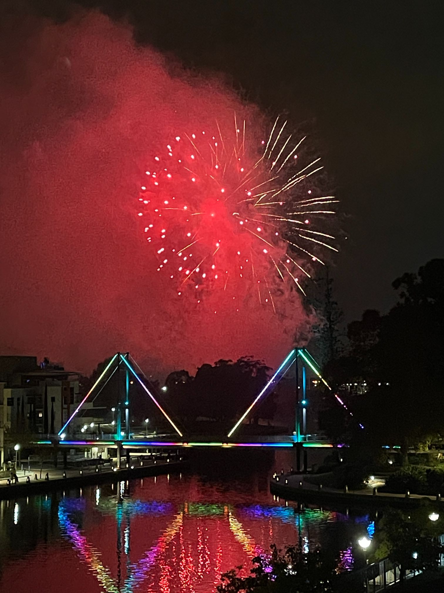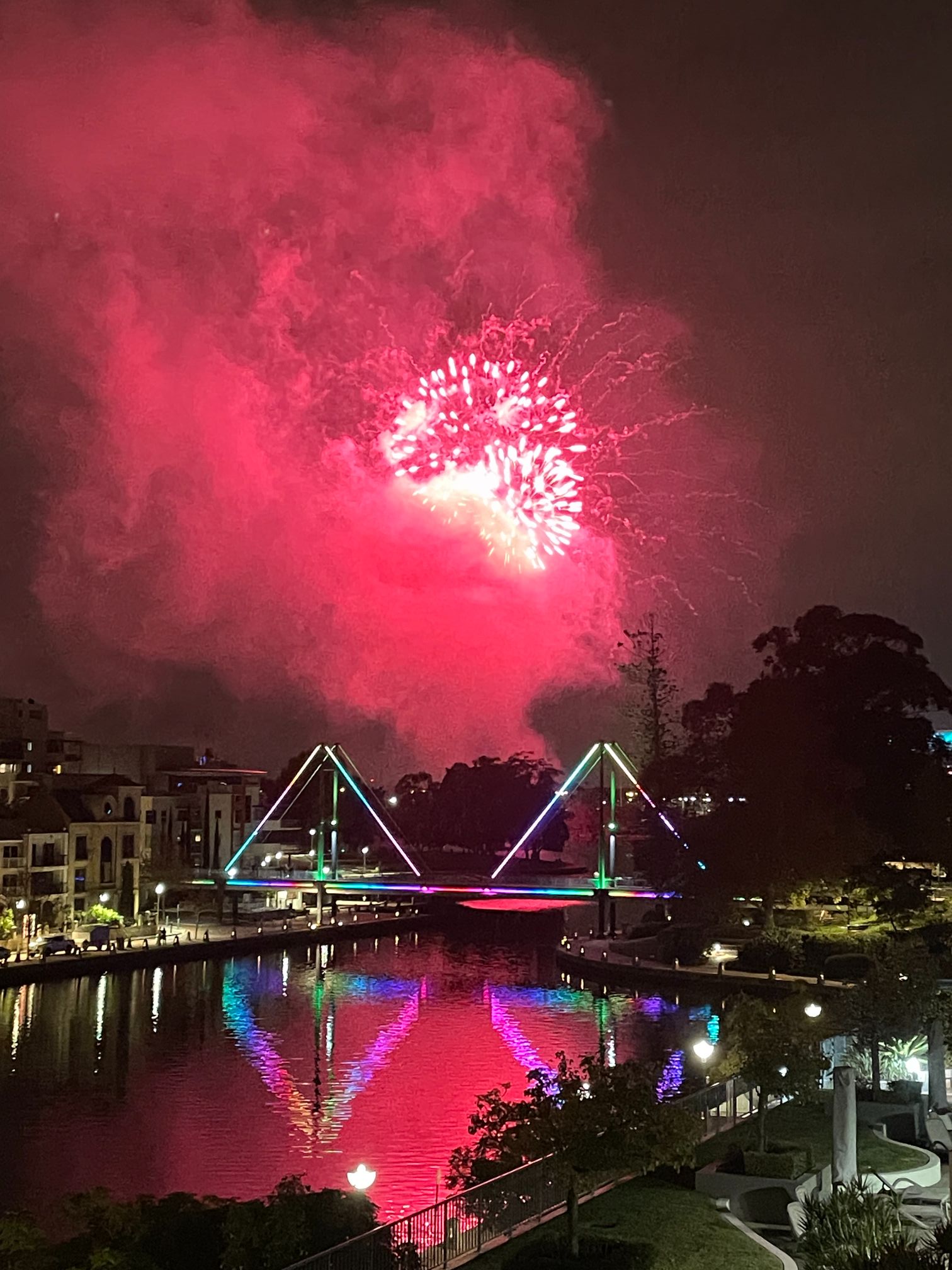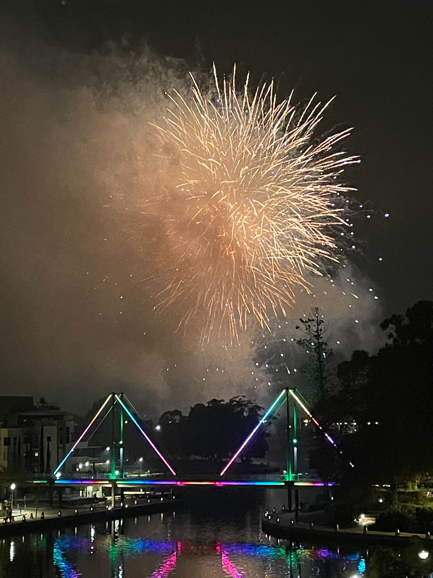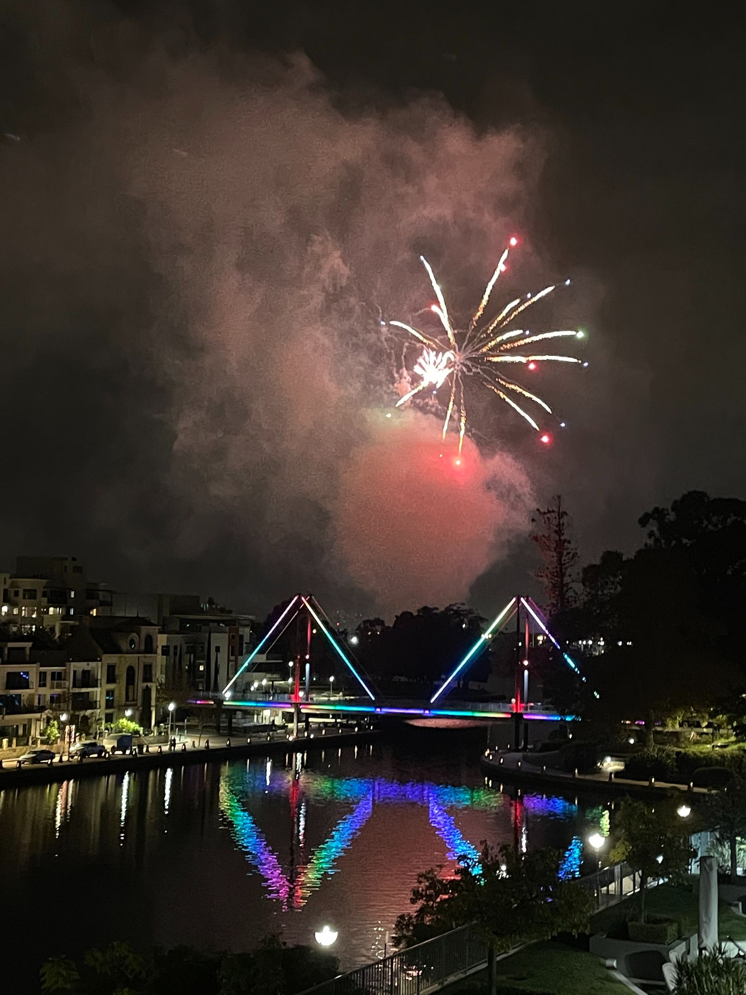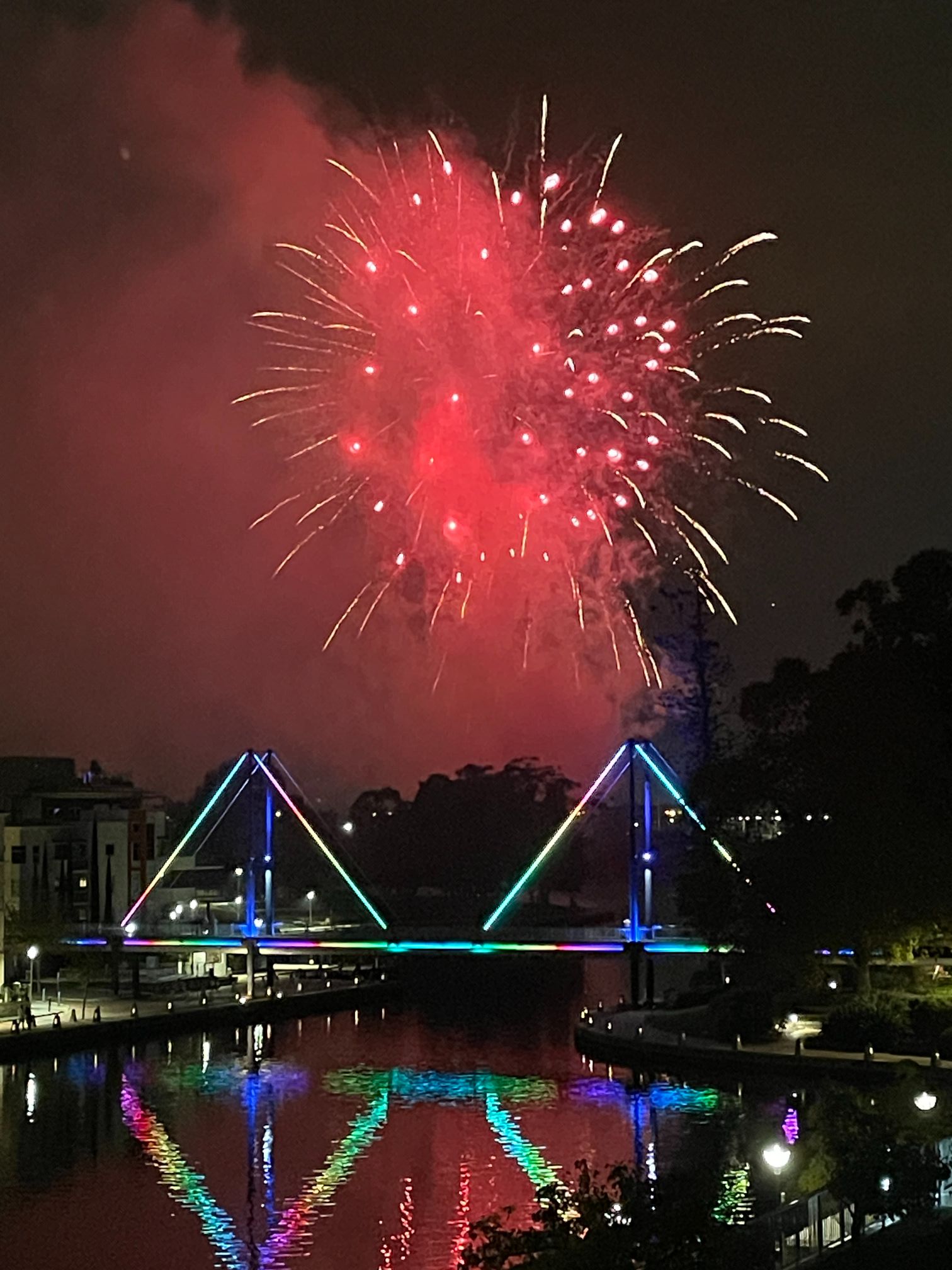 At 8.30pm, we’d just returned to our hotel room after dinner when the unmistakable, and very loud, sound of fireworks started up. We stepped out onto the balcony to watch. For the next eight minutes the display continued. It was coming from Optus Stadium, where we’d attended the footy game last night. I googled the reason for the fireworks. Believe it or not, they were part of an event listed as the WAIDA Gala. What’s WAIDA? The Western Australian Indian Dental Association. Who ever knew dentists could be so much fun!
