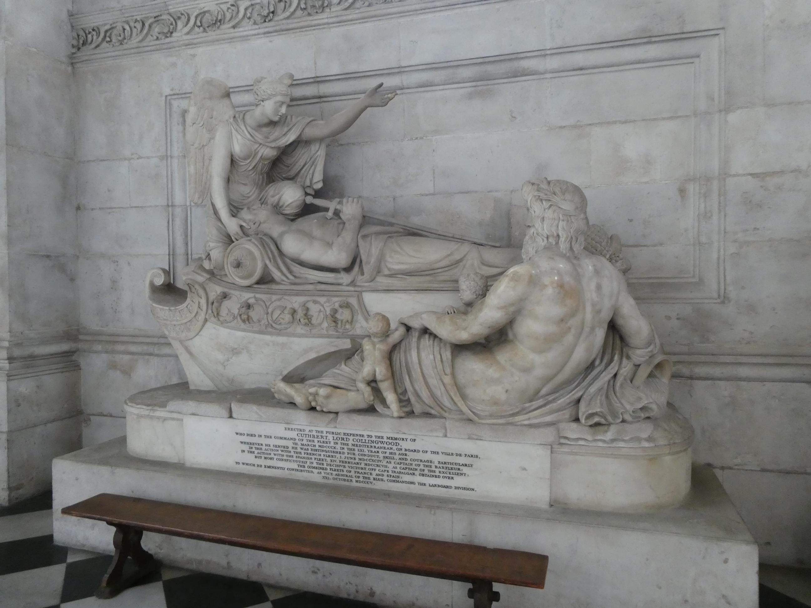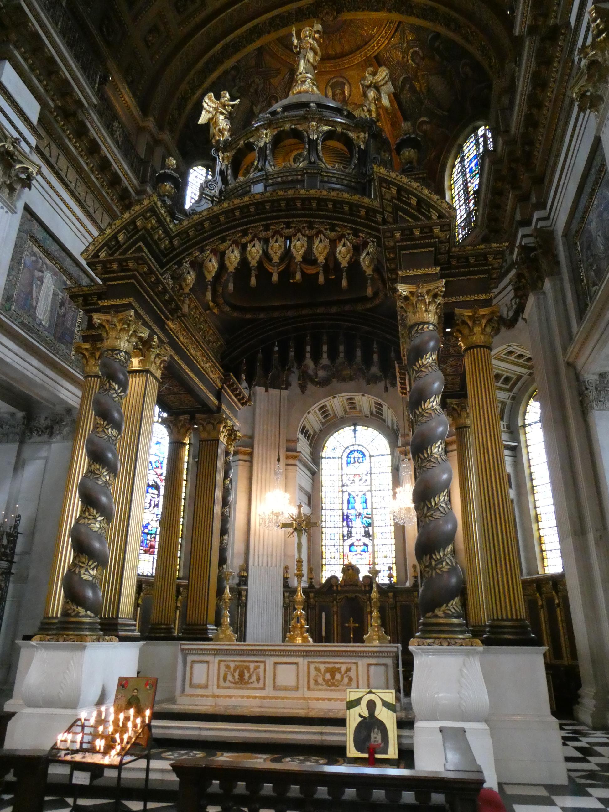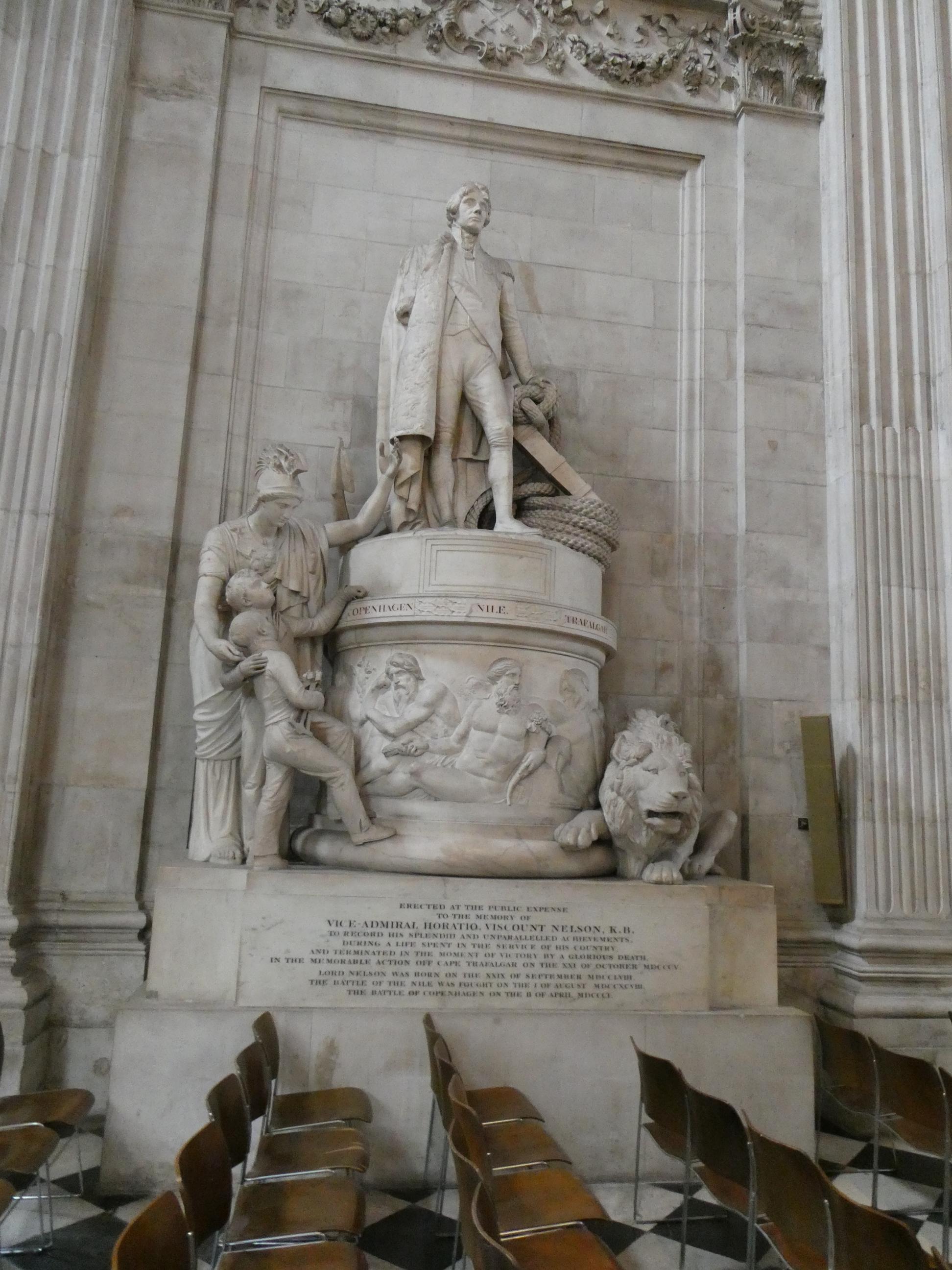 We entered the cathedral and took the free Highlights tour that was offered to us. Our guide, Brian, began by recounting the history of the cathedral on this site, including the earlier ones that had been destroyed by fire or, in one instance, by Viking raiders. We learned how Christopher Wren, a mathematician had designed the dome and done away with the spire which had adorned earlier versions of St Paul’s. Brian told us that most of the ornate work and the sculptures adorning the interior of the cathedral had been added during the Victorian era. I guess we weren’t surprised to hear that. Brian also extolled the virtues of the Duke of Wellington as we sat adjacent to his very large, ornate tomb. We struggled to hear all that Brian was telling us because he was competing with a choir, orchestra and, at times, an organist preparing for the VE Day service soon to follow. As much as we wanted to hear what Brian was saying, I must admit that it was wonderful to hear music filling this sacred space. We ended our visit in the crypt, where many famous Britons were laid to rest. We saw the memorials to Lawrence of Arabia, Florence Nightingale and the painter J M W Turner. The most imposing tomb in the crypt is that of Admiral Nelson, commander of the British navy at the Battle of Trafalgar.