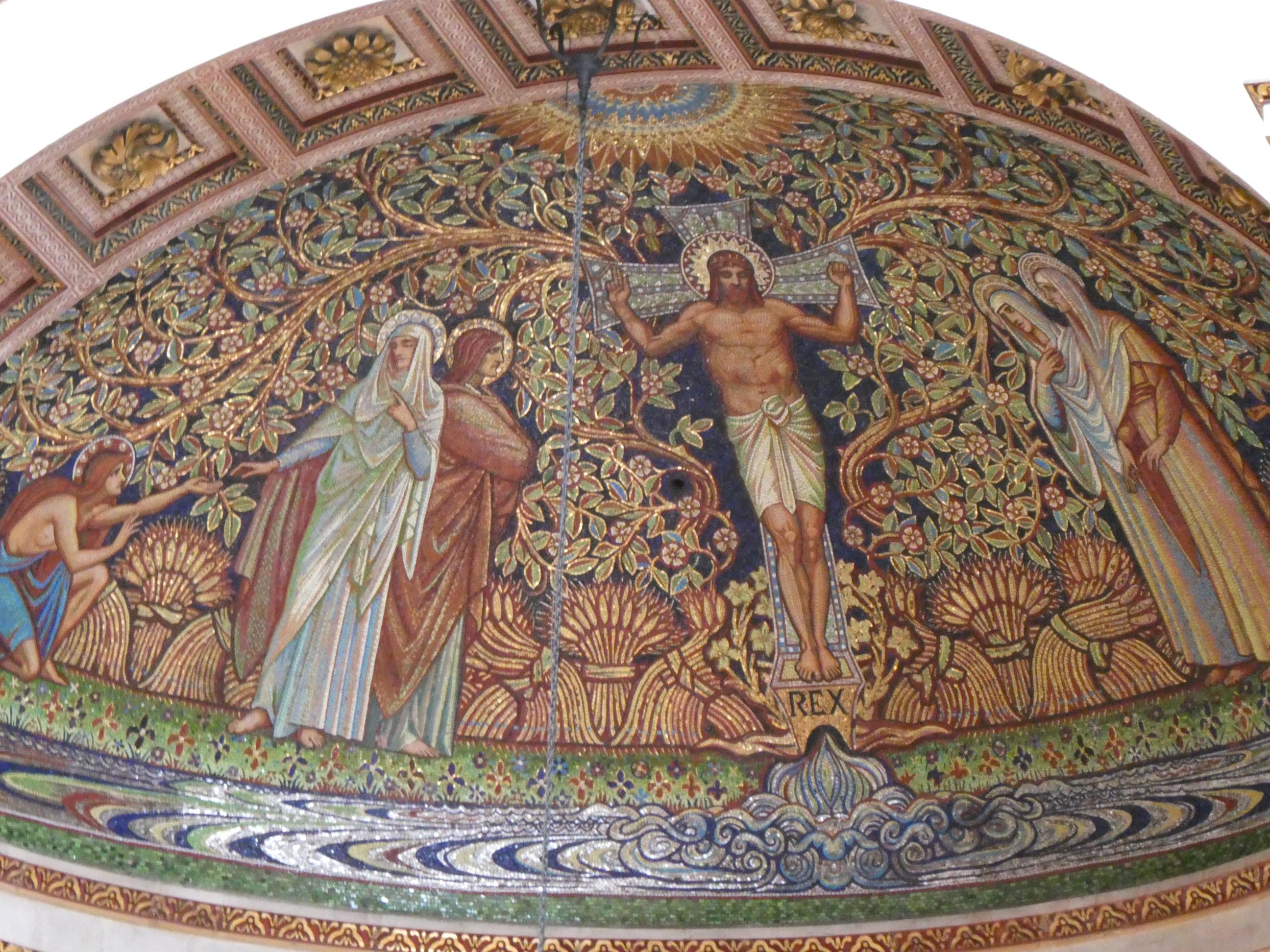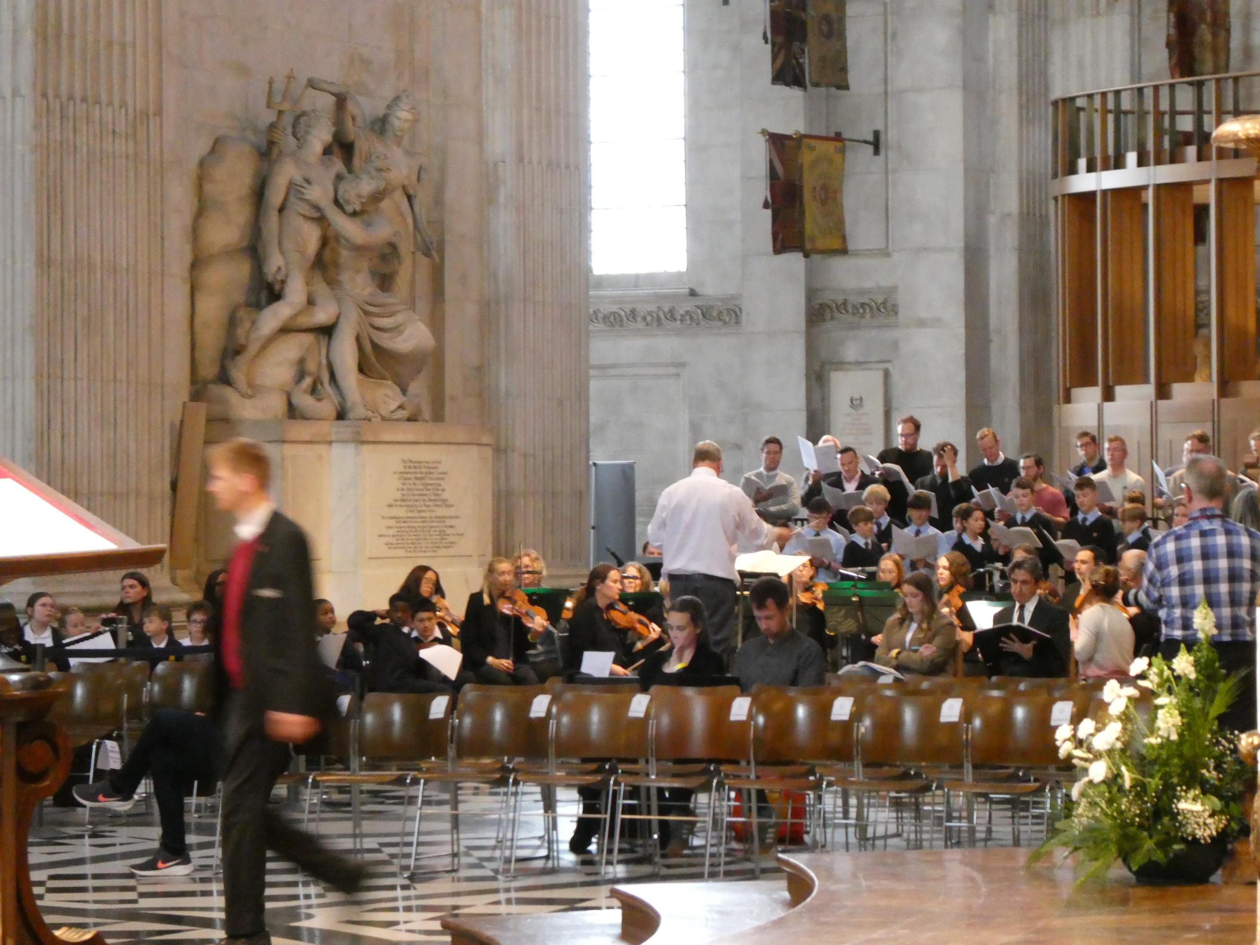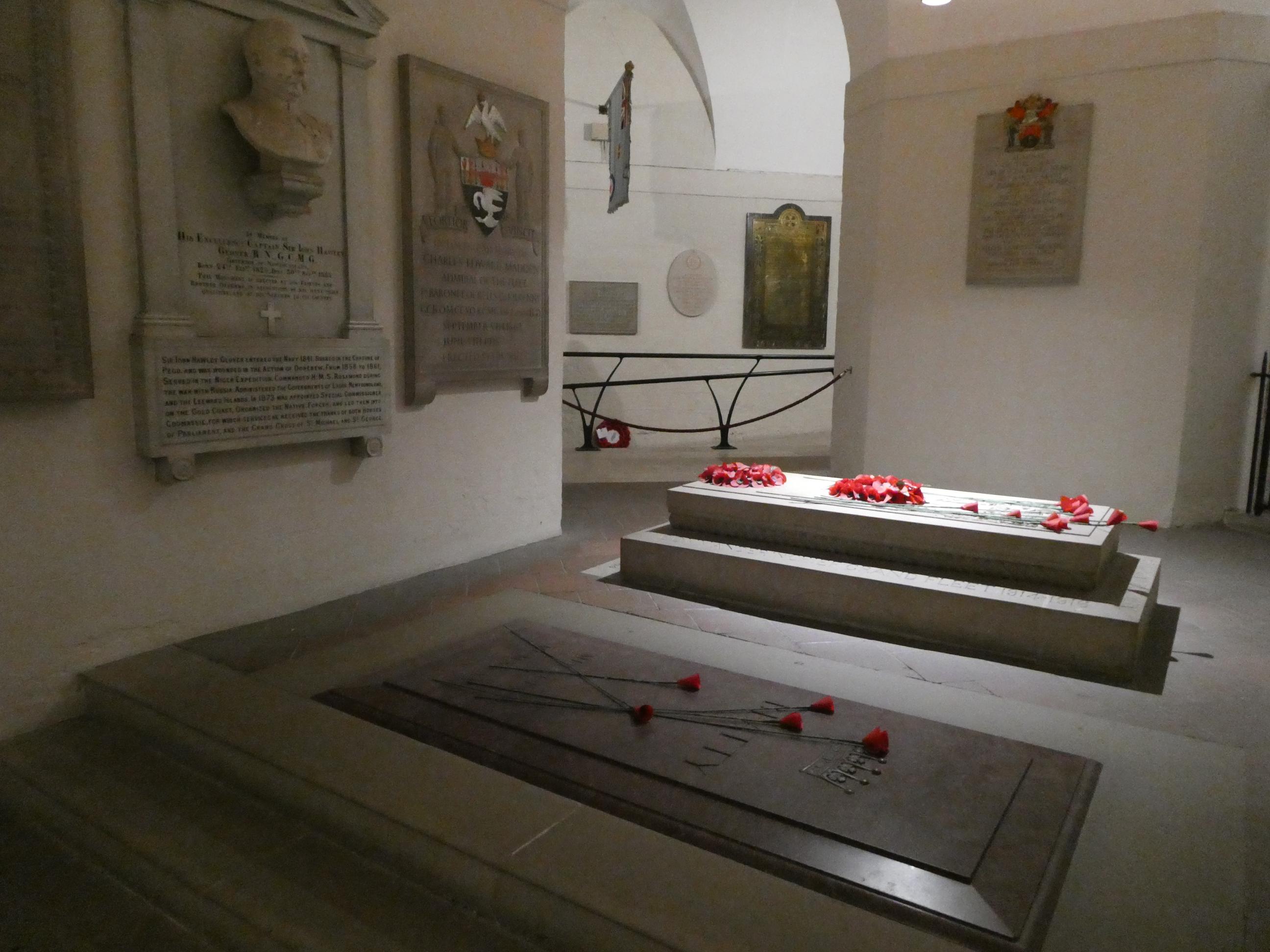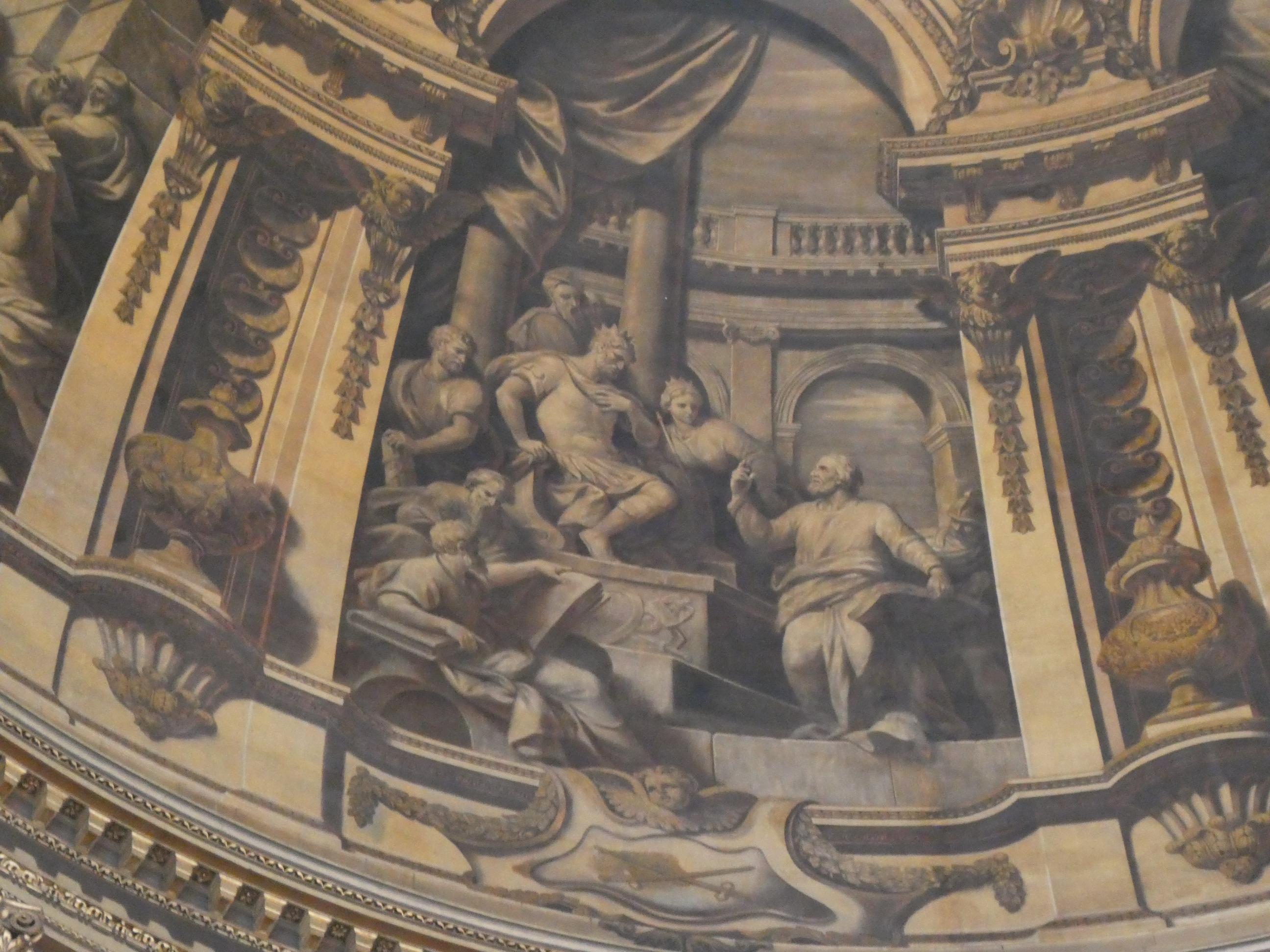 We entered the cathedral and took the free Highlights tour that was offered to us. Our guide, Brian, began by recounting the history of the cathedral on this site, including the earlier ones that had been destroyed by fire or, in one instance, by Viking raiders. We learned how Christopher Wren, a mathematician had designed the dome and done away with the spire which had adorned earlier versions of St Paul’s. Brian told us that most of the ornate work and the sculptures adorning the interior of the cathedral had been added during the Victorian era. I guess we weren’t surprised to hear that. Brian also extolled the virtues of the Duke of Wellington as we sat adjacent to his very large, ornate tomb. We struggled to hear all that Brian was telling us because he was competing with a choir, orchestra and, at times, an organist preparing for the VE Day service soon to follow. As much as we wanted to hear what Brian was saying, I must admit that it was wonderful to hear music filling this sacred space. We ended our visit in the crypt, where many famous Britons were laid to rest. We saw the memorials to Lawrence of Arabia, Florence Nightingale and the painter J M W Turner. The most imposing tomb in the crypt is that of Admiral Nelson, commander of the British navy at the Battle of Trafalgar.