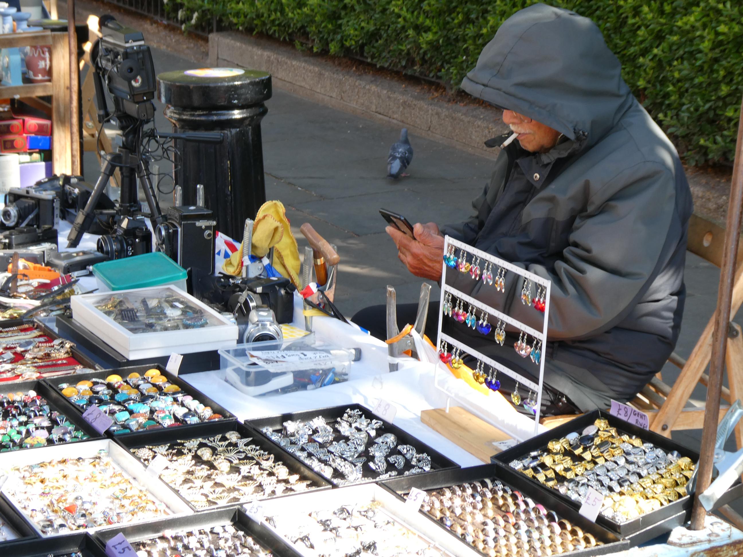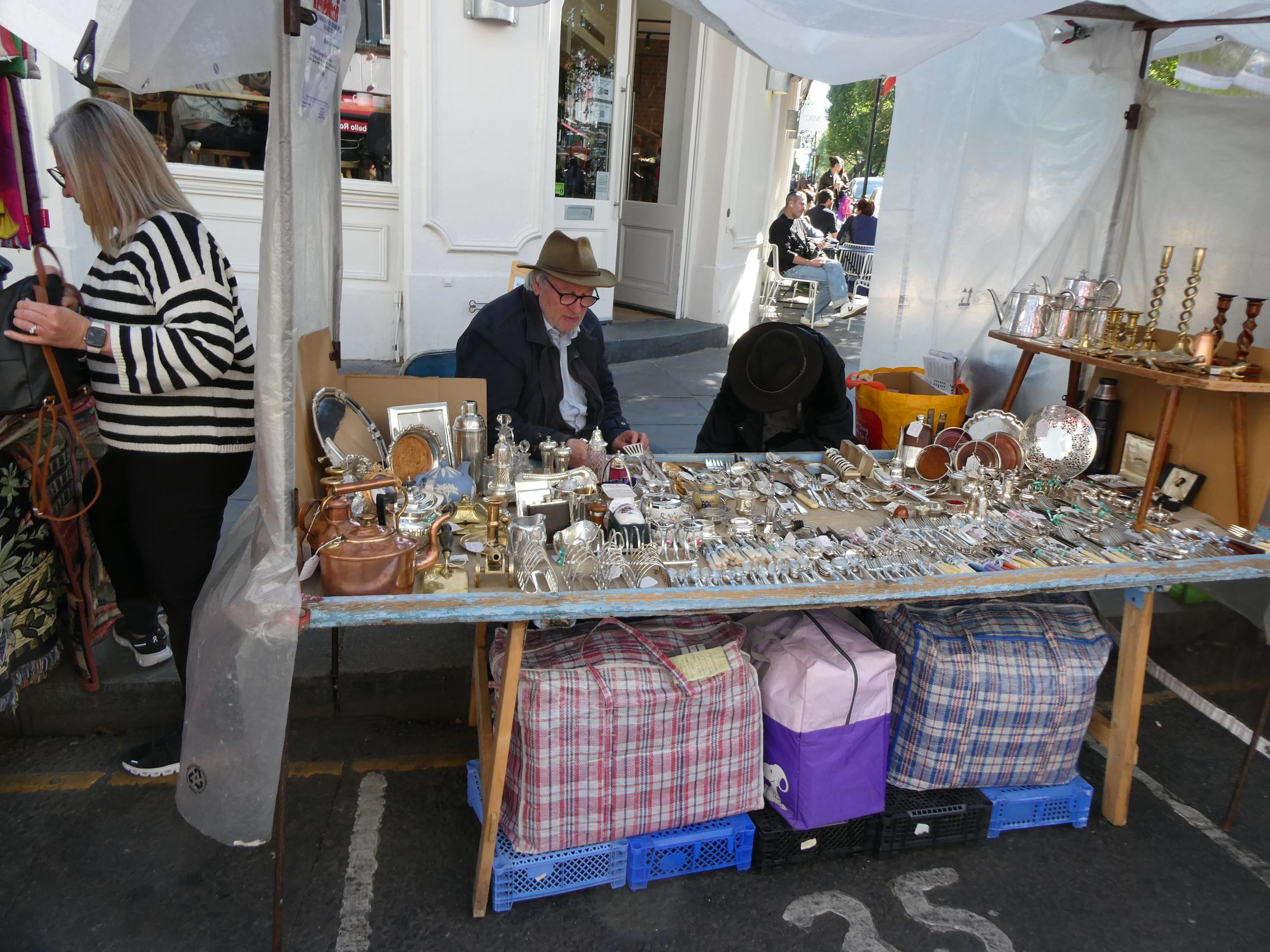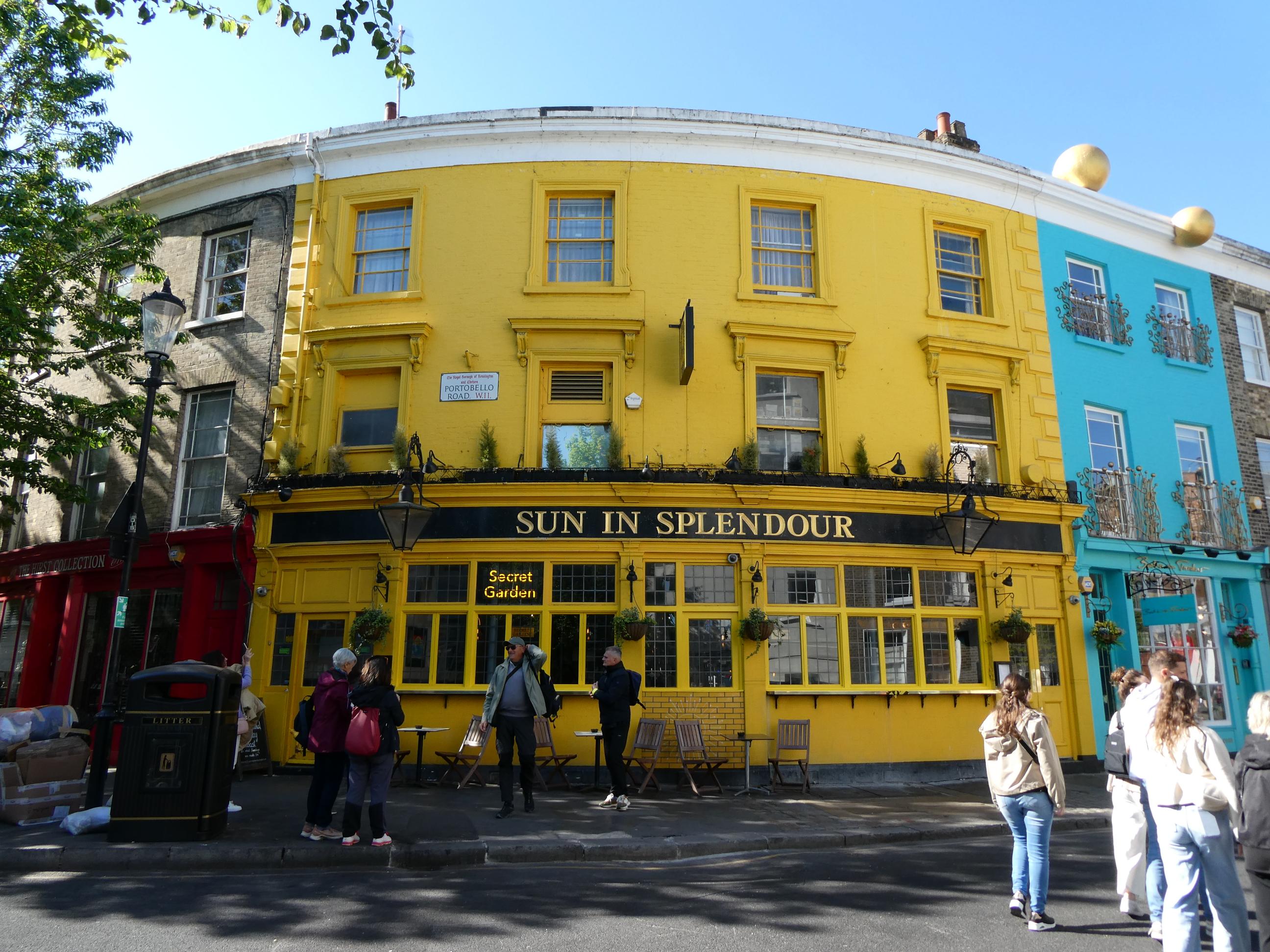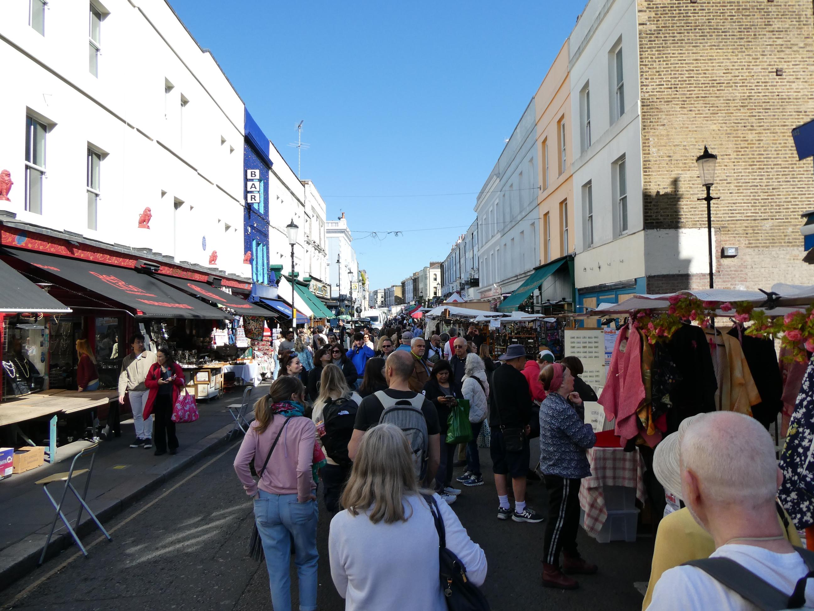 After breakfast, we walked to Portobello Road to spend some time at its famous market. On the way we passed a house bearing a blue plaque indicating that it was once the home of writer George Orwell. It immediately brought back memories of ‘Animal Farm’, which I remember studying in high school. Portobello Road Market in Notting Hill is one of London’s oldest street markets. On Saturdays the street becomes a vibrant sea of people squeezing past each other as they browse the many stalls and small shops in search of delicious foods, jewellery, antiques, vinyls, clothing, flowers and more. Many of the items for sale are pre-loved. The street was buzzing this morning in London’s current glorious weather. The sun was out and the sky was blue – the perfect day for a market like this. The market attracted a rich cultural mix of people. People everywhere were talking as we passed, and we heard many different languages spoken, as well as a broad range of British accents. We weren’t looking to buy anything, although Marg found a jumper she loved, and so did Cornelia. Nevertheless we really enjoyed the slow walk through the market and the people we came across. We also stopped for a brief photo opportunity at the bookstore made famous in the movie ‘Notting Hill’.