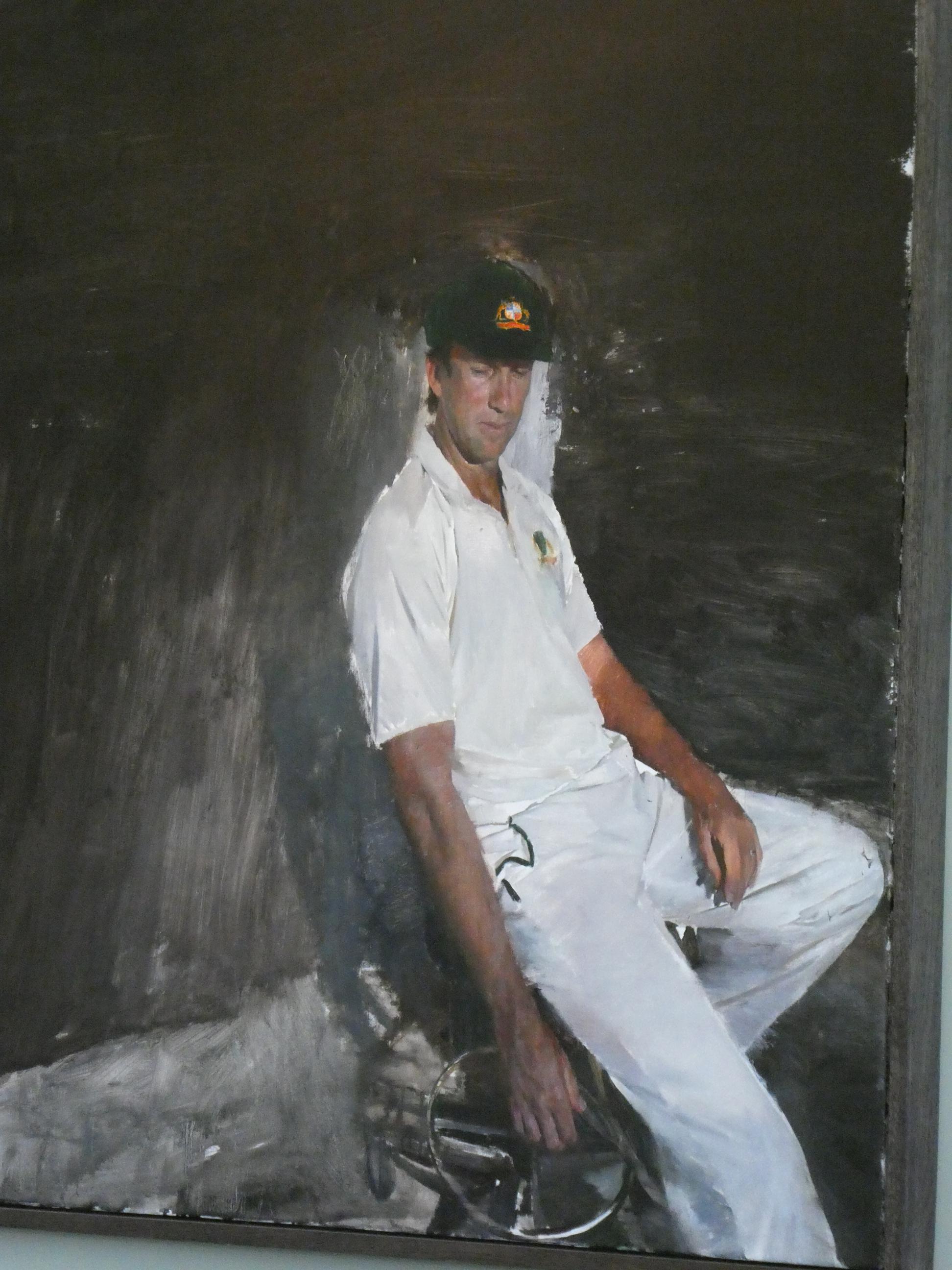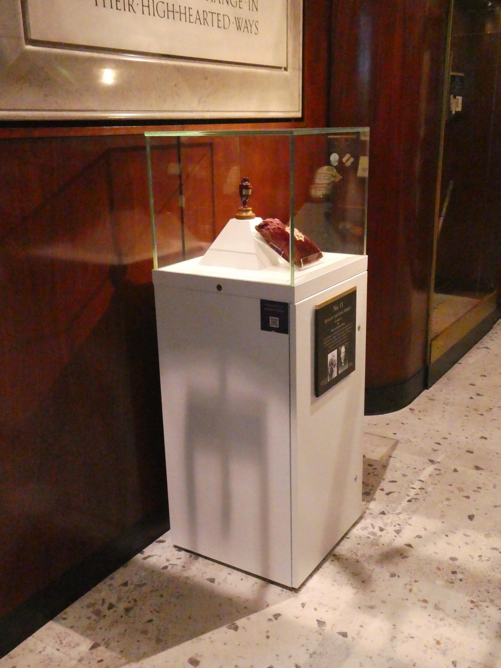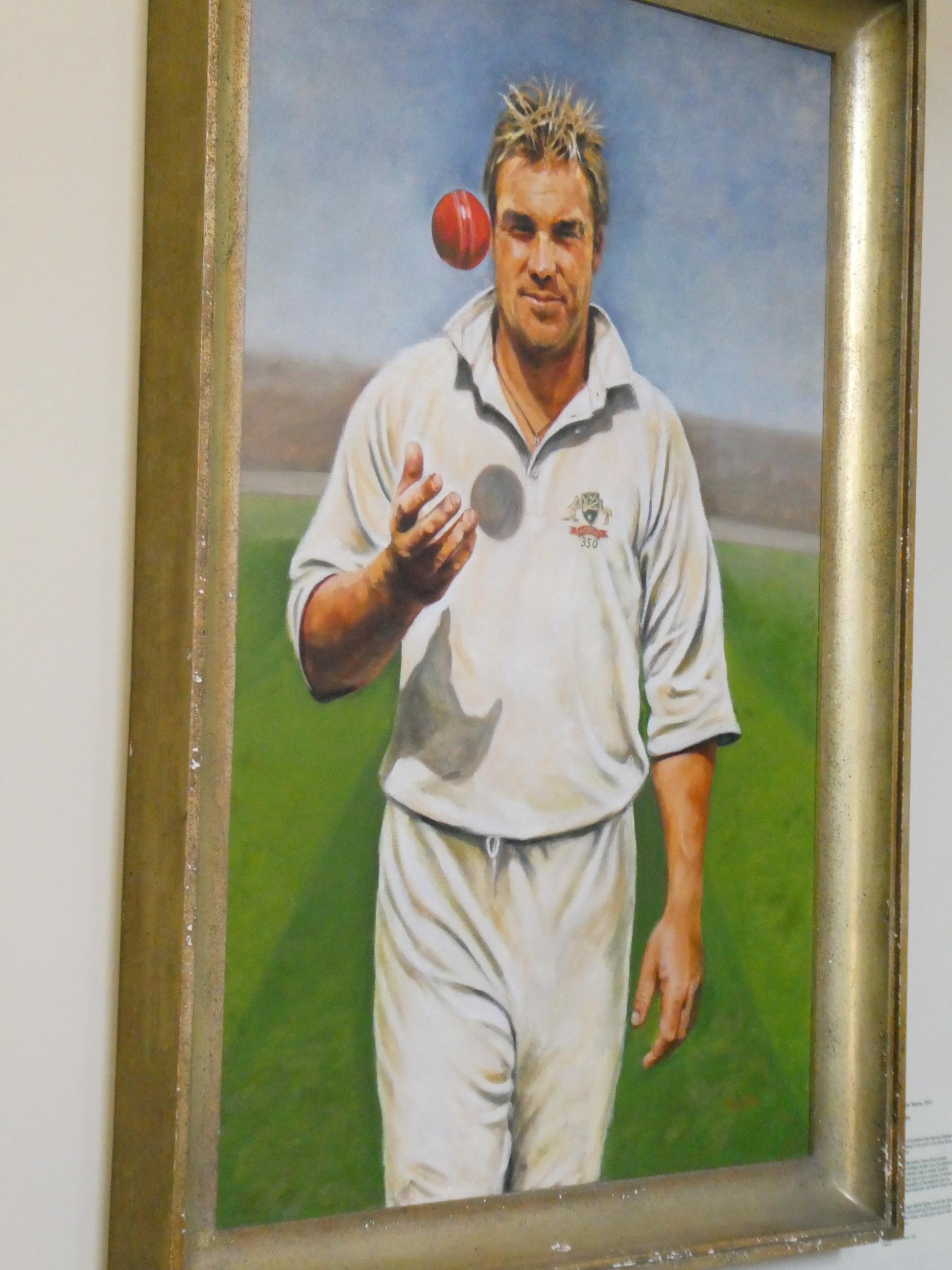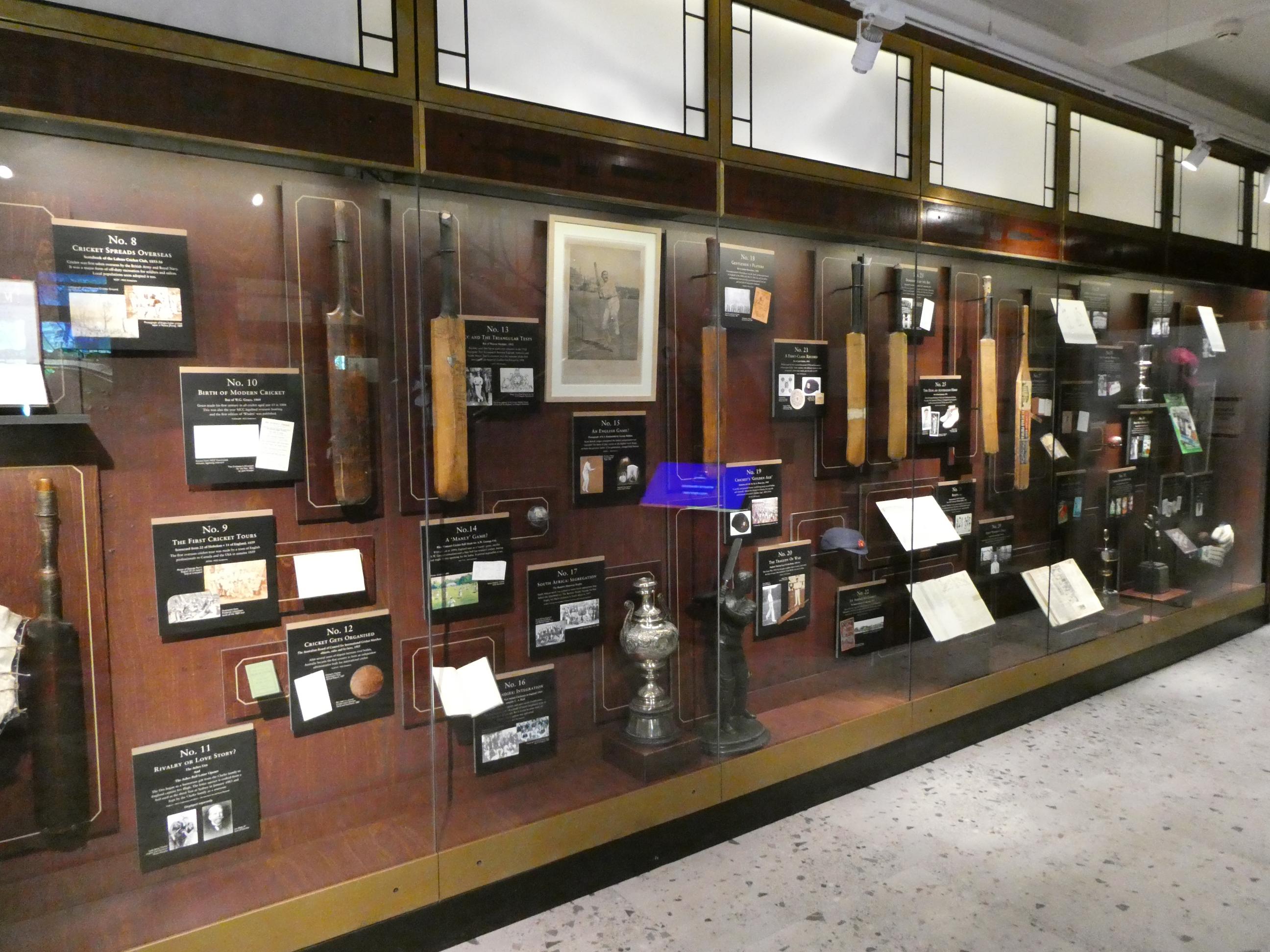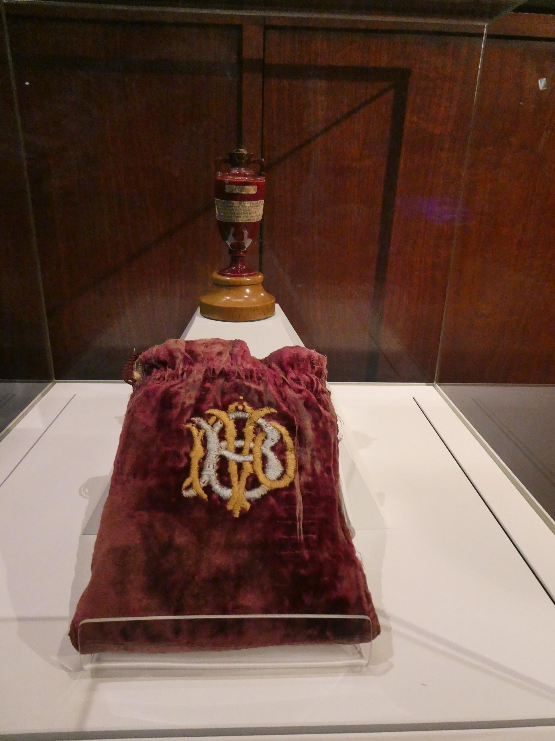Rod and I walked past the stairs where some of the Australian players turned to face the angry mob and into the Long Room. We both were surprised by the size of the room. It was much smaller and plainer than the wonderful Long Room we have at the MCG. We were there while it was being prepared for an event, so it was being set up with tables which normally would not be there, but it became apparent that it was not such a large space for hundreds of members to cram into to watch the players enter and leave the field. It did have some impressive artwork on the walls, notably the portraits of Glenn McGrath and Brian Lara that you can see here. The art work is changed on a regular basis. Most portraits are commissioned after a player has retired from the game, with the notable exception of Shane Warne, who our guide Neil spoke very fondly of. Apparently he was much loved by many at Lord’s. Next stop was the museum for a quick look at the Ashes urn. It’s good to know it’s currently in our possession, even though it is so fragile that it can never leave England. I was surprised by the simplicity of its display cabinet.