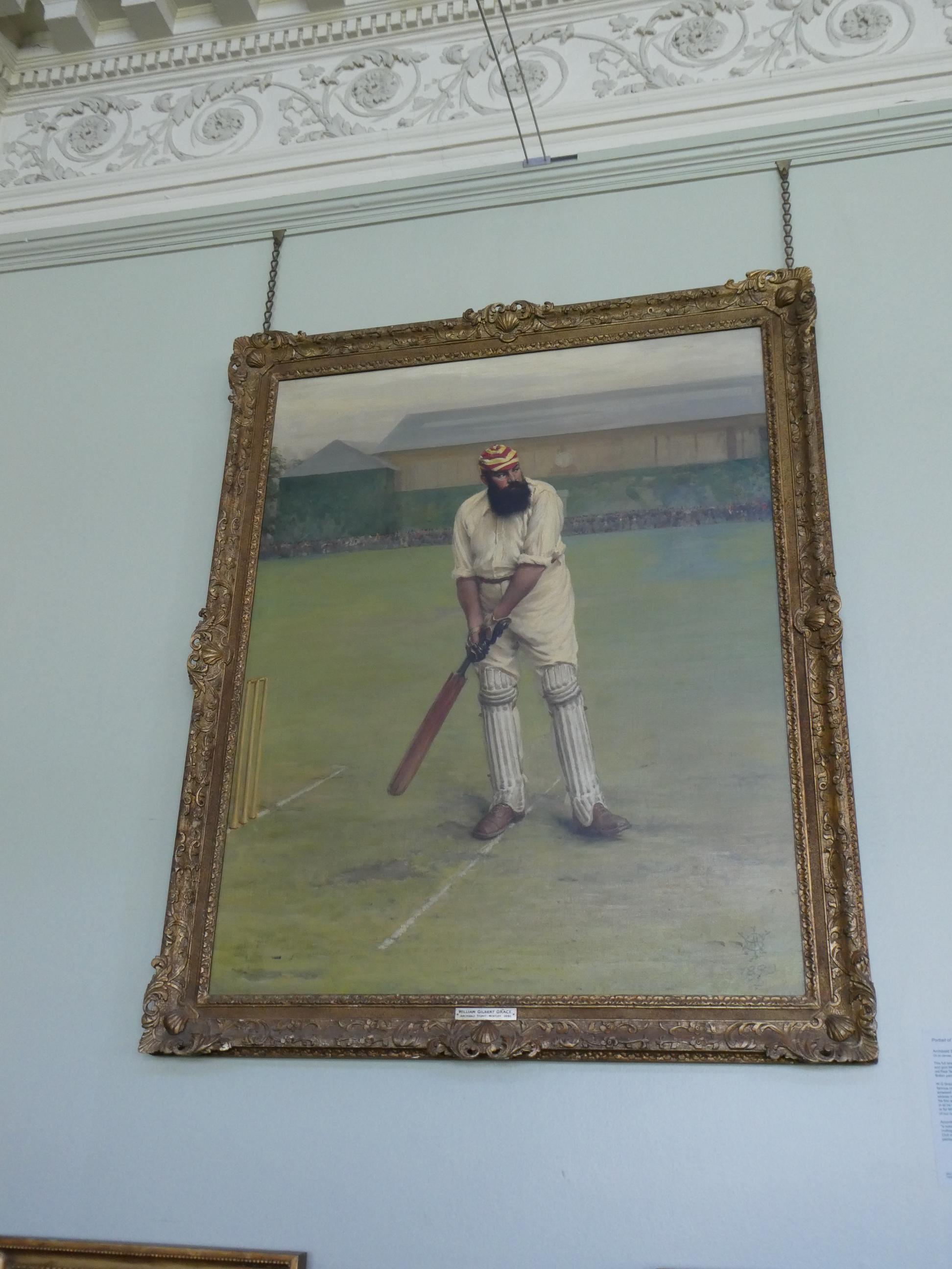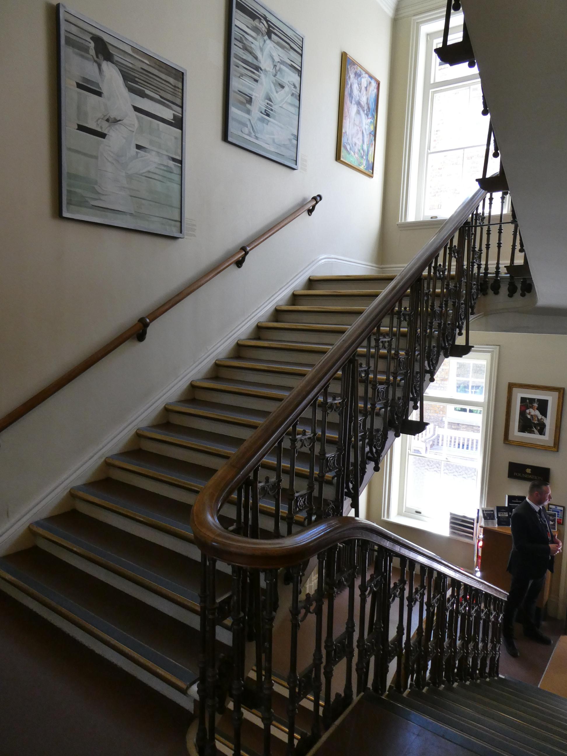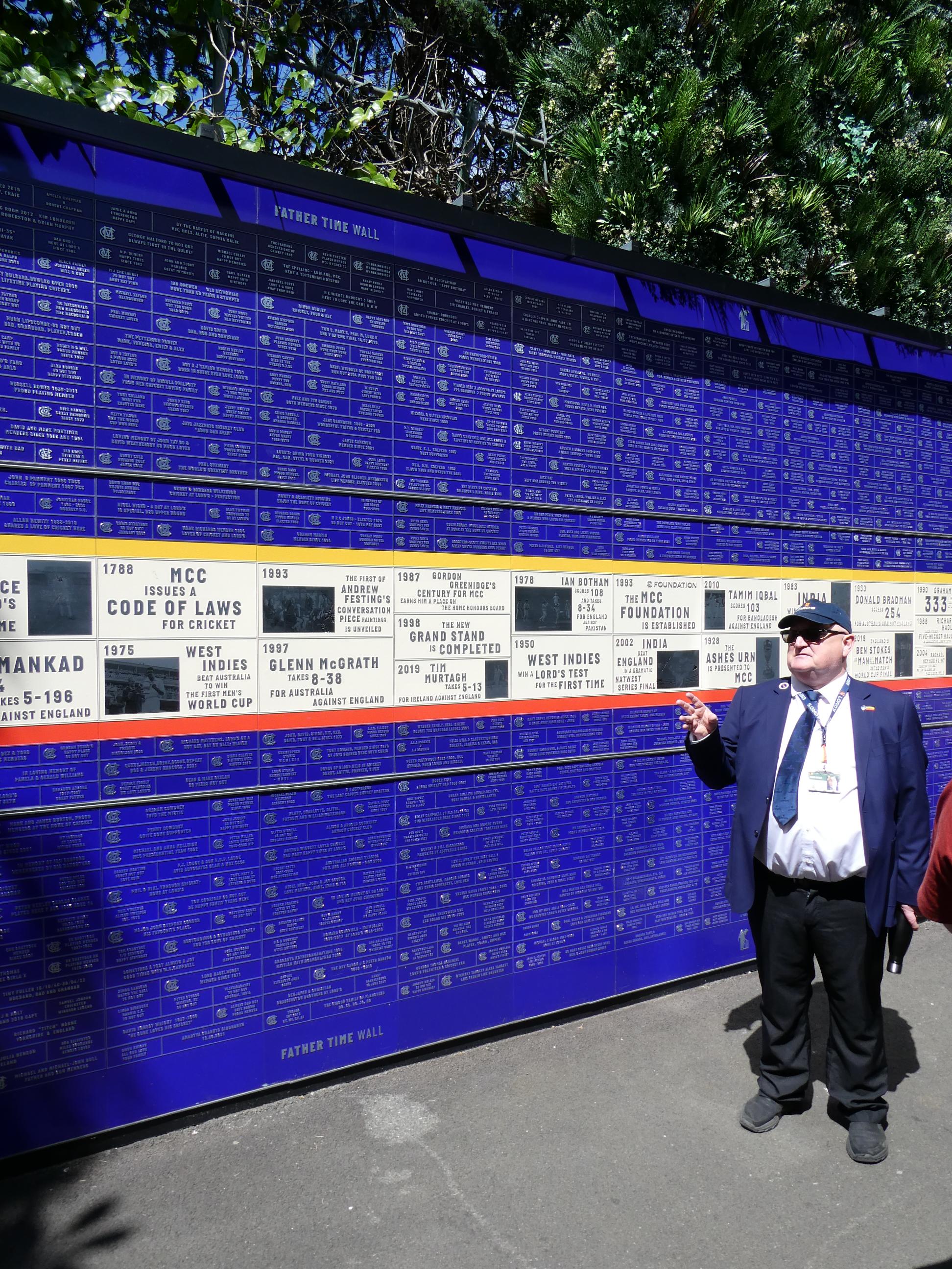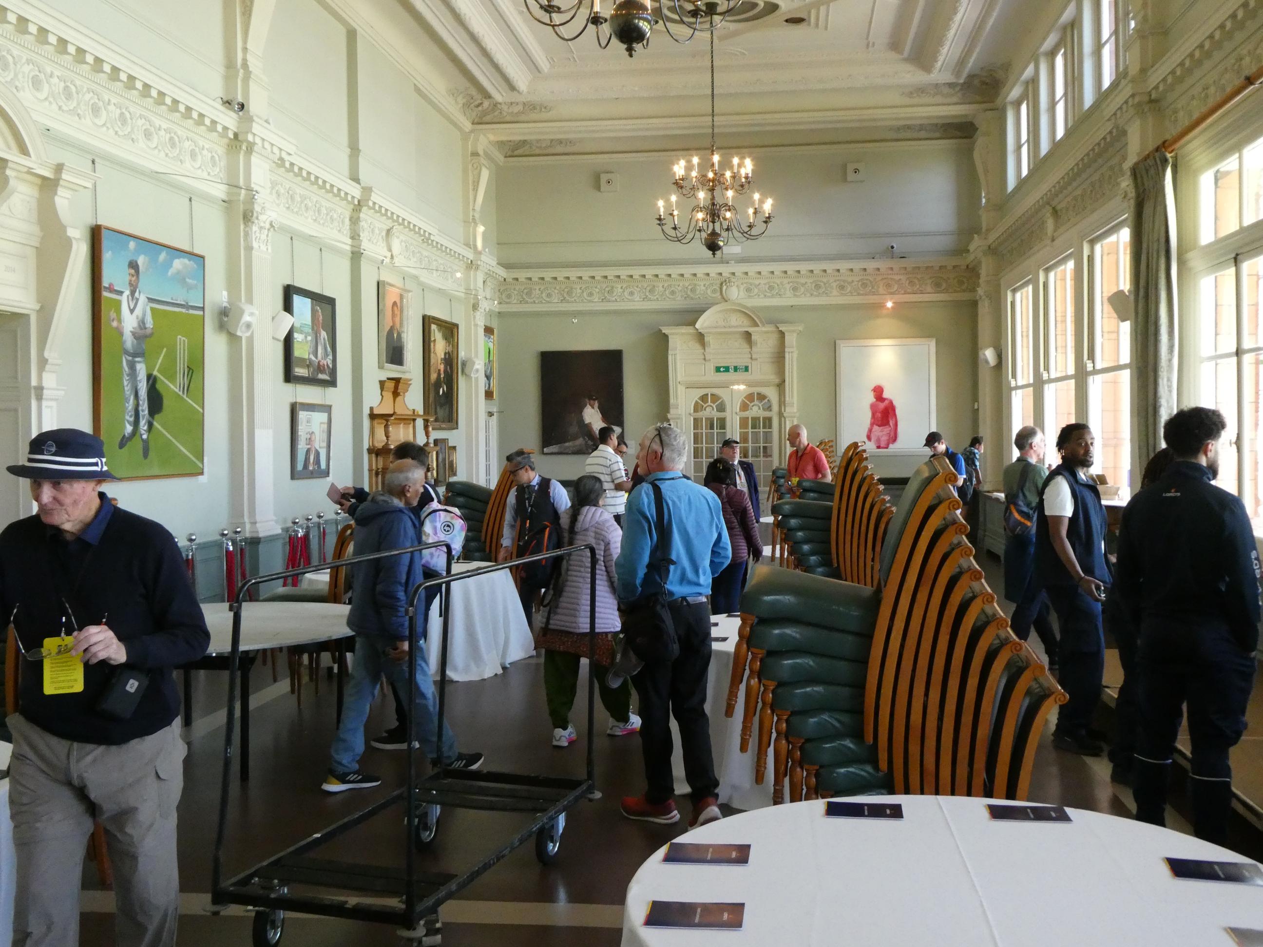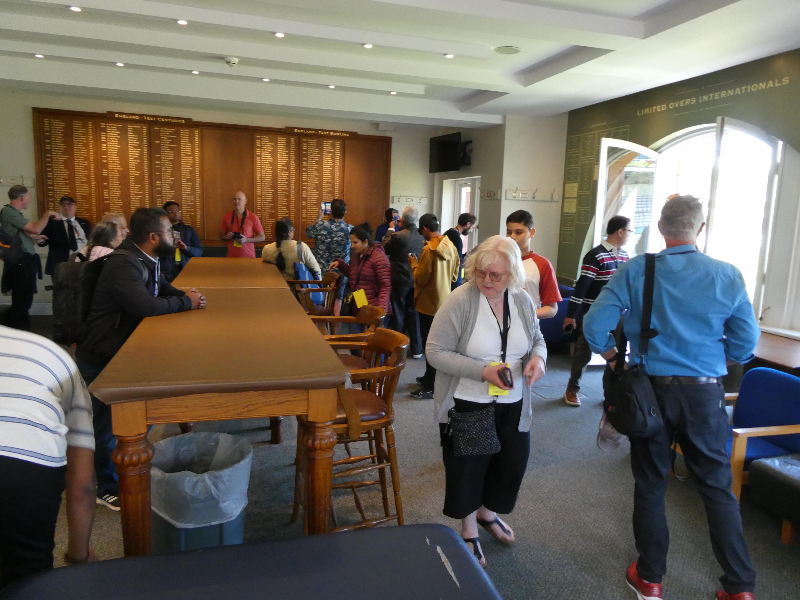 We walked to nearby Regent’s Park and ate lunch at a cafe. Rod and I took our leave and headed back to Lord’s Cricket Ground, which we had passed earlier. Marg, Cornelia and Ursula, who had joined us at Abbey Road, stayed on to enjoy a walk around the park. We arrived just as the tour was starting. Our tour guide, Neil from Newcastle, was a jolly man who not only told us the history of the ground and the people who played cricket there, but also entertained us with many witty anecdotes that the players he knew and loved had passed on to him. He identified the allegiances of the members of our group – some of us supported England, some India and some Australia, so he told stories about the players from those teams as he showed us around. Rod and I have loved cricket since we were little kids and played in the street with our friends. We both loved playing club cricket for many years. So, just like our visit to Abbey Road earlier in the day, this was a form of pilgrimage for us. Our first stop was the Members’ Pavilion and Long Room, made famous recently by the uproar that occurred there when the Australian players left the field for lunch after Alex Carey had stumped Jonny Bairstow when he negligently left his crease while the ball was still in play. As the Australian team made its way through the swarm of angry members towards its rooms, some hurled abuse and a few even made threats. The incident embarrassed Lord’s, and some members were even dismissed from the club for the way they responded.