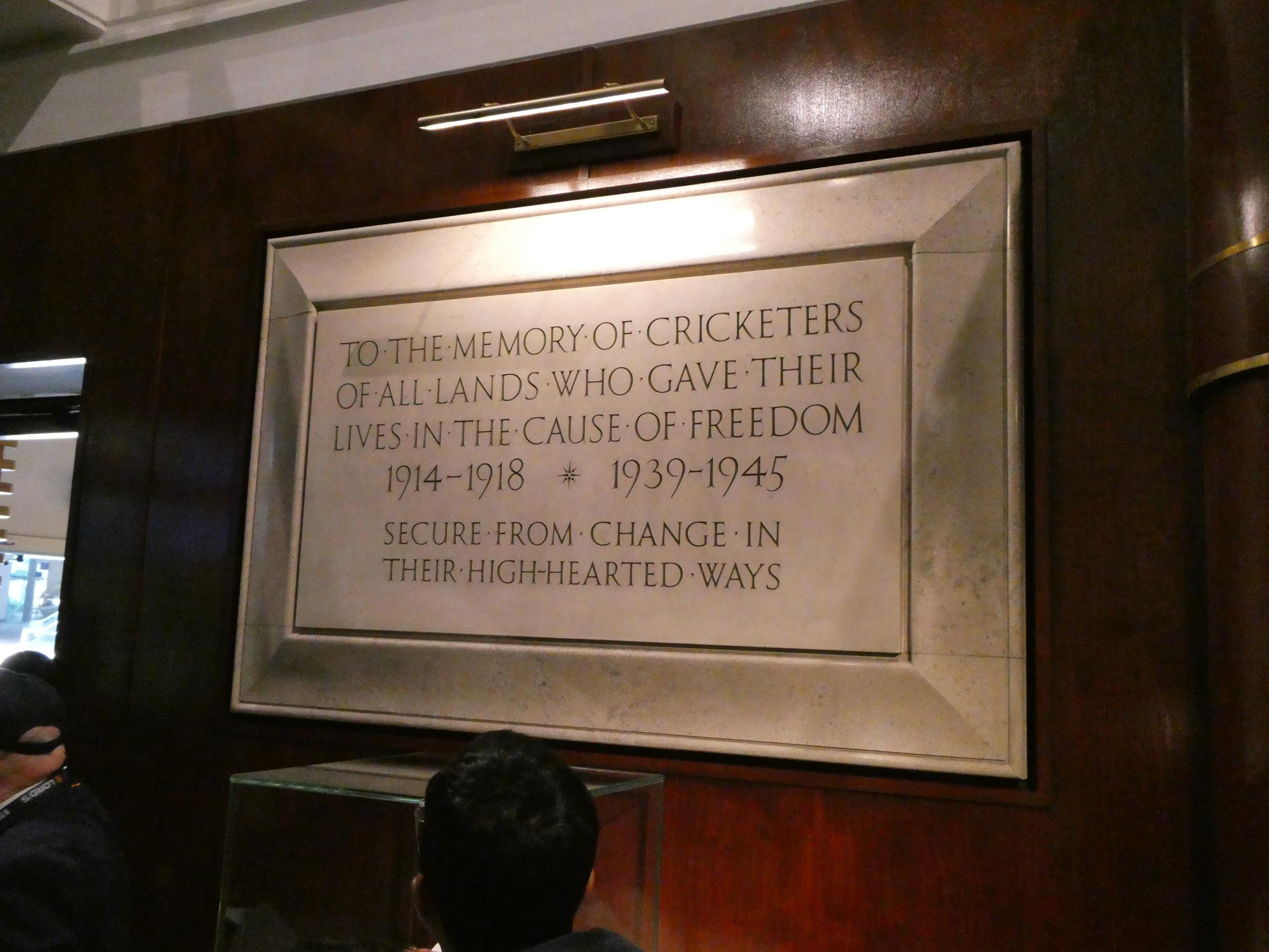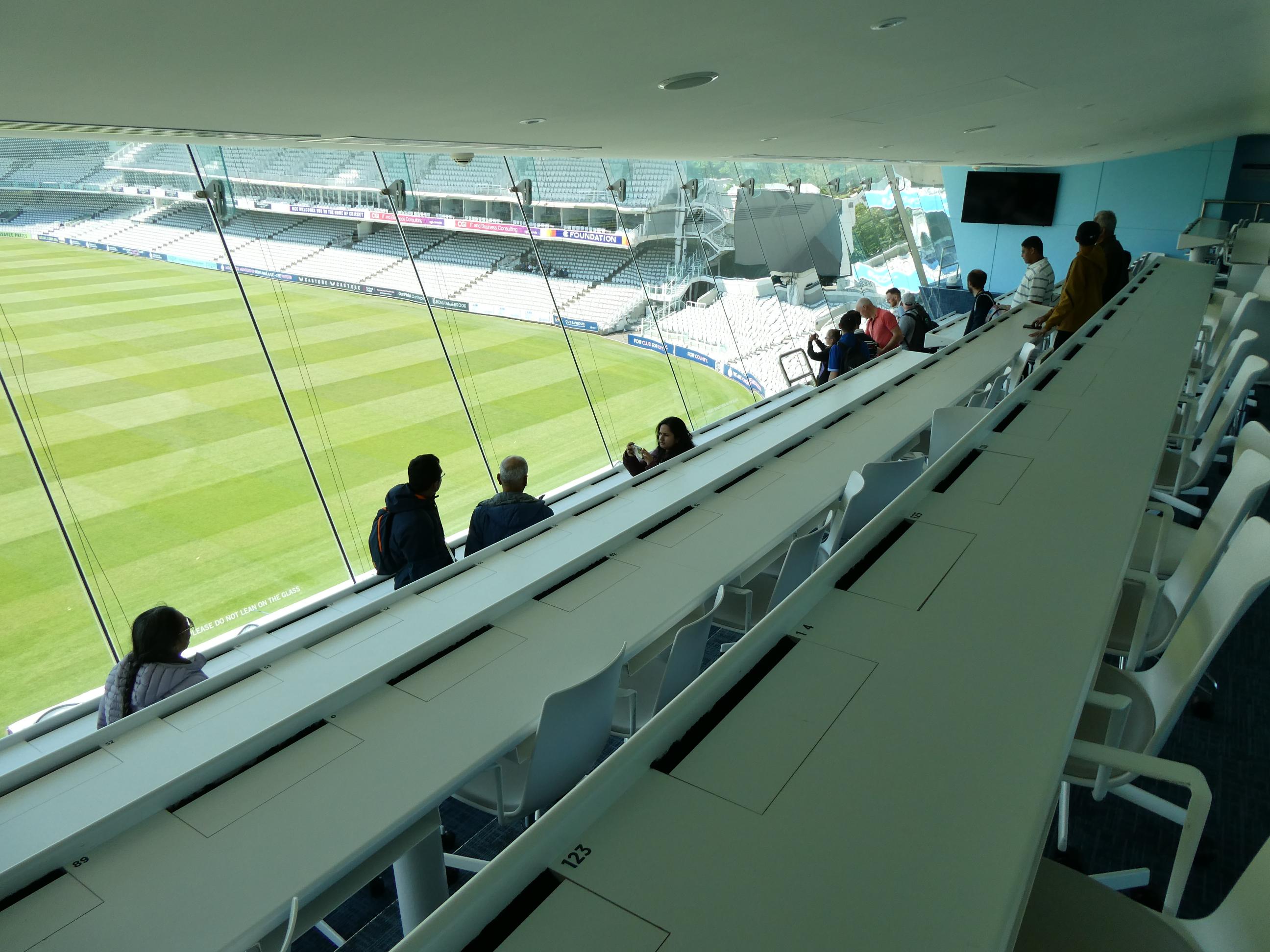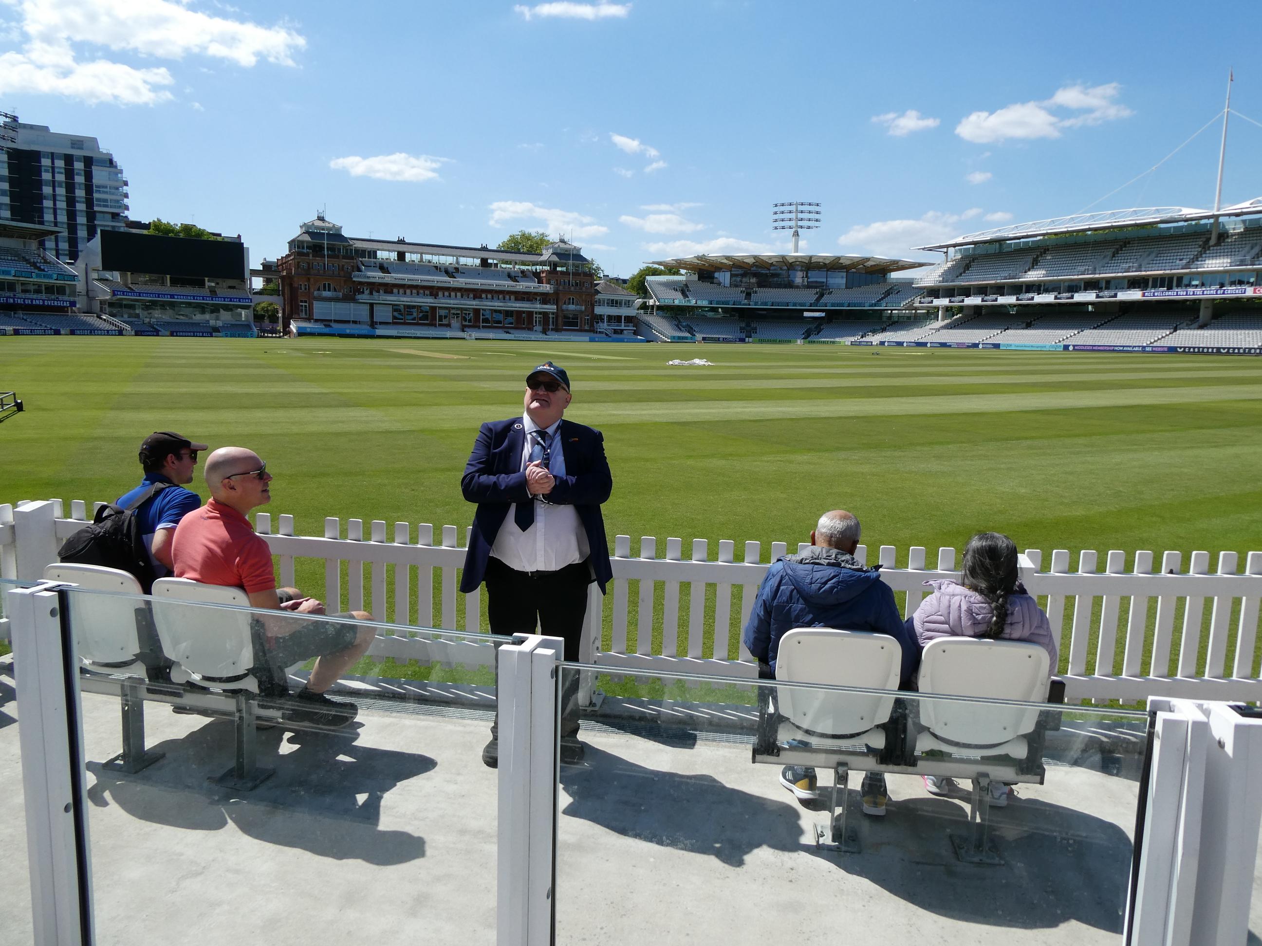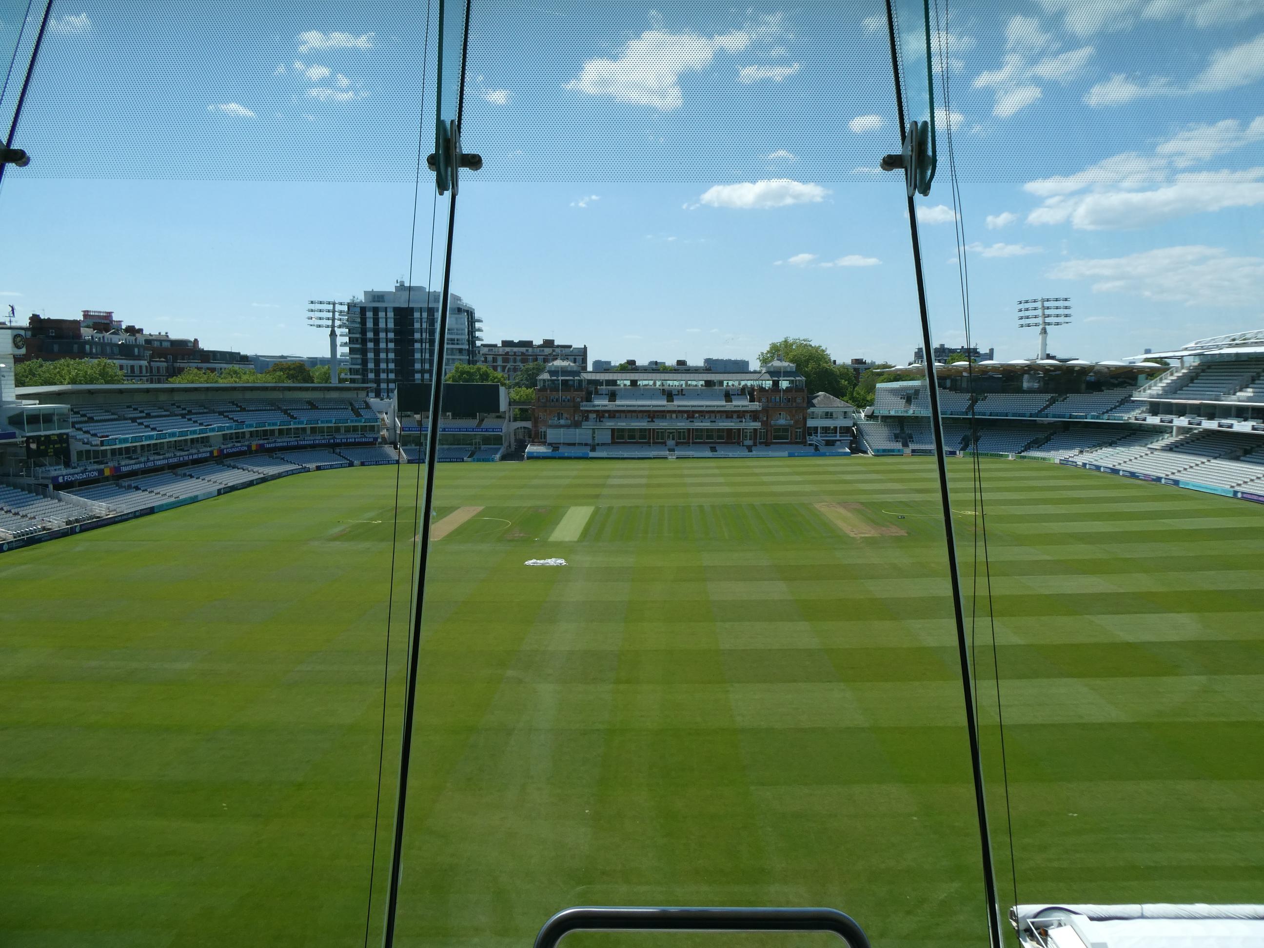 Neil walked us around the perimeter of the ground. On the way, I found a photo of a distant relative. Karl Nunes, who was the first man to captain the West Indies in Test cricket, is my third cousin two times removed. His mother was a Brandon, just as my great grandmother was. Neil led us up the 82 steps to the media centre, sometimes referred to as the ‘spaceship’. The view from up there is superb. I’d love to watch a game from up there. Lord’s is famous for the slope of the ground. It falls away by eight feet (about two and a half metres) from one side of the ground to the other, and the slope is quite visible when viewed from the media centre. From there we had a wonderful view across the ground to the Members’ Pavilion. Neil told us that because its heritage listing was classified so high, very little could be done to alter it inside or out, hence the simplicity of its players’r rooms. We finished our tour down by the fence, looking out over the hallowed turf. I can’t wait for the next Lord’s Ashes Test. I’ll view it through a different lens, I’m sure.