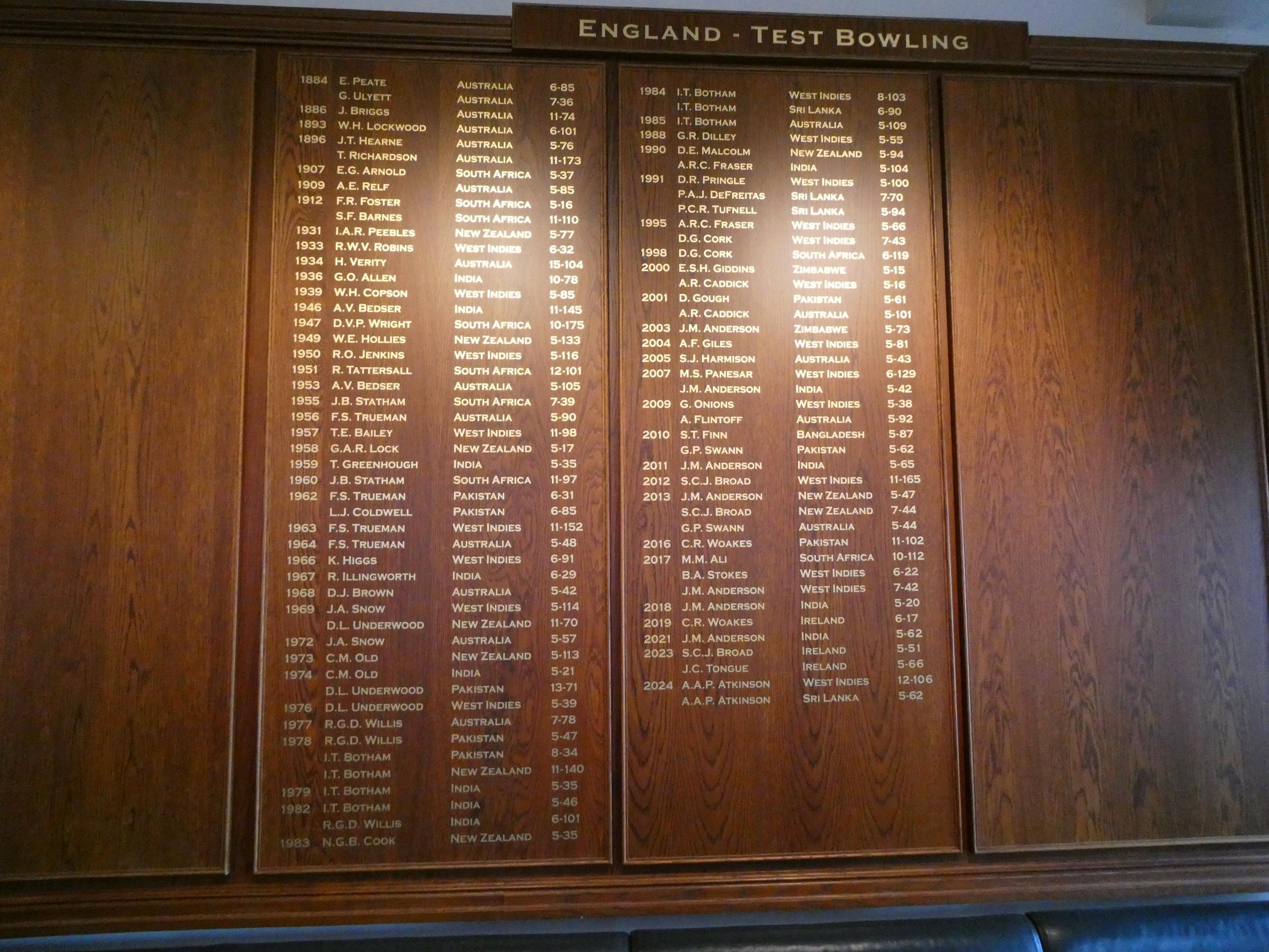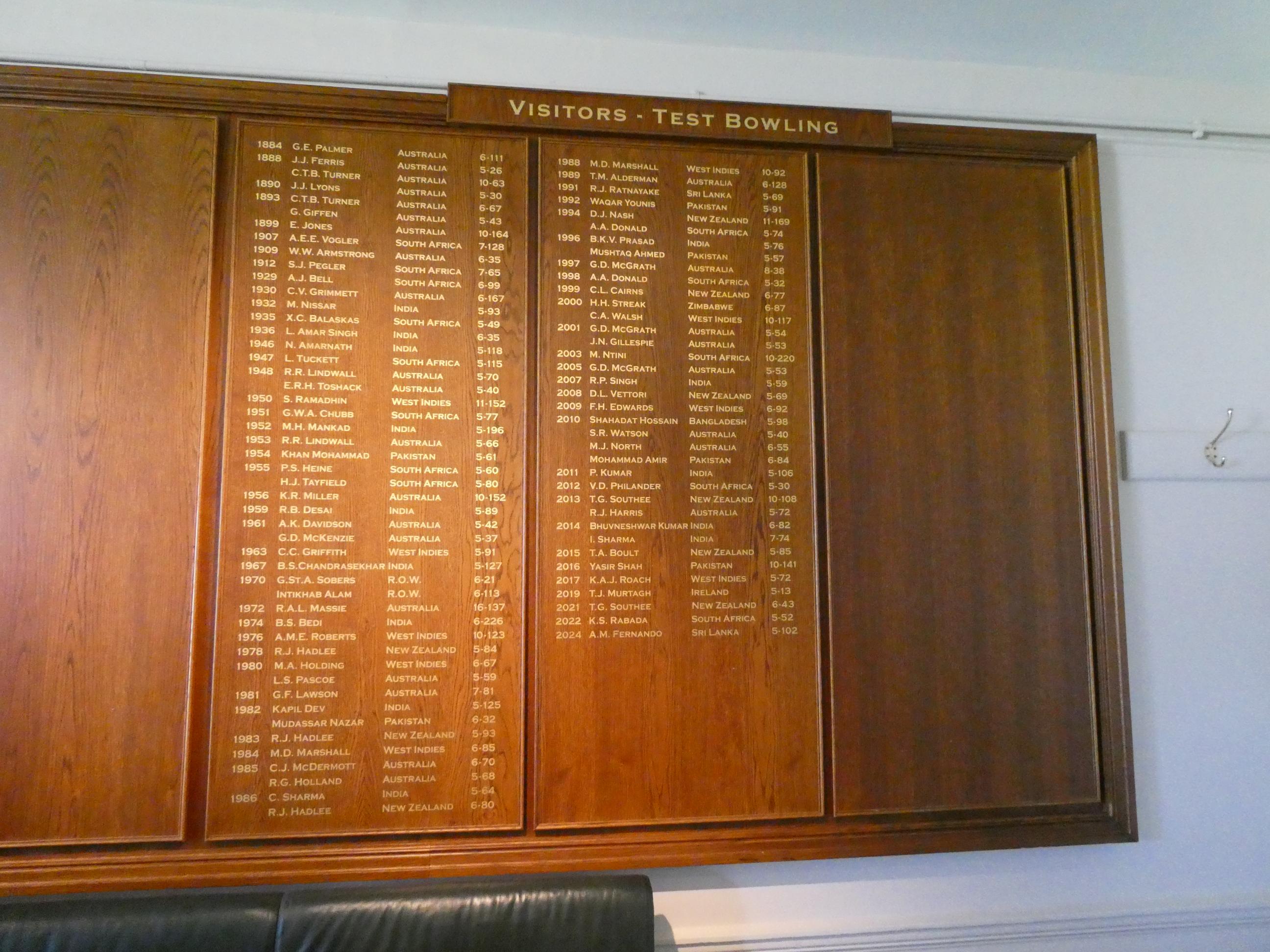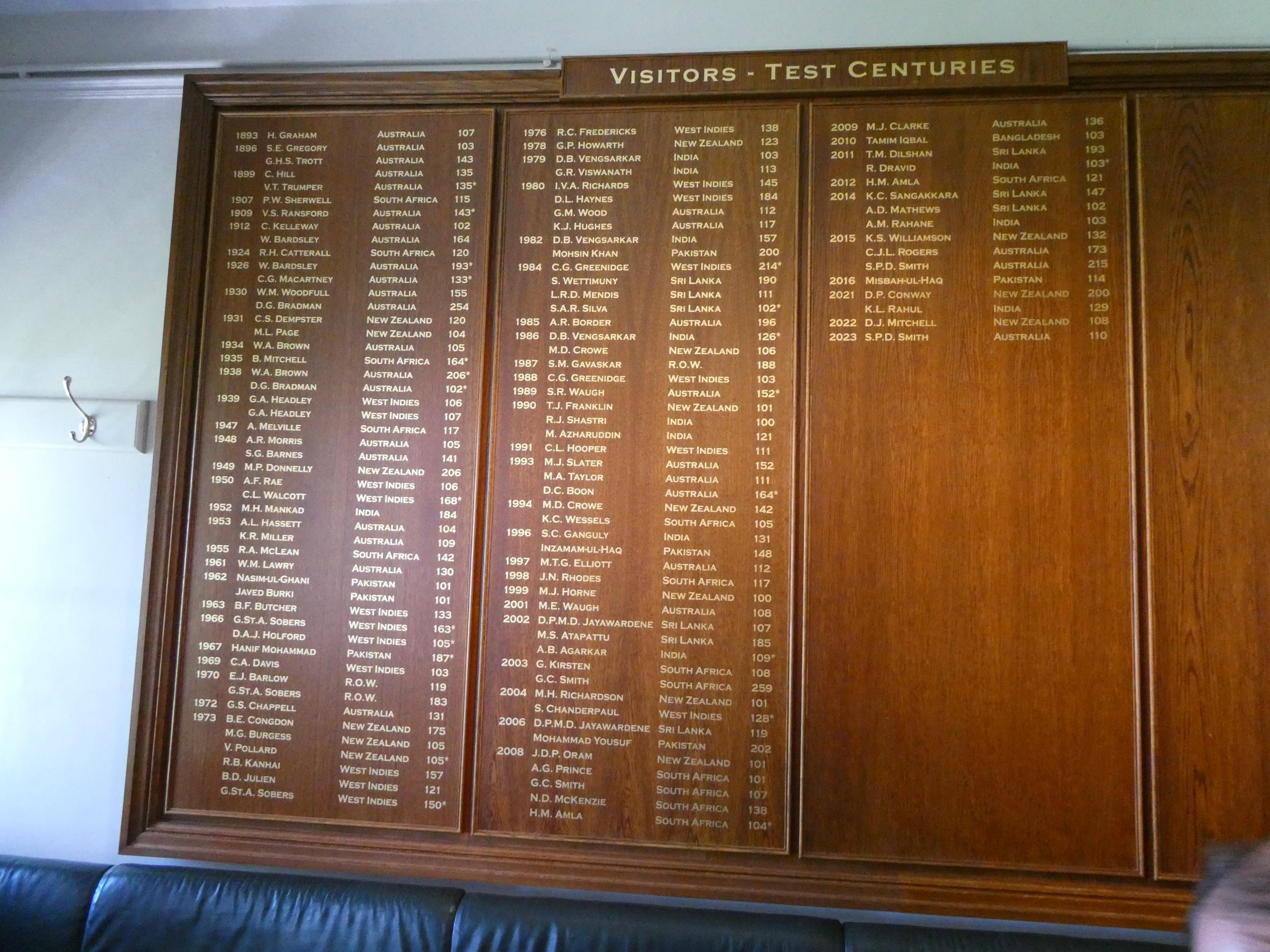 Neil took us into the visiting players’s room. Rod and I were surprised by how basic it was. Essentially it was just cushioned bench seating around the walls with coat hooks above some of the seating and a table and a few chairs in the centre of the room. I expected much more inviting furnishing and items would be on hand for the disposal of the great touring cricketers of the world. On the walls are the famous honour boards bearing the names of every visiting batsman who has scored a Test century here and every bowler who has captured five or more wickets in an innings. The list of names is impressive, though the boards themselves are quite unremarkable. I think some of the honour boards at Ivanhoe Grammar, where I taught for thirty years, were far more impressive than these. Rod and I posed for a photo on the famous players’ balcony, and were quite surprised to learn that only four people can be out there at a time. The English room was no different to that of the visitors’ room. Very plain, and again only its honour boards were a point of interest.