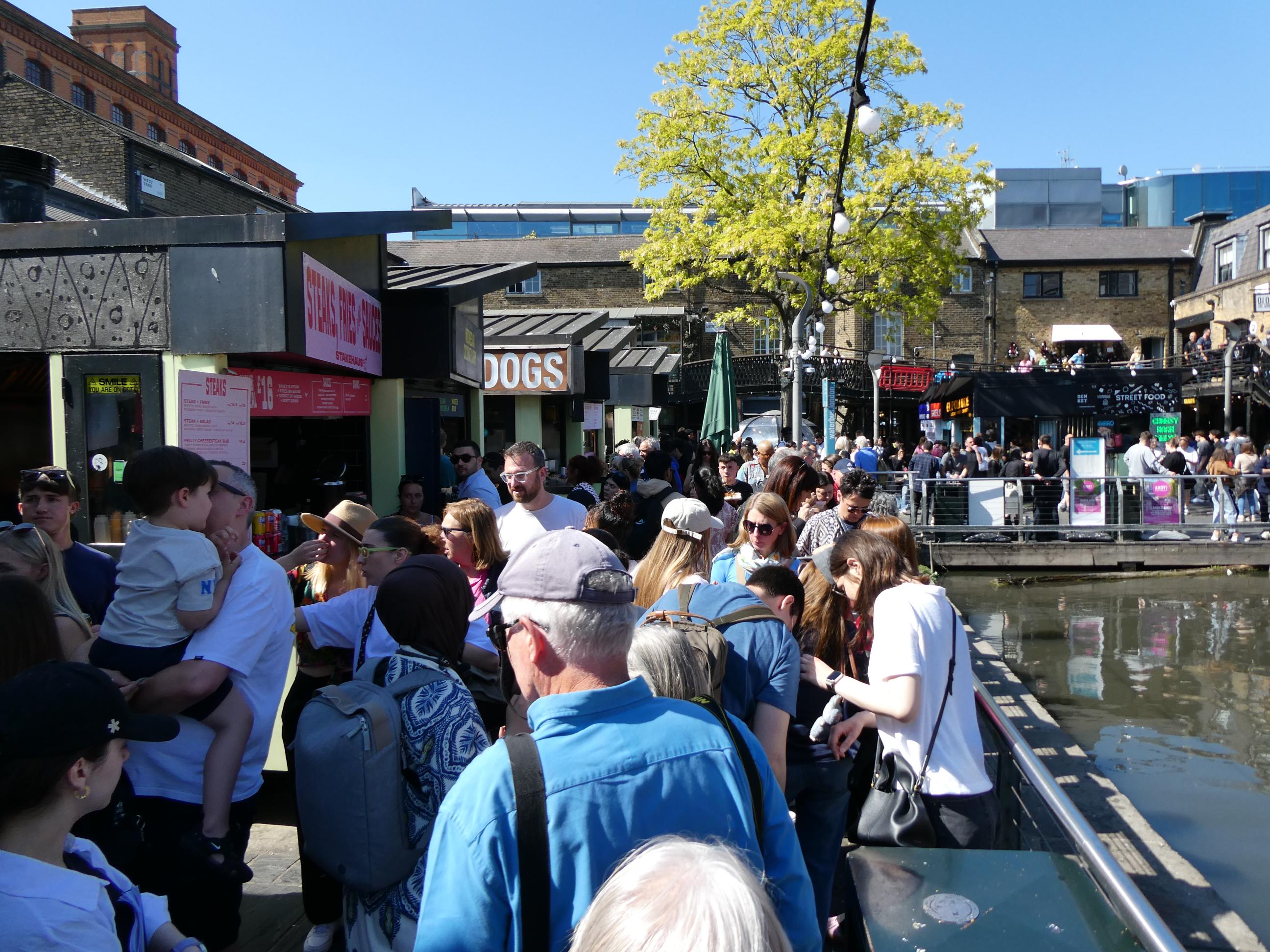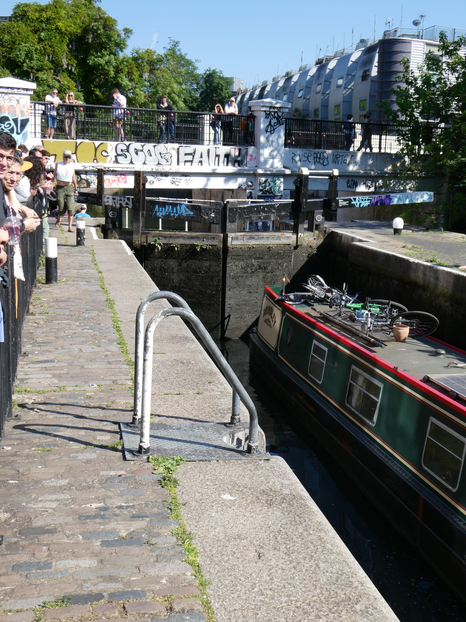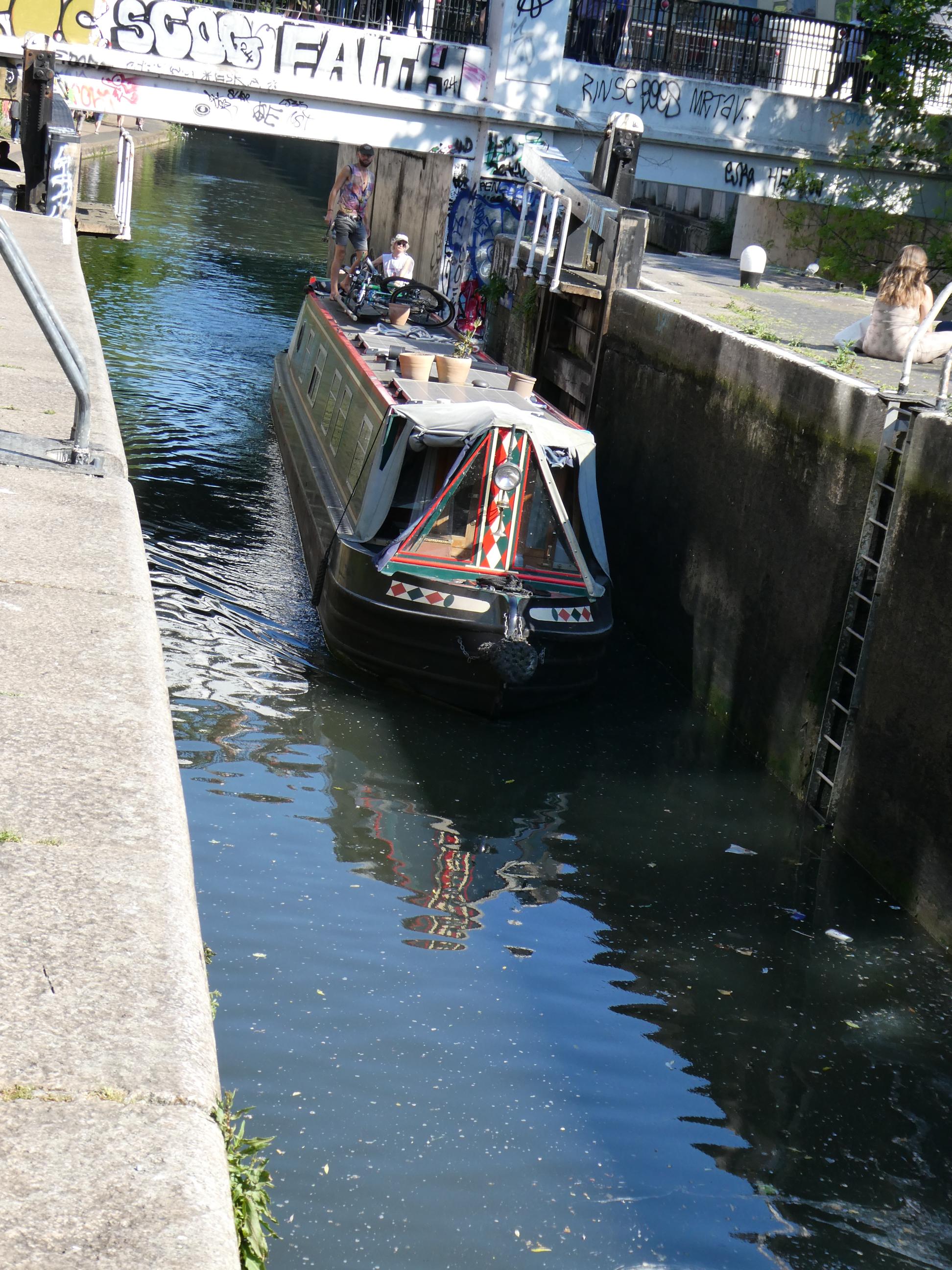 Camden was buzzing when we stopped there mid-afternoon for a drink. That didn’t surprise me on a day like this. It was a challenge to find an empty table, but worth the effort as the beer was good. We stopped to watch a barge pass through the lock. In the hi-tech world that we now inhabit, I take pleasure from some of the things that haven’t changed in centuries, such as the ingenious way of moving a boat through an area where the water level changes.