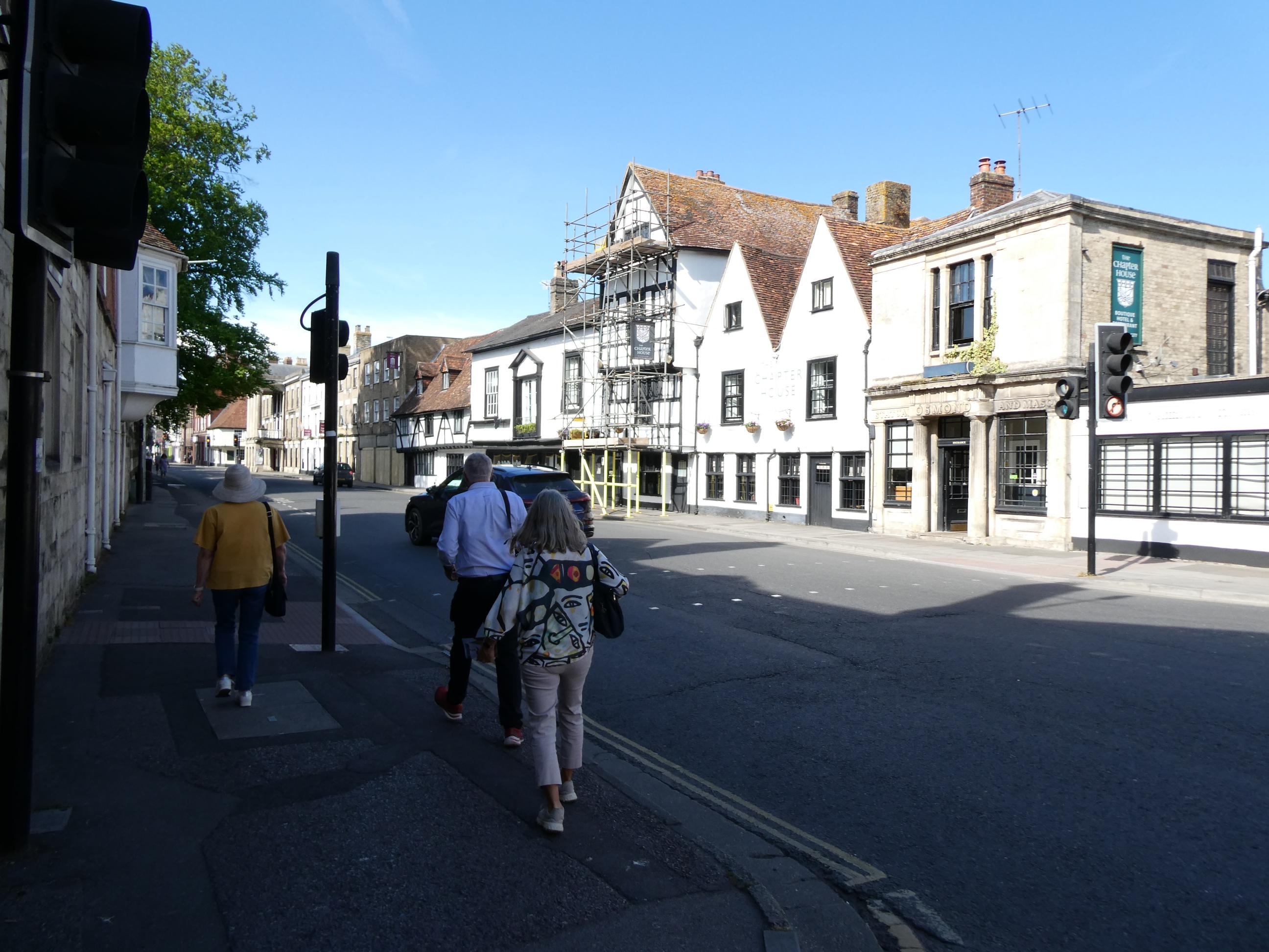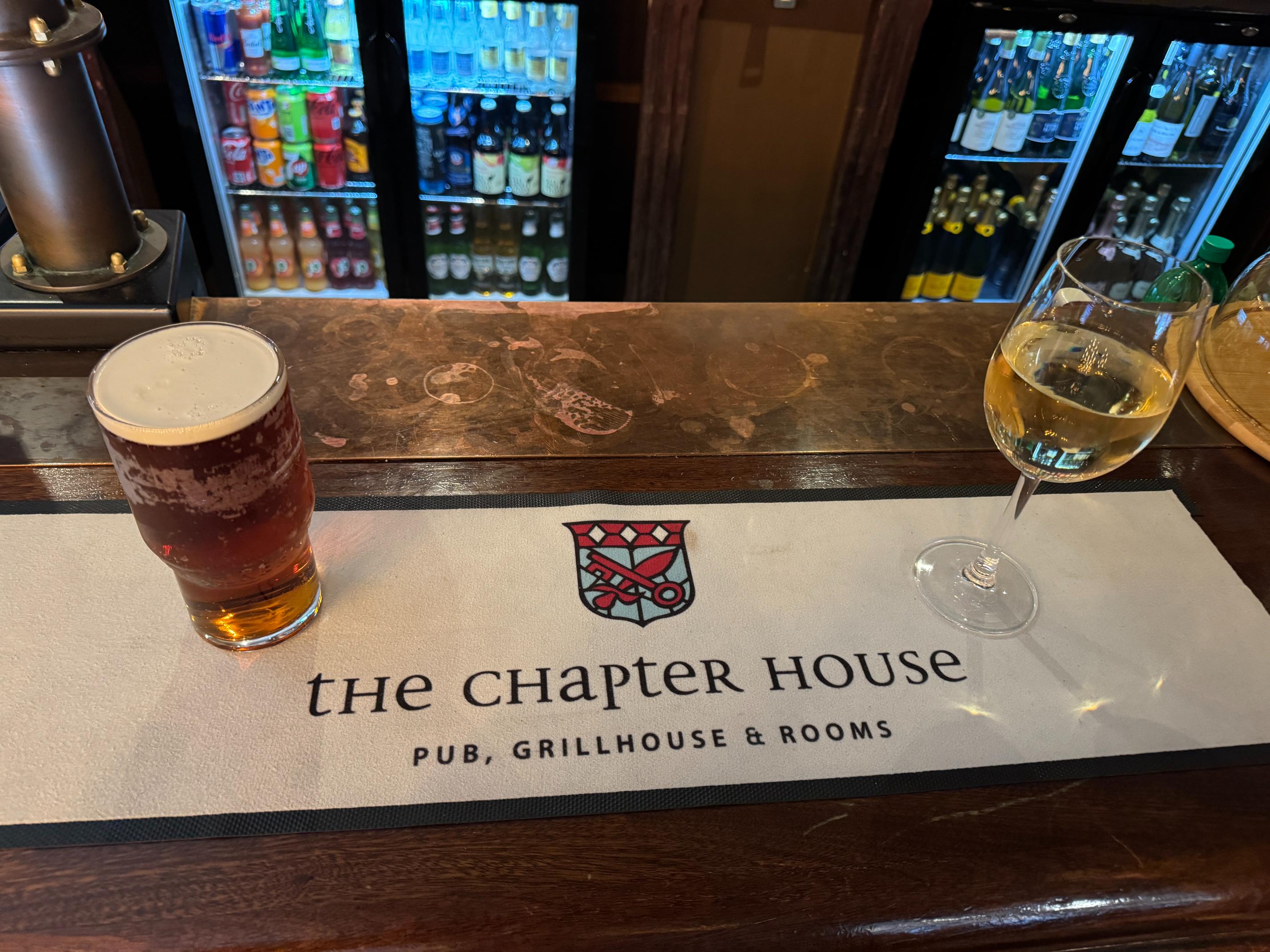 It was only a short walk from the cathedral back to our hotel. Despite that, we passed some wonderful old houses, all of which now appear to be lovingly cared for. We passed a school with a blue plaque, informing us that William Golding once taught there. Golding wrote ‘Lord of the Flies,’ which was yet another book I studied in high school. At the cathedral we’d been told that the best eating in town was at a place called Chapter House. That, of course, is where we were staying, so it was a no brainer to book a table for dinner. Marg and I went down to the bar early for a drink. After dinner, Rod and Cornelia set off for a walk around town. Marg and I went up to our room to rest our weary (or, in my case, blistered) feet. An early finish has also given me a chance to get this blog entry written and posted in good time.