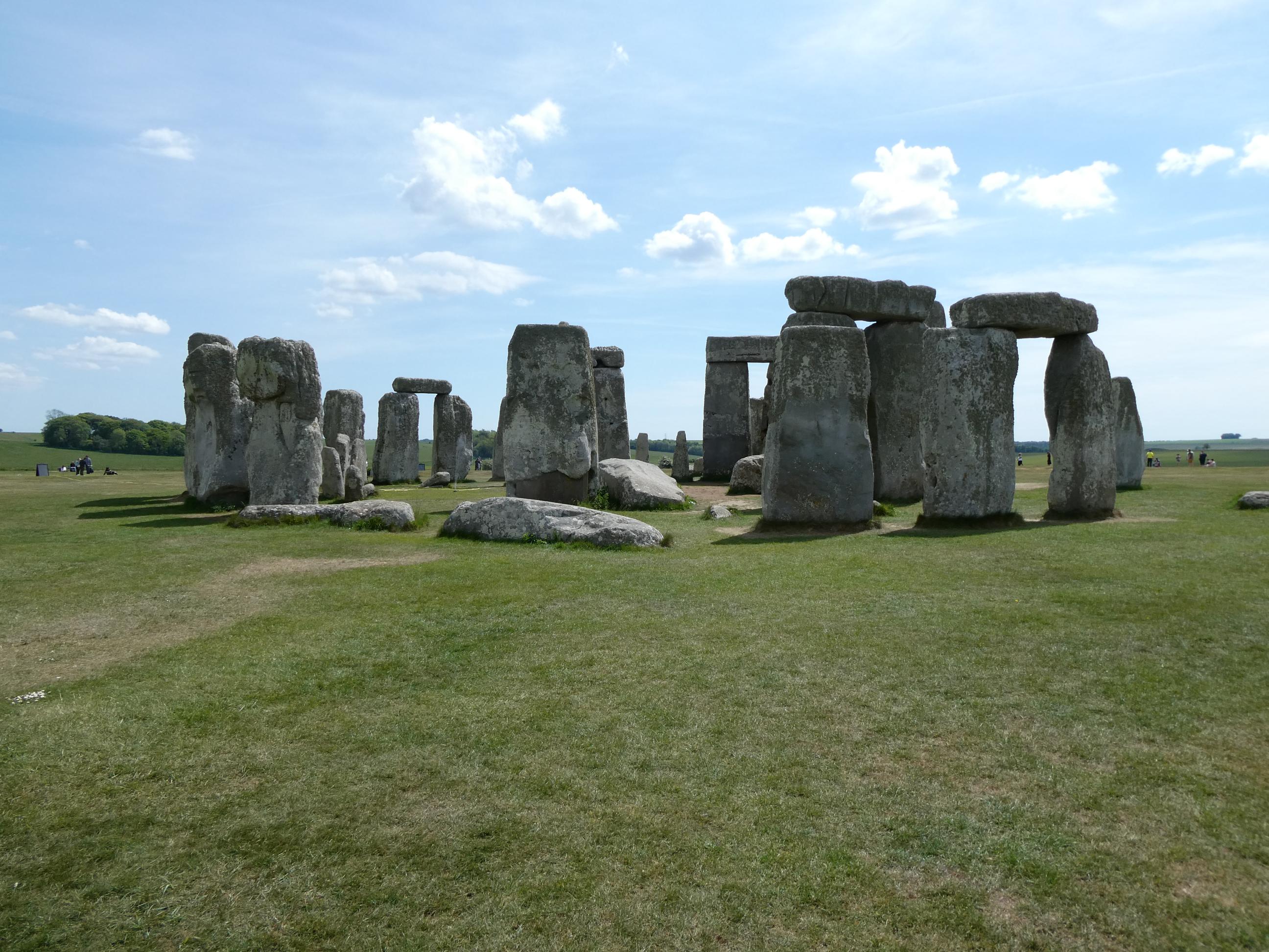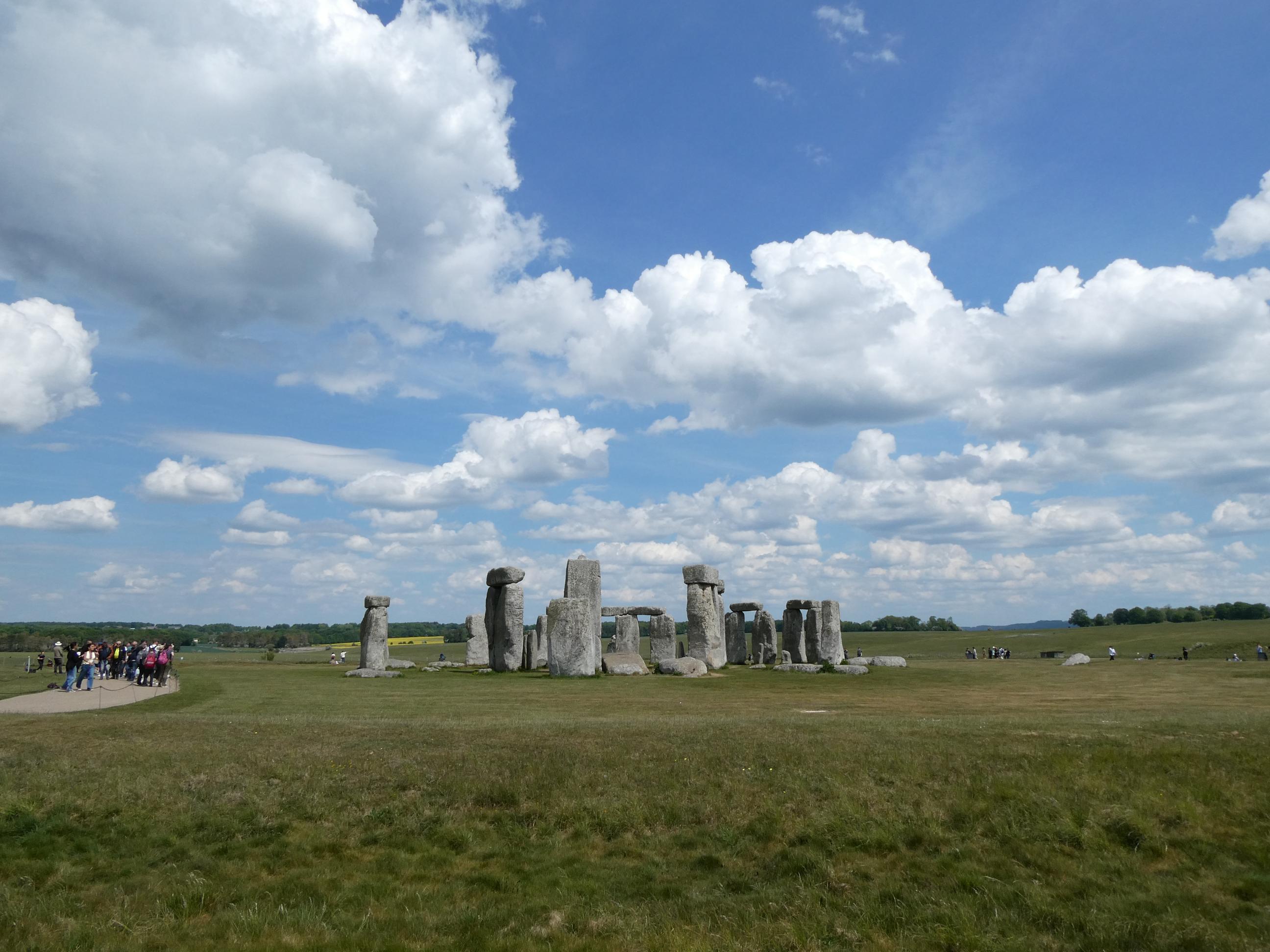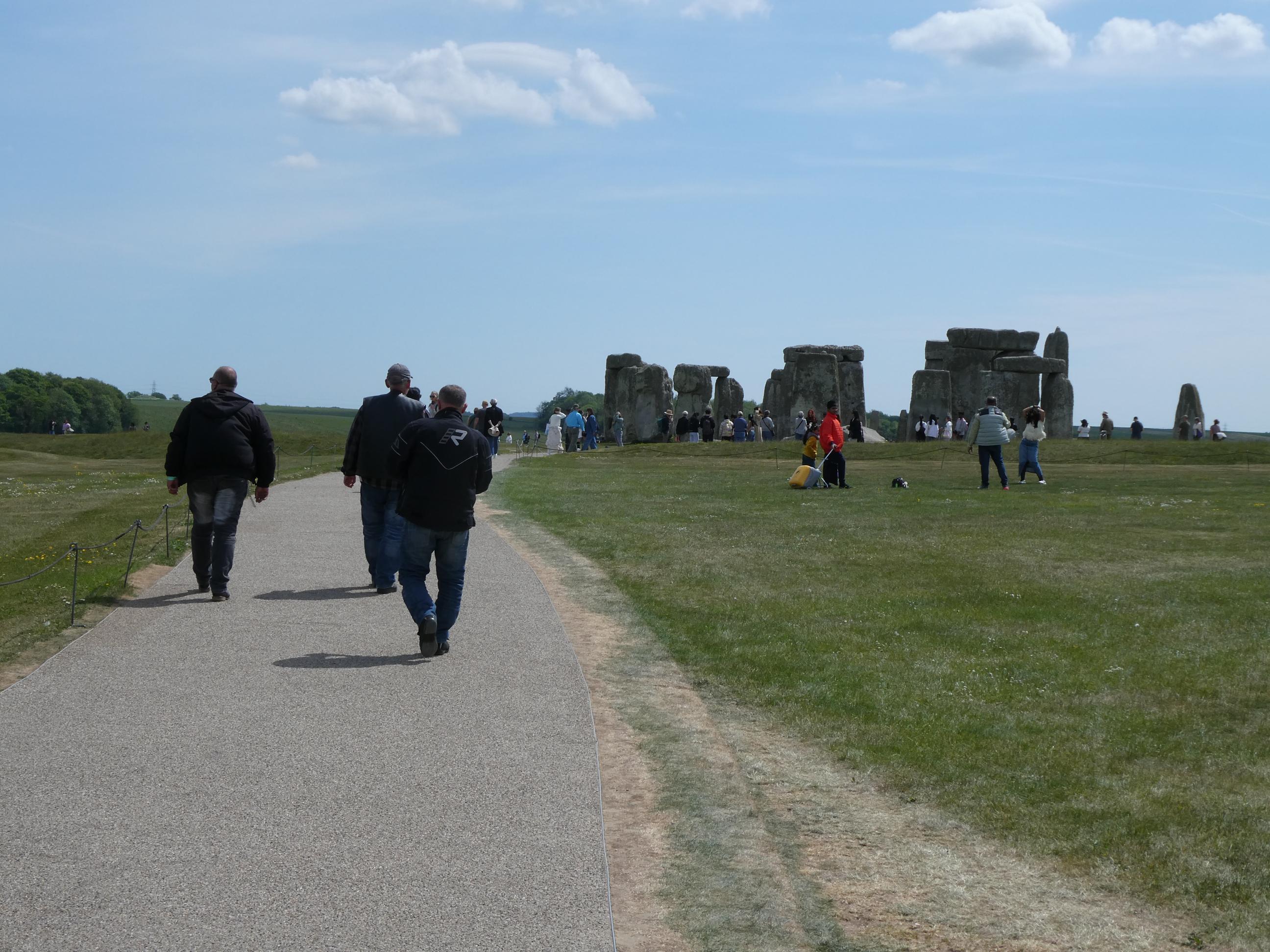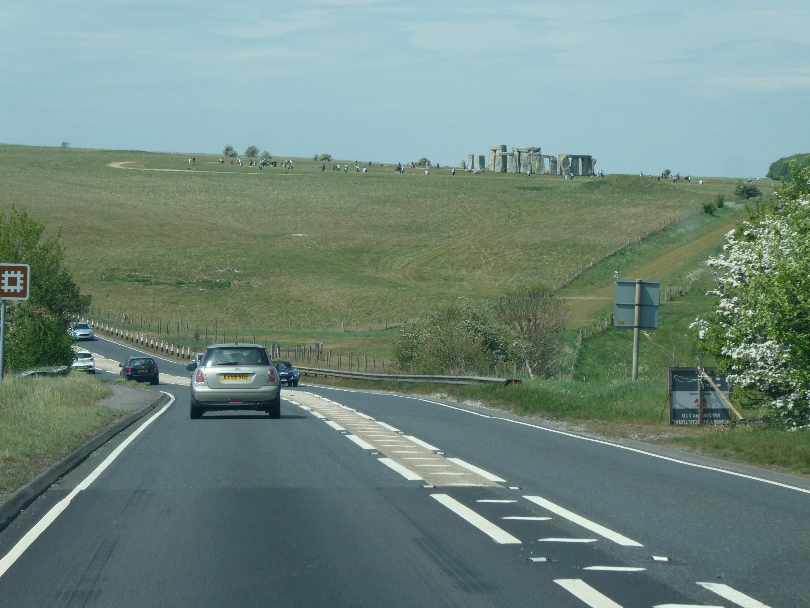 We loaded up the navigation and headed out of London. Two important looking black cars with a police motorcycle escort whizzed past us heading in the opposite direction. I pulled my camera up and focused, then clicked. Rod and Cornelia, both on the driver’s side, looked across to the first of the black cars just metres away and exclaimed, almost simultaneously, ‘That’s Will!’ Prince William was the sole occupant of the back seat. He had his eyes down as we passed, as if he might have been looking at his phone. It’s very hard to see a blurry photo of him in the second photo below. Once we left London, the countryside opened up to green fields on both sides of the road. It was a pleasant sight on another day of sunny blue skies. We were running a little late for our 12pm booking at Stonehenge because of the mix-up with the hire cars, but we had a good run and arrived at the turnoff only about 30 minutes late. But we couldn’t turn off towards Stonehenge because the turnoff was blocked by large cones and there was a ‘Diverted Route’ sign pointing us in a new direction. Another sign said POLICE ACCIDENT. We never found out what happened, but were forced to take a detour. For a while we were stuck in bumper to bumper traffic. Eventually we got off the main road and were diverted through a lovely rural village called Shrewton. We arrived at Stonehenge by the alternate route – about 40 minutes late.