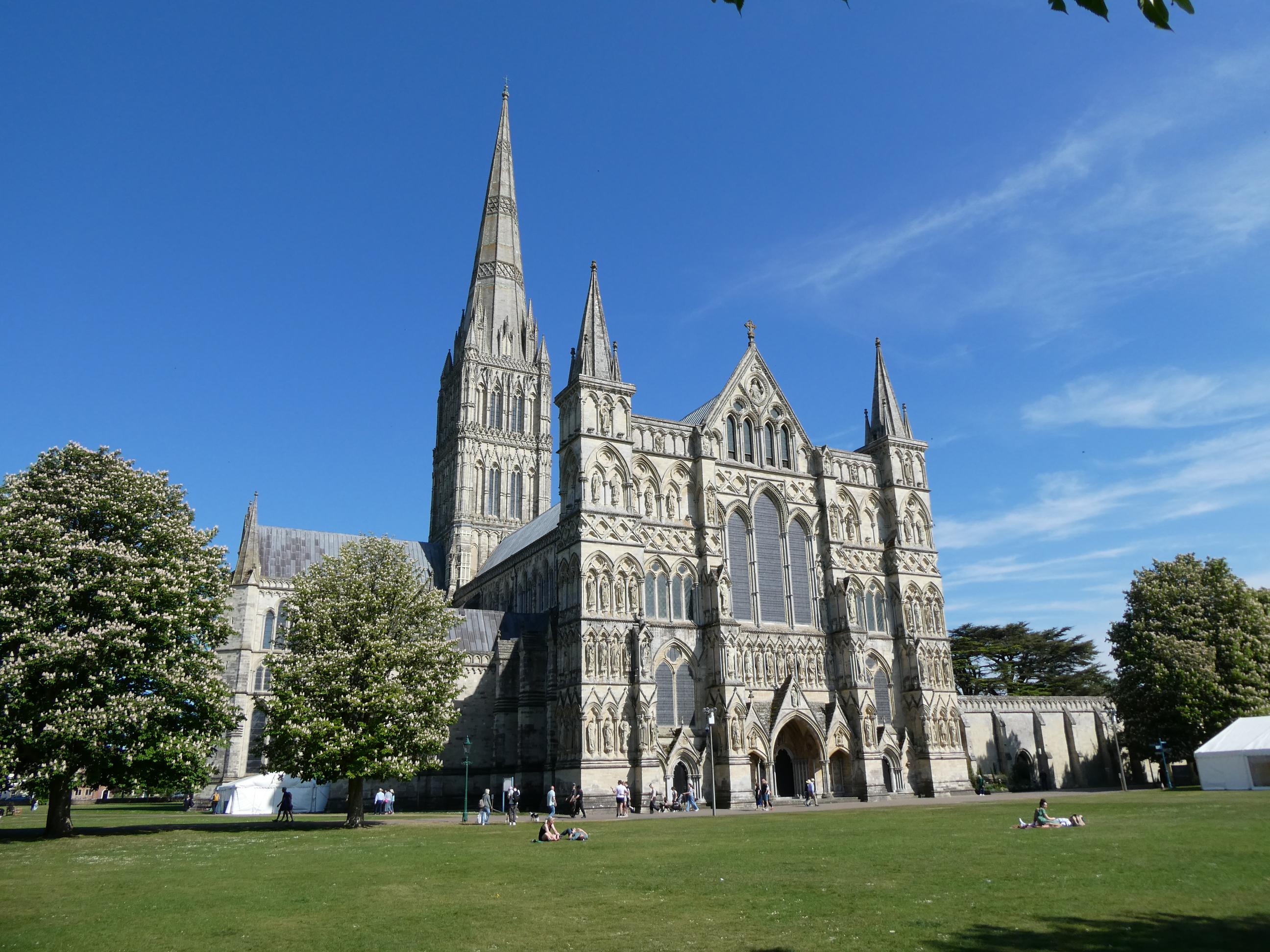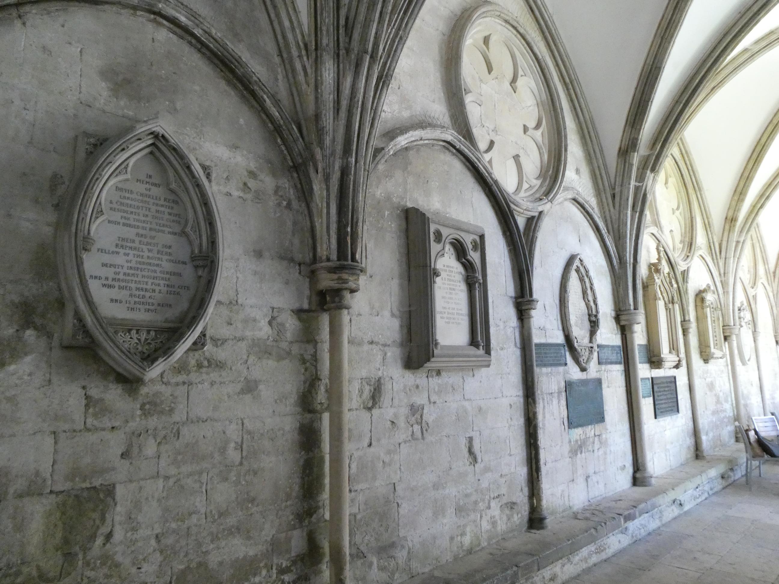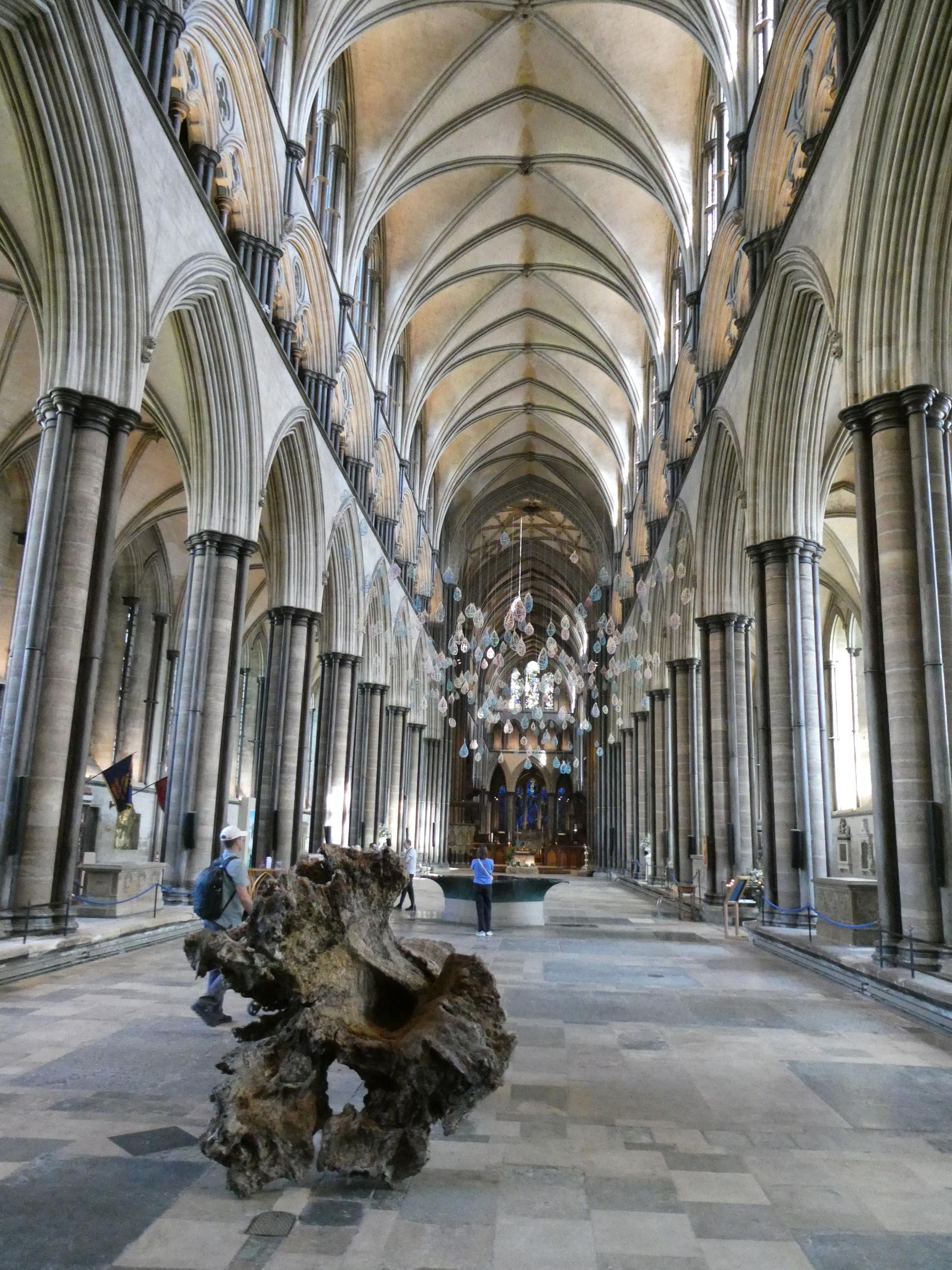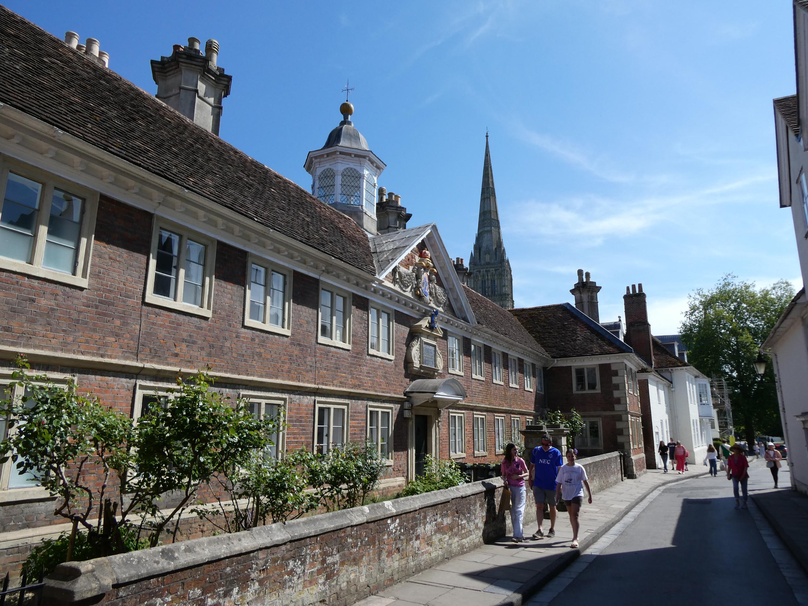 We ate lunch in the Stonehenge cafe, then took the short drive to Salisbury. The main entrance road was still closed due to the accident, so once more we took the diversion through Shrewton. We were struck immediately by the charm of Salisbury, especially when viewed under blue skies like we were enjoying today. There are many historic buildings lining the narrow streets, where its almost impossible to find anywhere to park. There is an ancient city wall that still stands and has been integrated into the modern streetscape. Directly opposite a gate in that city wall is our hotel, Chapter House. The building itself is very old, dating back to 16th century Tudor times, with unconventional rooms and corridors that make it challenging to find your way through, but give the building much character. It’s been registered as an inn since 1560. Some of the stairs, beams and corridors are original. Eight centuries ago, stone was hewn on this site to build the cathedral, particularly the Chapter House, one of its most historic rooms. The hotel manager helped us find a place to park our car for the night, and we walked across from there to the cathedral.