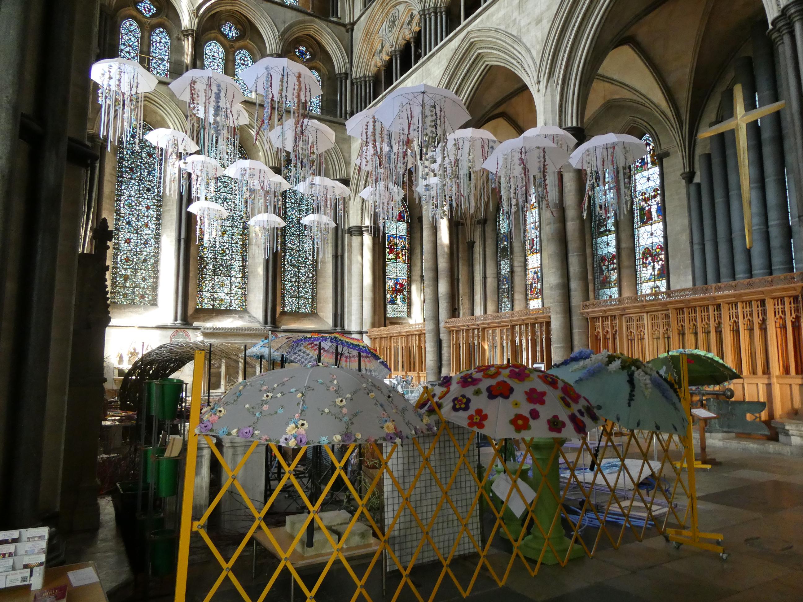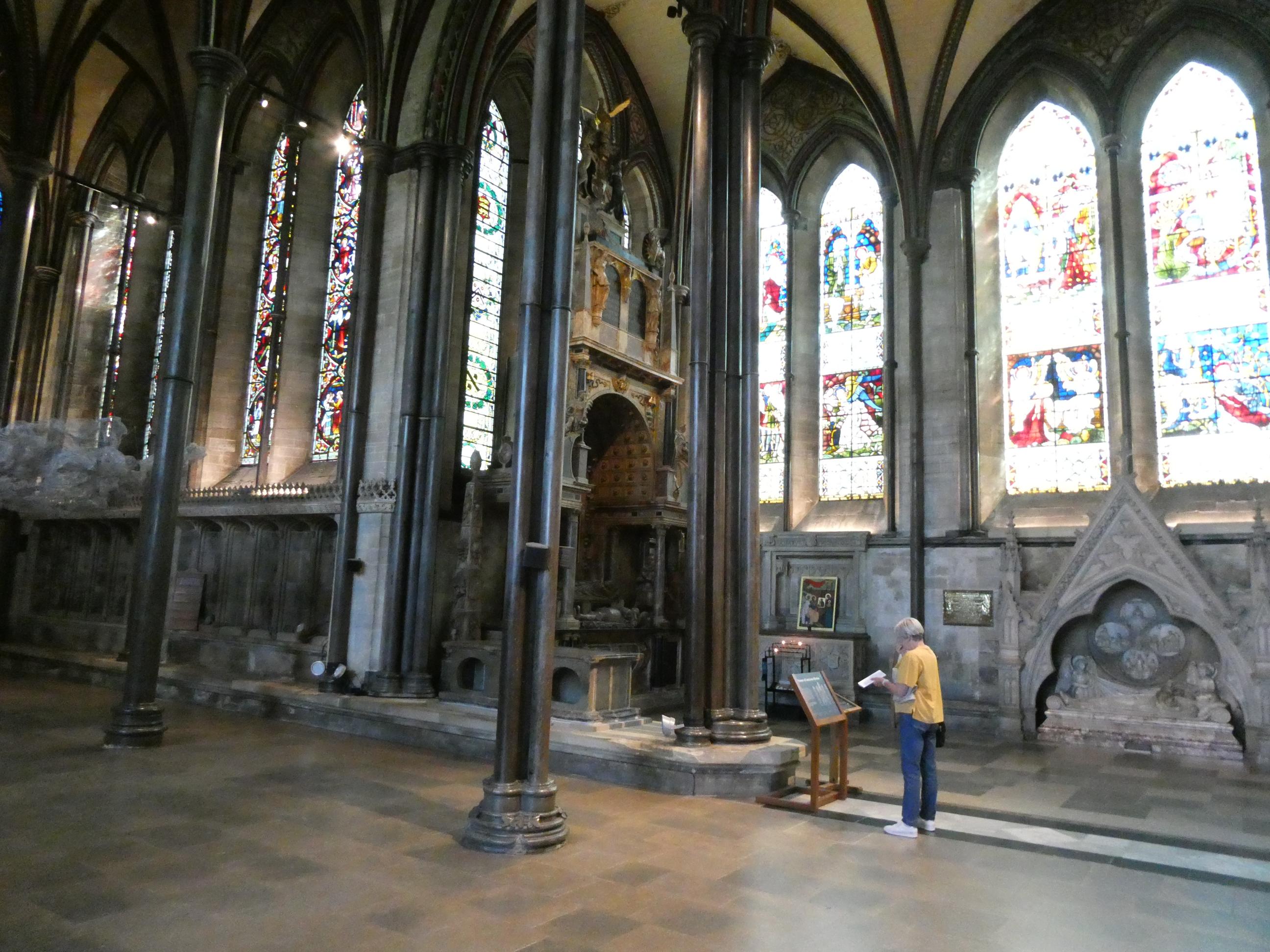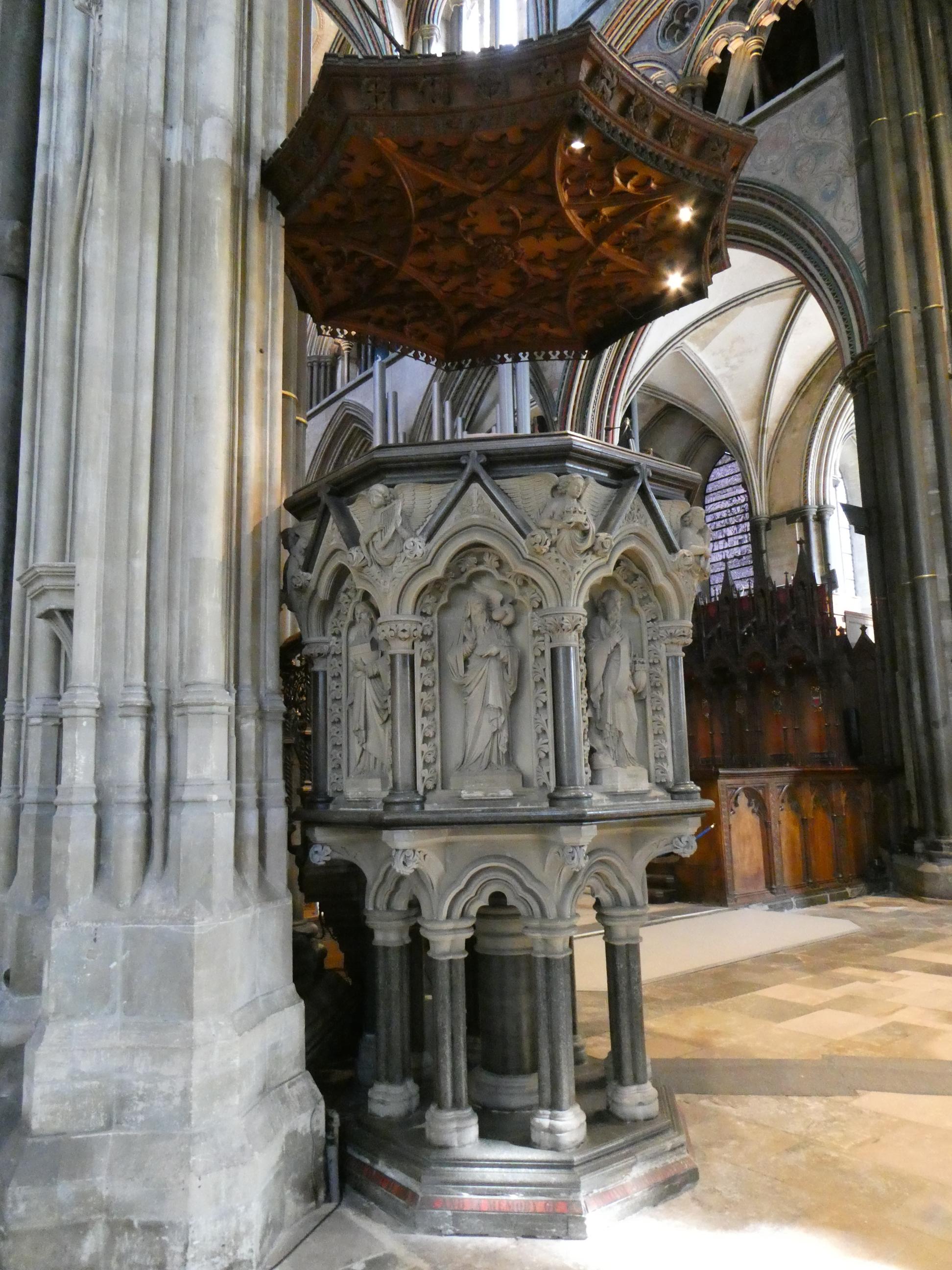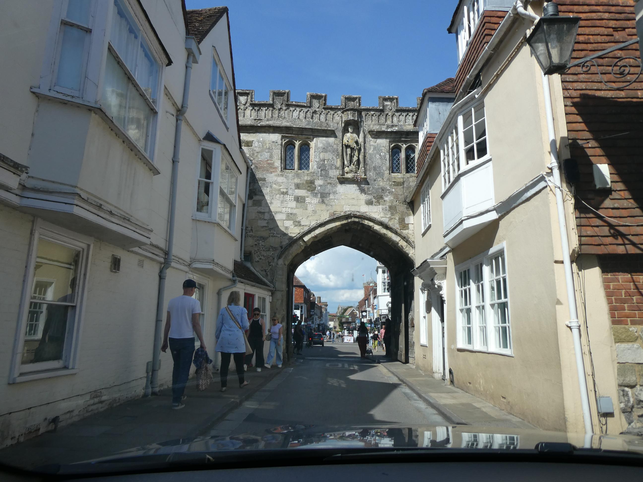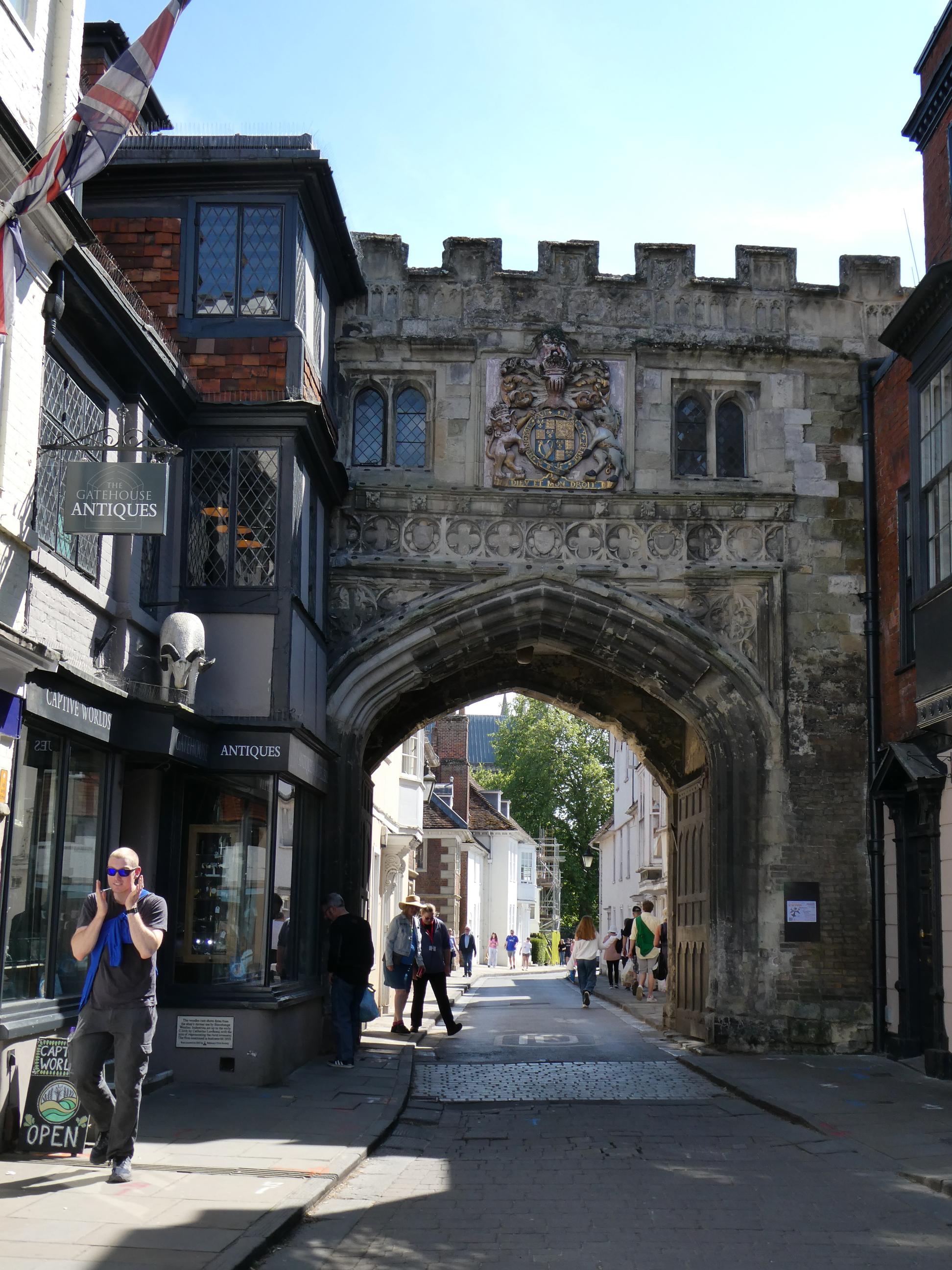 We ate lunch in the Stonehenge cafe, then took the short drive to Salisbury. The main entrance road was still closed due to the accident, so once more we took the diversion through Shrewton. We were struck immediately by the charm of Salisbury, especially when viewed under blue skies like we were enjoying today. There are many historic buildings lining the narrow streets, where its almost impossible to find anywhere to park. There is an ancient city wall that still stands and has been integrated into the modern streetscape. Directly opposite a gate in that city wall is our hotel, Chapter House. The building itself is very old, dating back to 16th century Tudor times, with unconventional rooms and corridors that make it challenging to find your way through, but give the building much character. It’s been registered as an inn since 1560. Some of the stairs, beams and corridors are original. Eight centuries ago, stone was hewn on this site to build the cathedral, particularly the Chapter House, one of its most historic rooms. The hotel manager helped us find a place to park our car for the night, and we walked across from there to the cathedral.