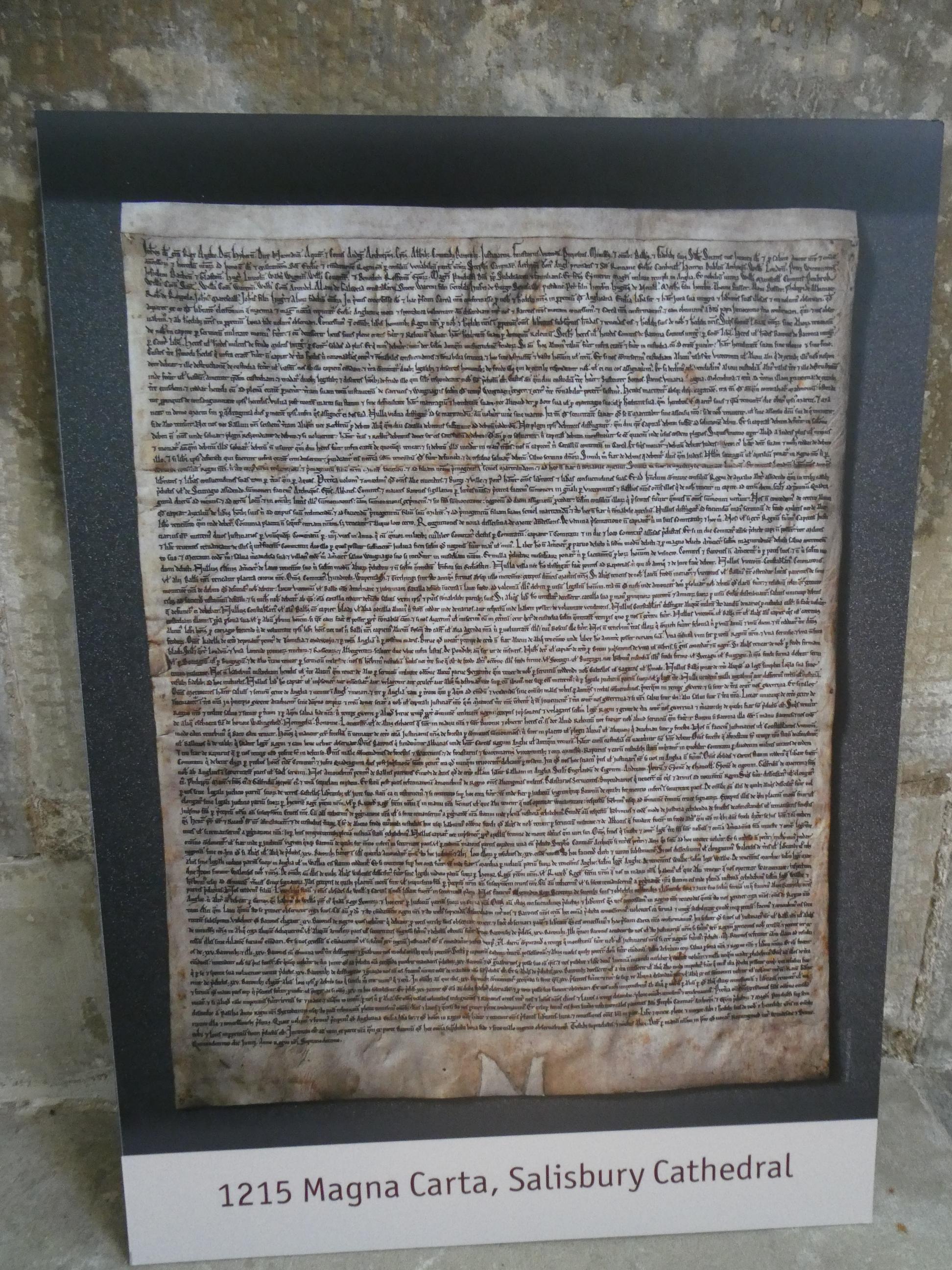We arrived just after 3pm, and the cathedral was due to close to visitors (with the exception of those wishing to stay on for Sunday’s Evensong) at 4pm. To make the best use of our time we headed straight for the Chapter House, where one of very few existing copies of the Magna Carta is housed. The Magna Carta was a document, inscribed on parchment in 1215, that was signed by King John. Essentially, the document he signed was a charter stating that the ruling monarch was not above the law, and was there to protect and serve the people and particularly preserve their freedom. It’s like a forerunner to the Constitution, and has influenced the way many countries are now democratically governed, including the one I call my home, Australia. I could not believe how tiny the lettering on the original document is. It must have provided the scribes who produced it with great challenge. The original document held at Salisbury Cathedral sits in a controlled environment with low lighting. Only one person at a time can view it, although there are replicas provided nearby which afford people a longer look. Photographing the original document is not permitted, for obvious reasons of preserving the fragile and light sensitive parchment and oak gall ink. We had just 30 more minutes to view the cathedral before it closed to prepare for evensong. As you might expect, it is beautiful inside – perhaps majestic is a more apt way of describing it. My favourite feature was the baptismal font, a very still pool of water that acted as a mirror to perfectly reflect the stained glass windows and objects attached to the walls adjacent to it. There is also a working clock that dates back to the 1300s. It was formerly housed in a tower, though it never had a face or hands. Some claim it is the world’s oldest working clock. Unfortunately our visit was cut short by time pressure, but I really enjoyed what I saw. I’d love to be there next week when it hosts a flower festival. We returned to the beautiful sunshine and walked across the cathedral lawns. From a short distance, it made a very impressive sight. Its spire is the tallest in England