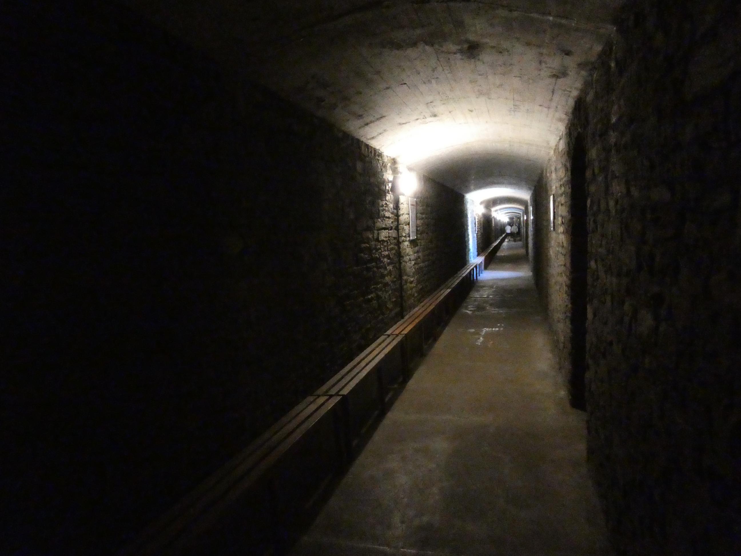 We followed the arrows through the Arab Room, the Banqueting Hall, the Small Dining Room and the Library. Each was spectacular in its own way, and I was looking forward to visiting the other amazing rooms I remembered from my previous visit, but when the next arrow directed me to go down stairs rather than up, I knew something was wrong. As there was nowhere else to go, I followed the stairs and soon found myself outside the building, standing next to a sign thanking me for visiting. WTF, I thought. There should be much more than this. I walked back into the entryway and asked the guy checking tickets about the main bedroom, roof garden and the other rooms I remembered. “Oh,” he said, “they’re only available if you take the guided tour option.” What a bummer. They were the best part. I wish that had been made clearer on the website when I purchased the tickets. I was so disappointed, that I took little interest in the Norman keep, though I found myself entertained by the bird life in the moat that surrounds it. Rod pointed out that there were tunnels from WWII in another corner of the site that we could explore. Cardiff suffered significant bomb damage during the war, and it must have been very frightening for the citizens every night the German planes came over the city. When that happened, people were encouraged to come to the tunnels for shelter. They had some food preparation facilities there, basic beds and long bench seating. I imagine they might have managed to get a good number of Cardiff’s citizens underground and sheltered there during the heavy bombing raids. When Rod and I first entered the tunnel, a the frightening high pitched sound of bombs falling was played through a sound sytem. When I heard that horrible sound, seemingly directly above me, it made me shiver. It must have been so scary huddled with friends and family in the tunnel, listening to the bombs falling above your head.