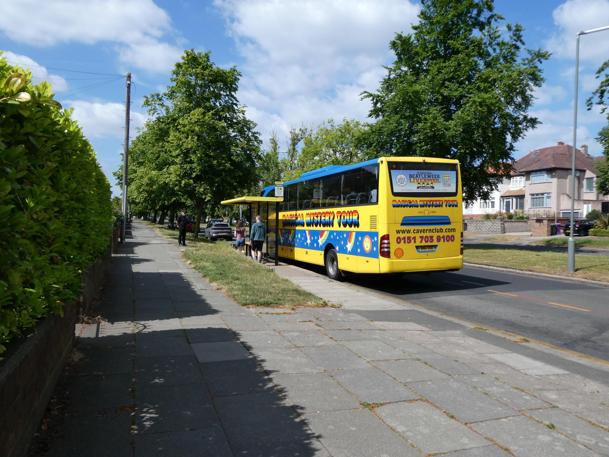 En route there were a few other places of interest. The first photo is the street used for filming one of my favourite TV series, ‘Peaky Blinders’, though it is meant to depict Birmingham and not Liverpool. Just around the corner from George’s home was the house once listed as the ‘smallest house in Britain’. Near Paul’s house, our bus parked at the same bus stop where Paul used to catch the No 86 bus to school. George also caught this bus, and one day Paul saw 14-year old George sitting on the bus with his guitar. They started talking, George played a tune for Paul, and the rest is musical history. Paul also referenced this bus stop in ‘A Day in the Life’.