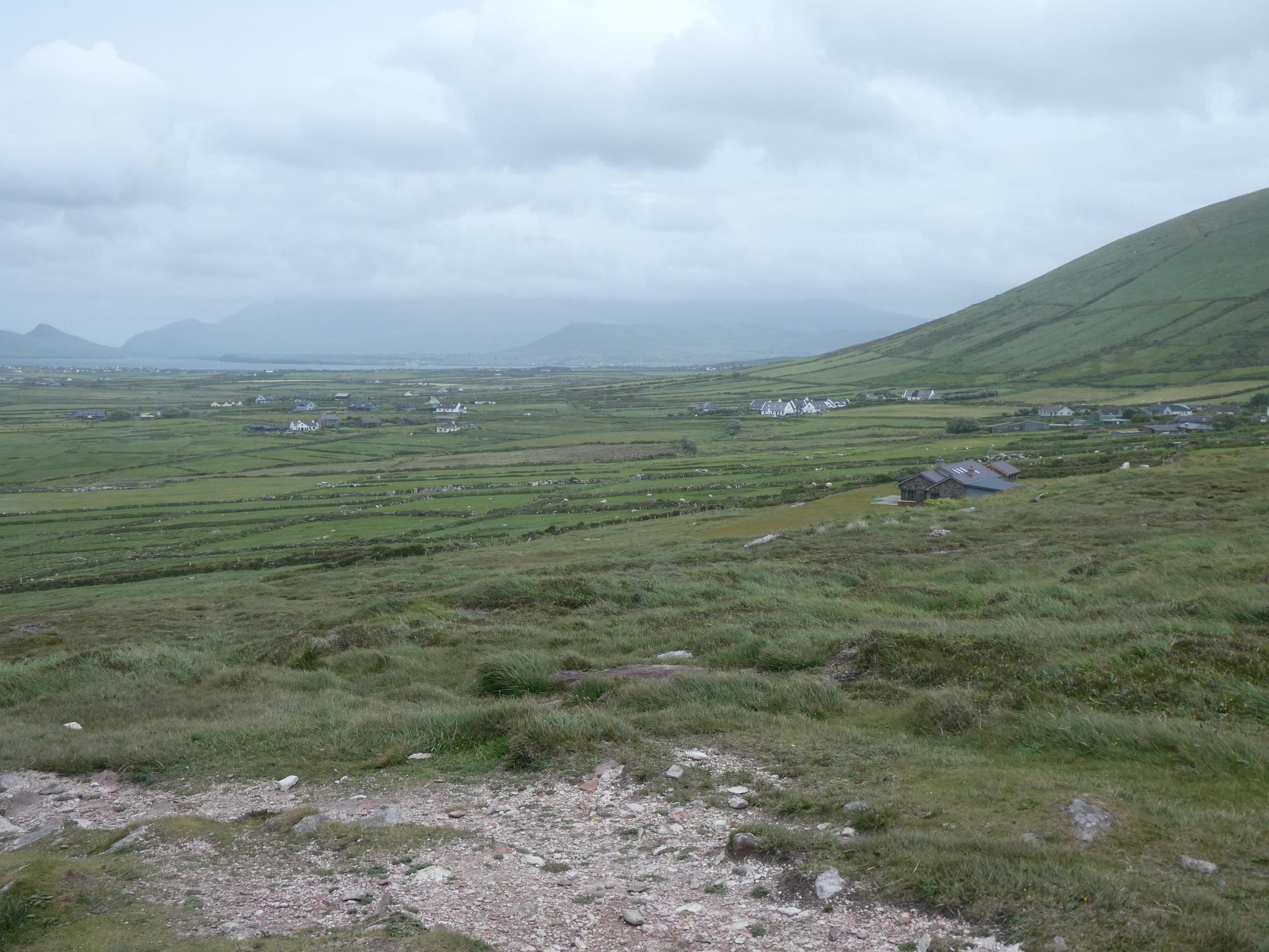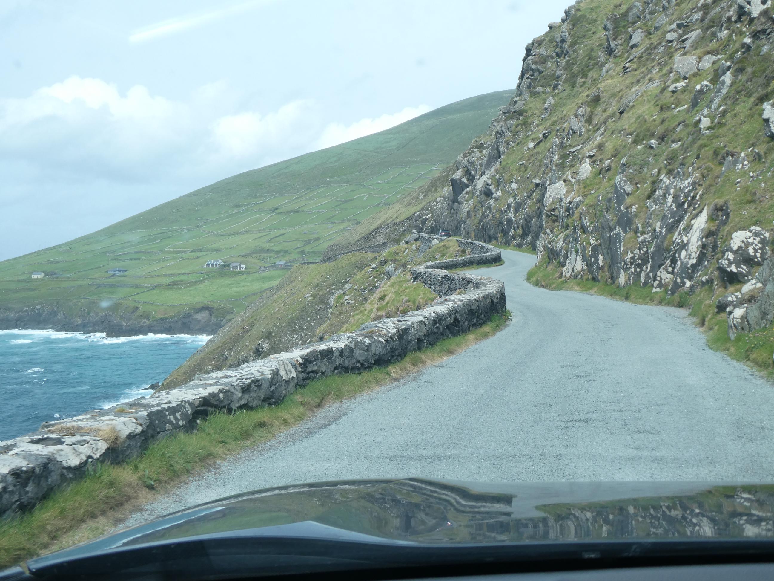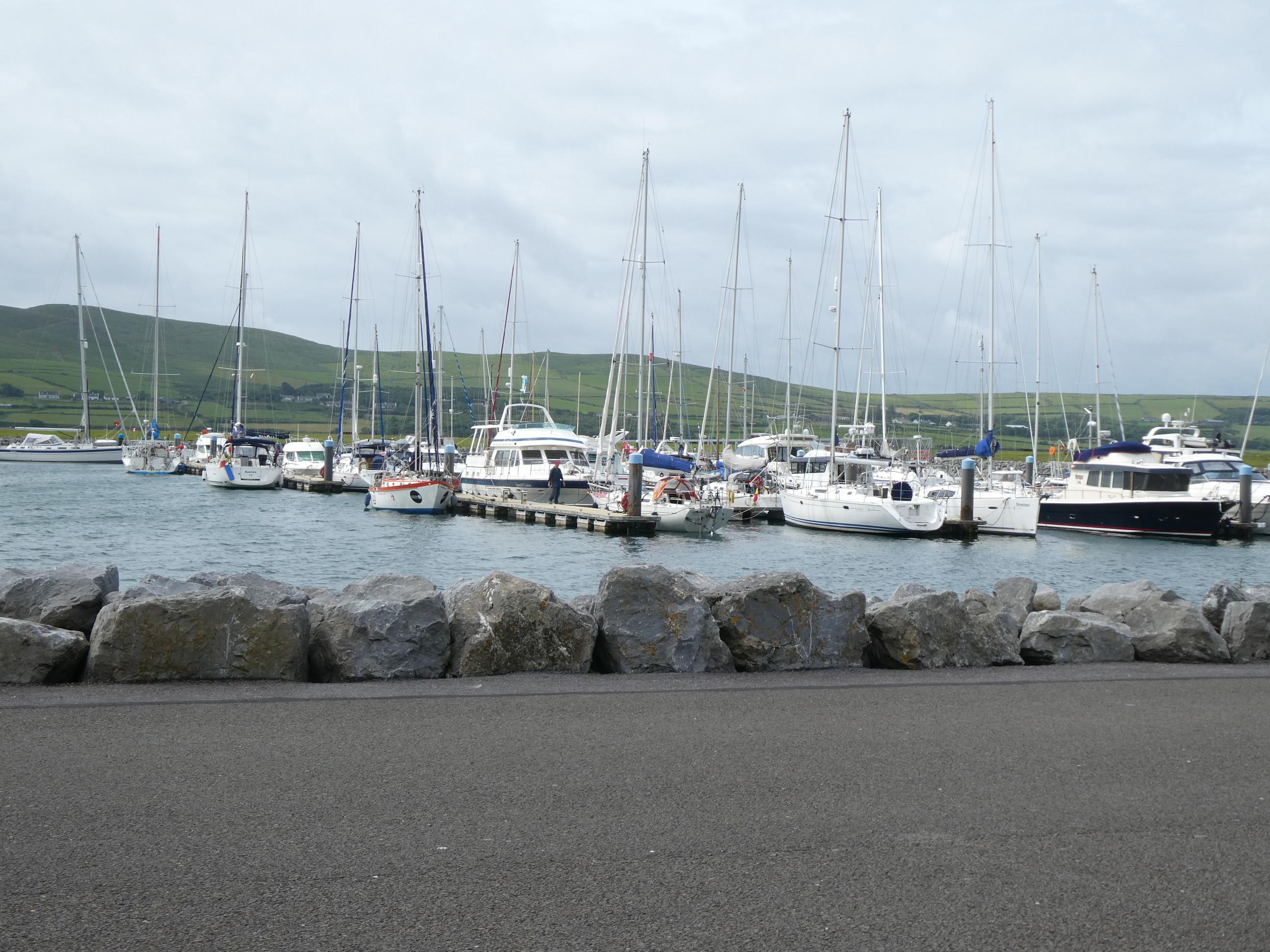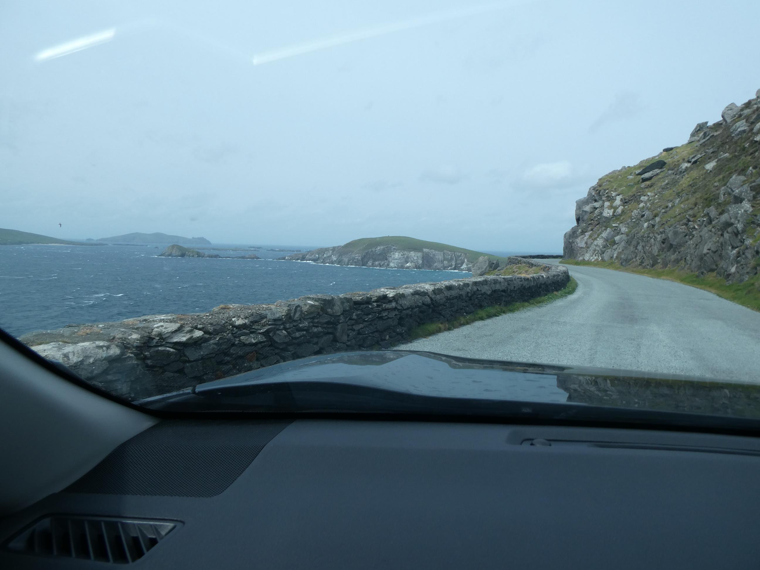 Just short of reaching Dingle, we turned north-east and began a winding climb on a road that cuts across the peninsula from south to north. At an elevation of 456 metres, its highest point, the road passes between two mountain peaks at Conor Pass, before beginning its winding, steep descent on the other side. It’s one of Ireland’s highest mountain road passes. We stopped in the carpark at the pass for photos. It was a beautiful view down the valley. Strong, chilly winds made it difficult to open and shut the car doors, let alone walk upright. Some cyclists had made it all the way up, and we’d even passed some walkers, low down on the slope, who seemed to be heading towards the pass. I watched one guy, wearing only shorts, leave the carpark and head even higher up towards one of the peaks. I don’t know how or why he would attempt it in those strong winds. The notes Rod had gathered in preparation for today said that the descent on the far side of the pass was the ‘stuff of nightmares for nervous drivers’, so we opted to turn the car around and head back down the way we’d come. That was still a very steep, curving descent that kept drivers vigilant all the way down. We passed one guy on a bike who seemed to be having a hard time keeping it under control and couldn’t even move over to the side of the road to let us pass. He had one foot off the pedals and appeared to be using it to try to slow himself down. Thankfully, the road itself was a well maintained asphalt road with a strong safety wall preventing anyone from going over the edge. I hope he made it safely to the bottom eventually. The road brought us into Dingle, where we stopped for lunch.