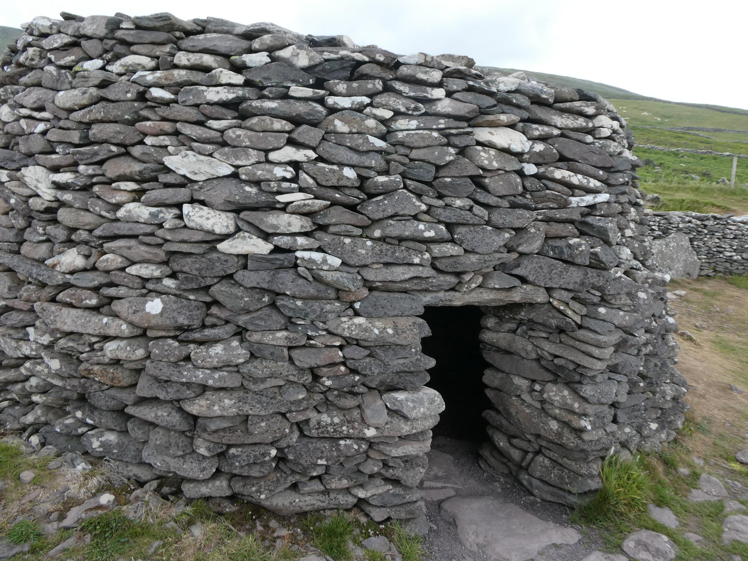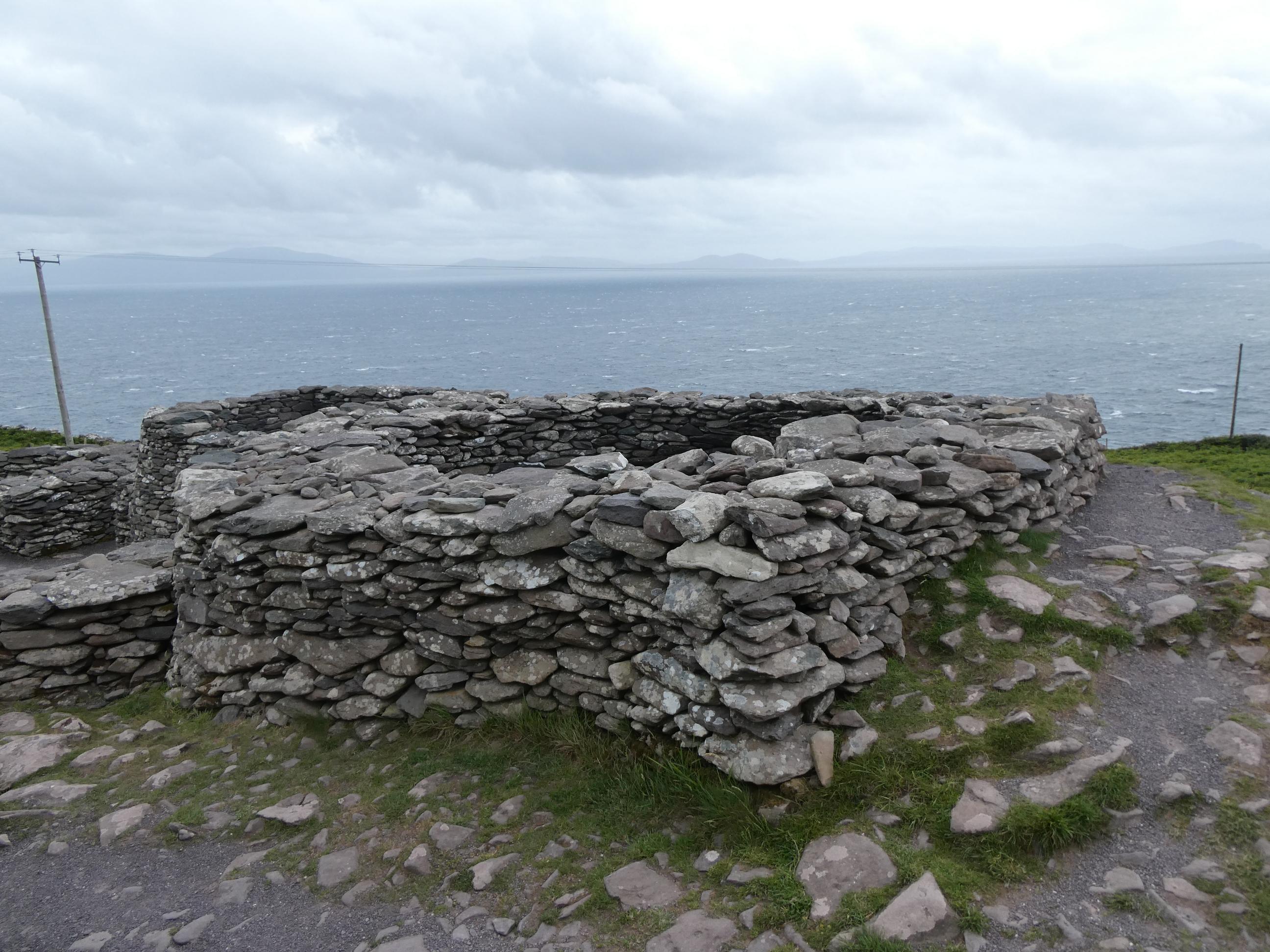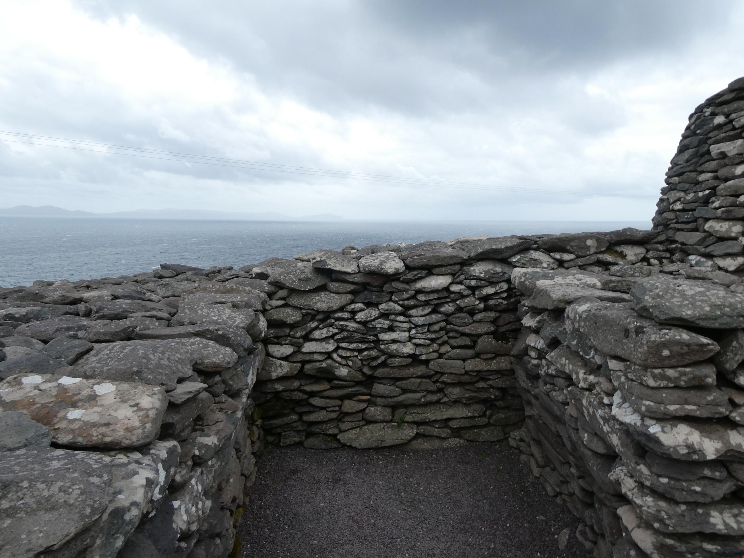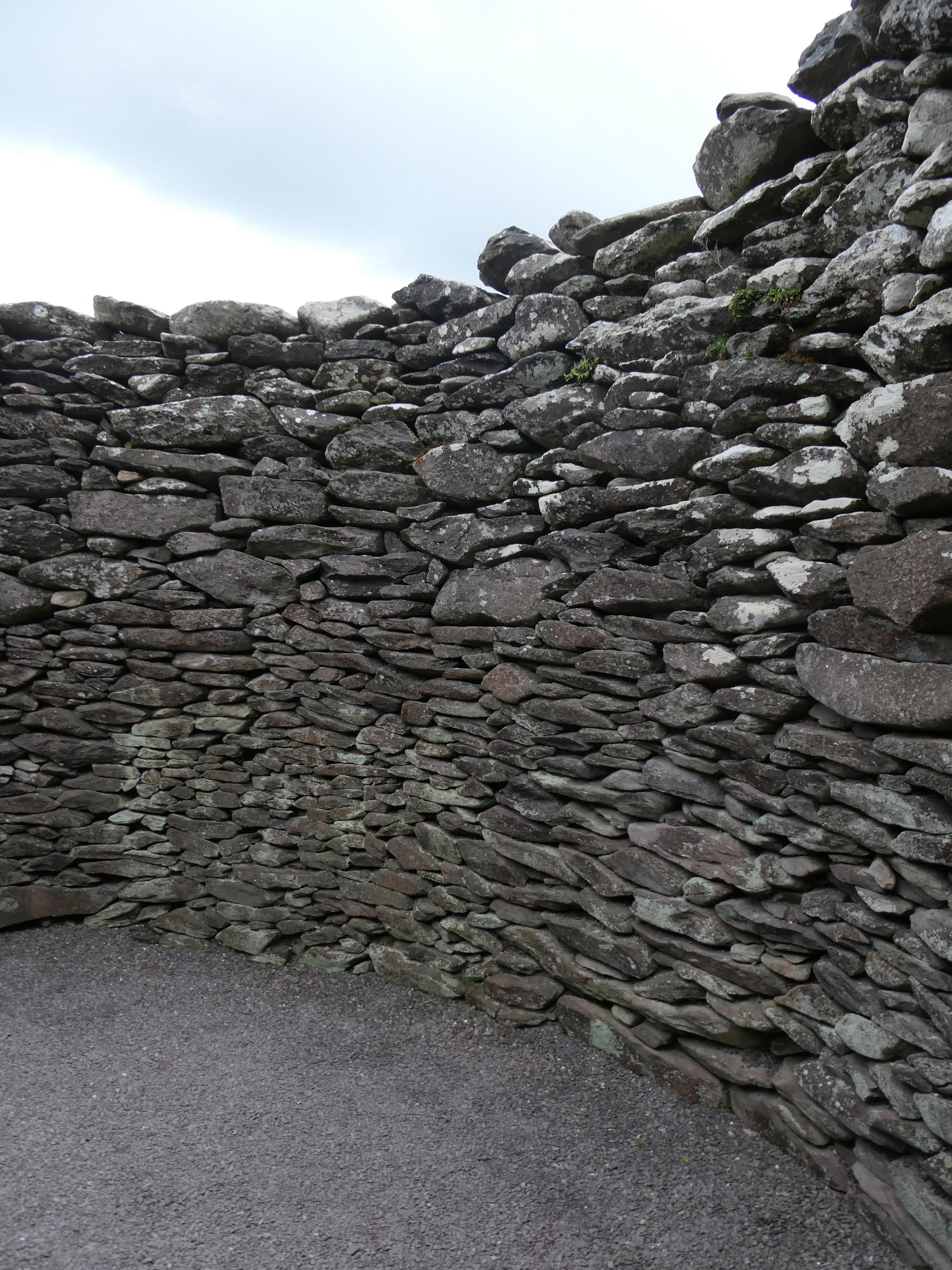 A little farther on from Dingle, at Fahan, we pulled up at a layby and walked a couple of hundred metres up a slope to a group of round stone ‘beehive’ huts. There appears to be no exact time frame to when they were first built, but it seems they may have last been in use around 1200 AD. Like the ringforts we visited yesterday, the beehive huts were created only by placing stones upon other stones. No mortar was used. It’s likely that a single family occupied each beehive hut. It would have provided protection, shelter and storage space for farm produce. As well as similarities with yesterday’s ringforts, the beehive huts, or clochans as they are otherwise known, reminded me of some the stone structures I’d seen at Skara Brae in Orkney and Jarlshof in Shetland. Once again, the strong icy wind was whipping through here. It was a relief to step inside one of the huts to escape the wind for a while.