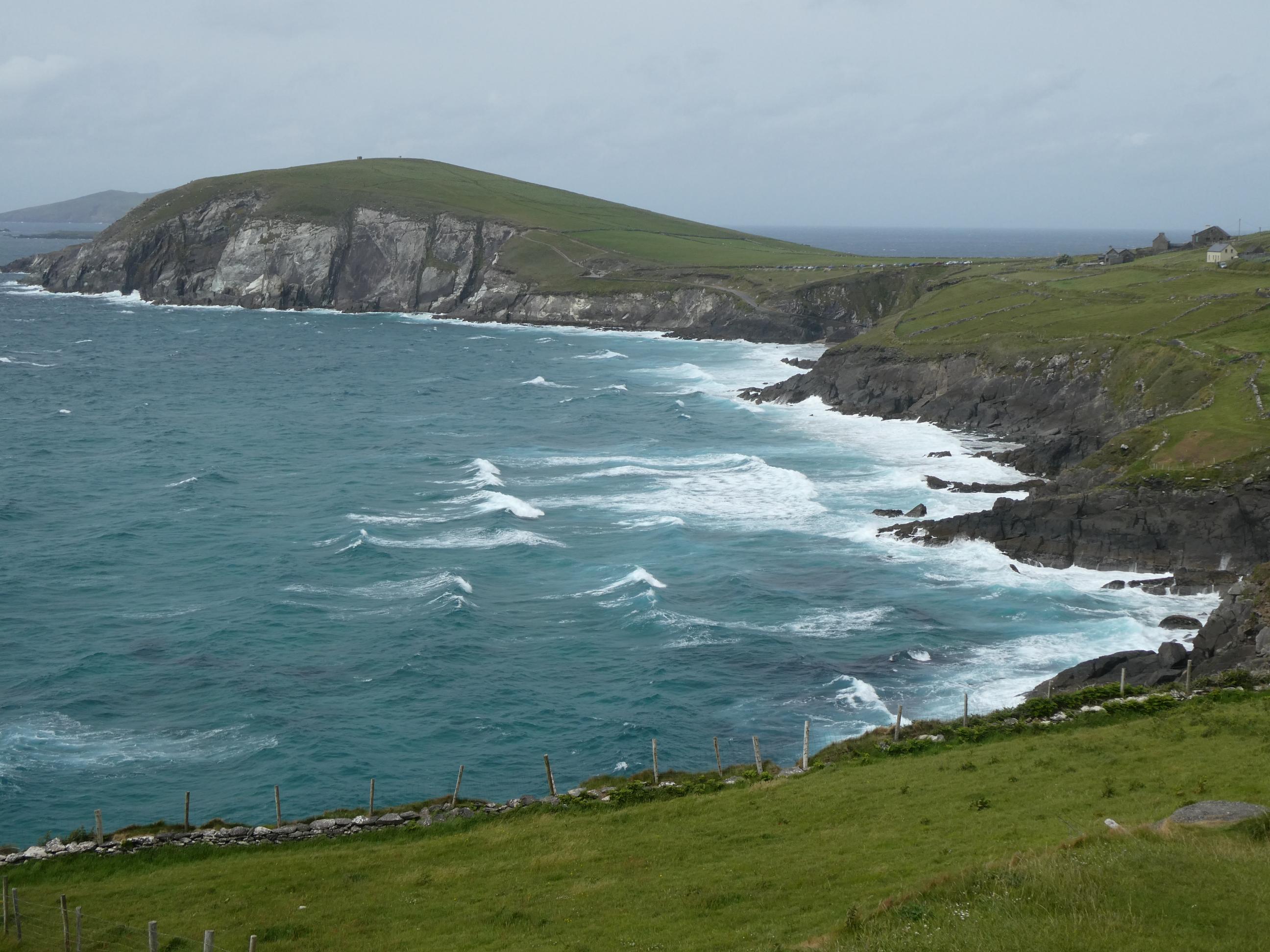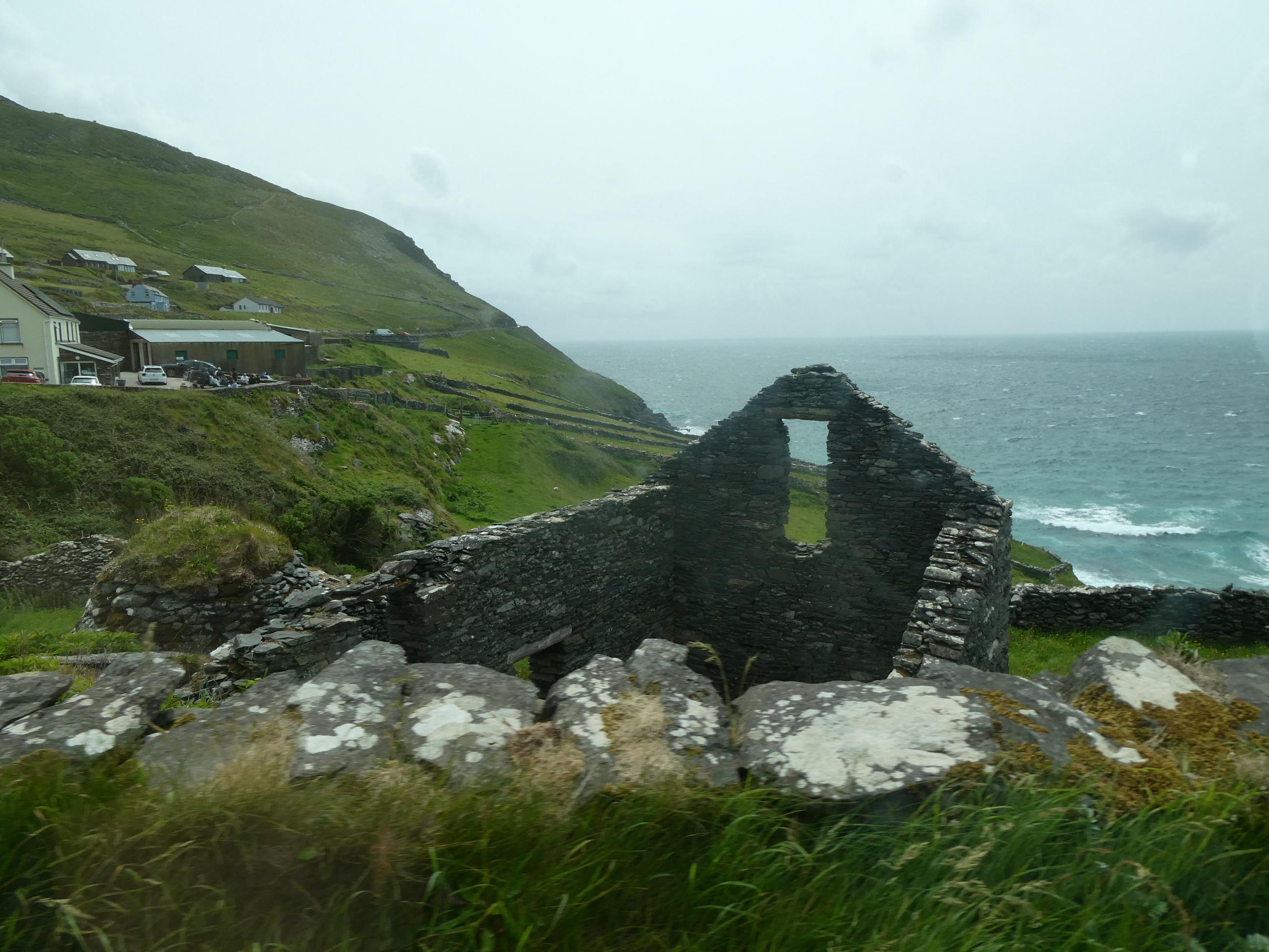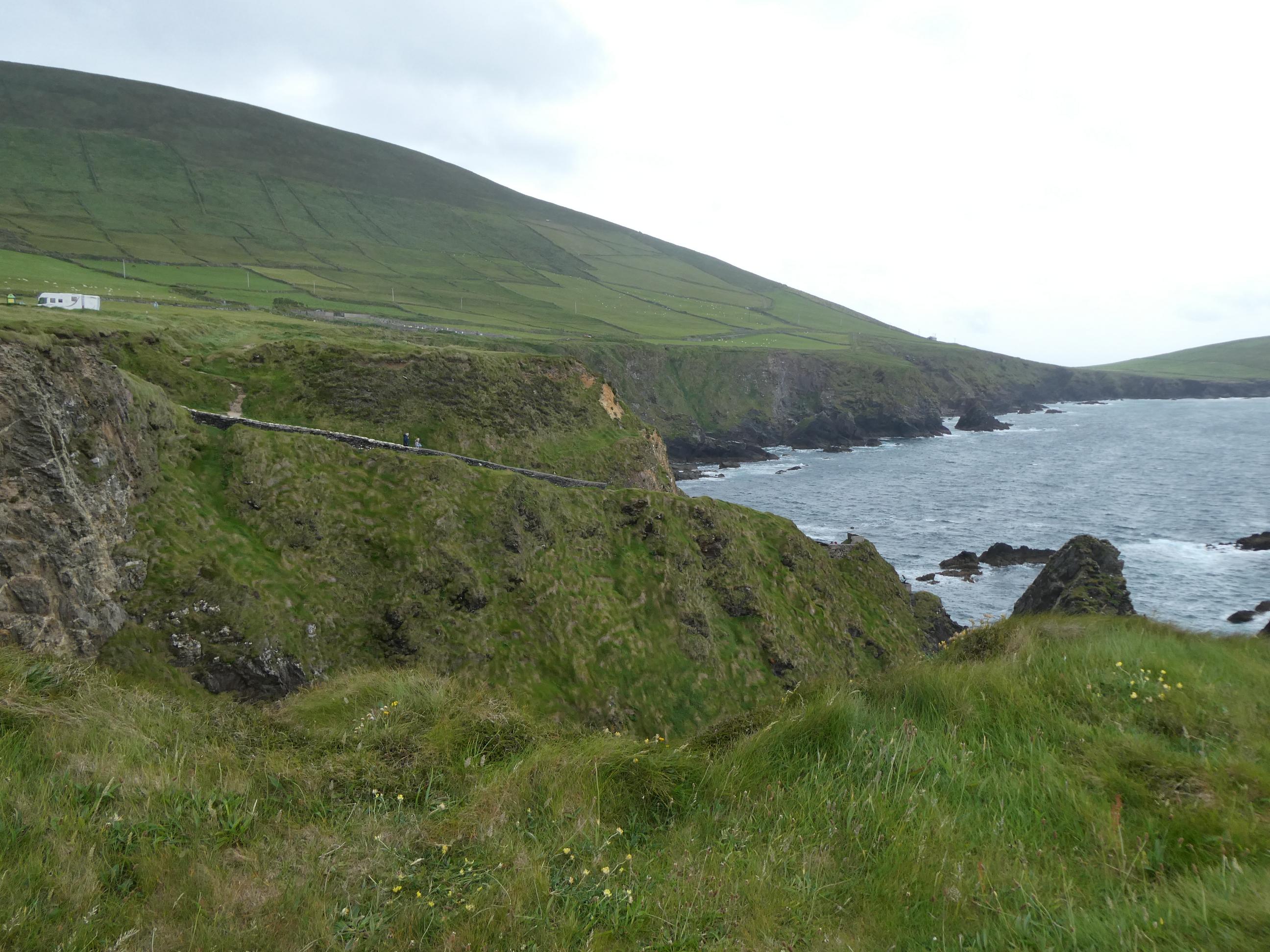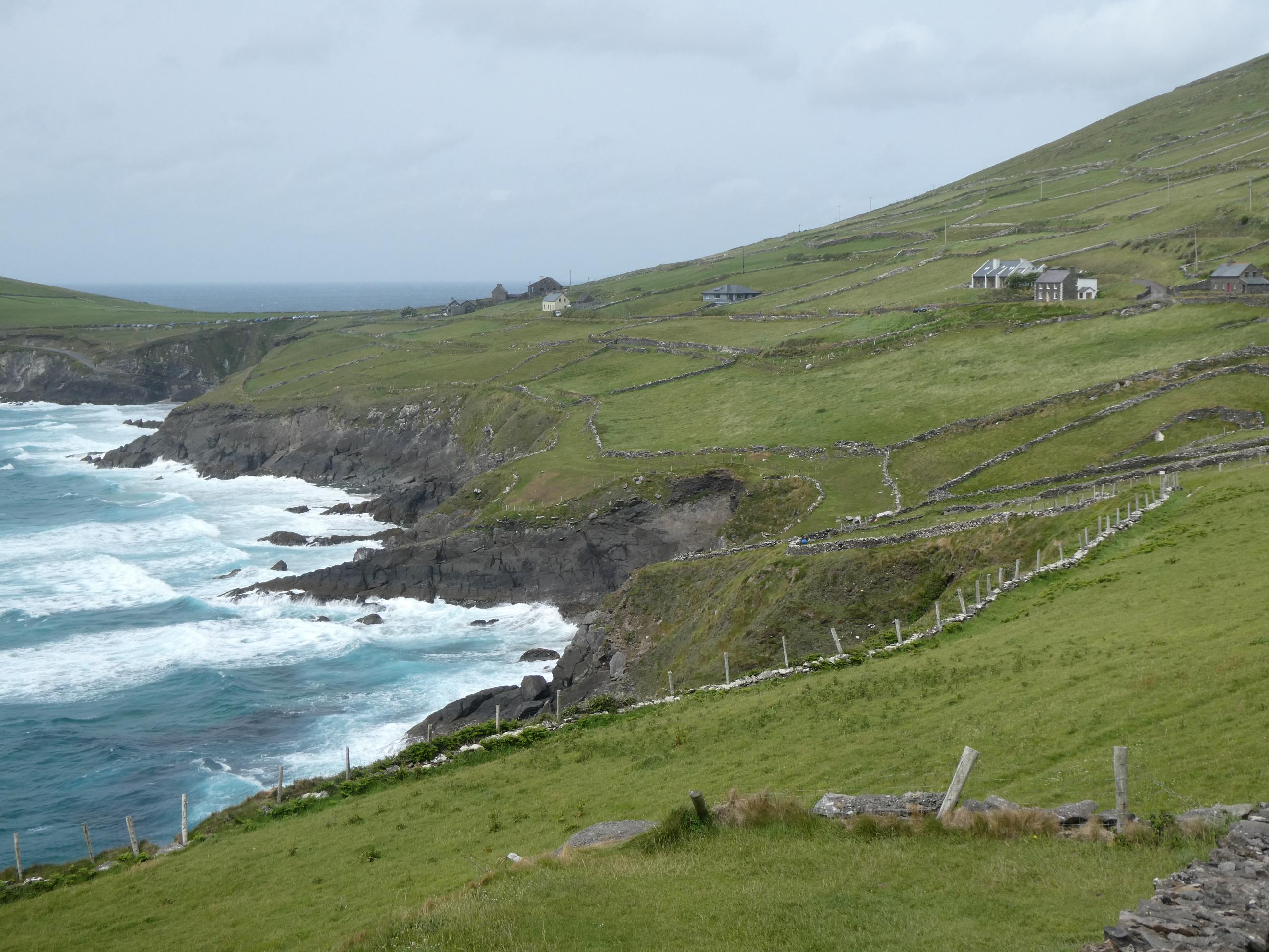This part of the drive was known as the Slea Head scenic route. Essentially this was a loop that started in Dingle and followed the coastline in a clockwise direction around to Gallarus, before cutting back across the peninsula to Dingle again. From Fahan around to Dunquin Pier, the road is elevated, narrow and windy. It hugs the side of a steep hill with a long drop to the choppy water below. It’s a great little drive for the passengers because the views are fantastic, but the poor driver needs to keep his eyes on the road and his hands on the wheel because a car coming from the other direction might suddenly appear just a short distance in front, causing both cars to find a passing place where they can carefully squeeze past each other before continuing their journeys. The reward for all of us today was a parking space available at Blasket’s View, from where we could enjoy the beautiful views over to the Blasket Islands. No one lives on those islands anymore. The last people to leave were evacuated in 1953. You can see much of what I love about the west coast of Ireland in some of the photos below – green fields, hilly slopes, surging sea, stone fences, isolated cottages, ruined structures … and wind (you can’t see it, but believe me, it was real).