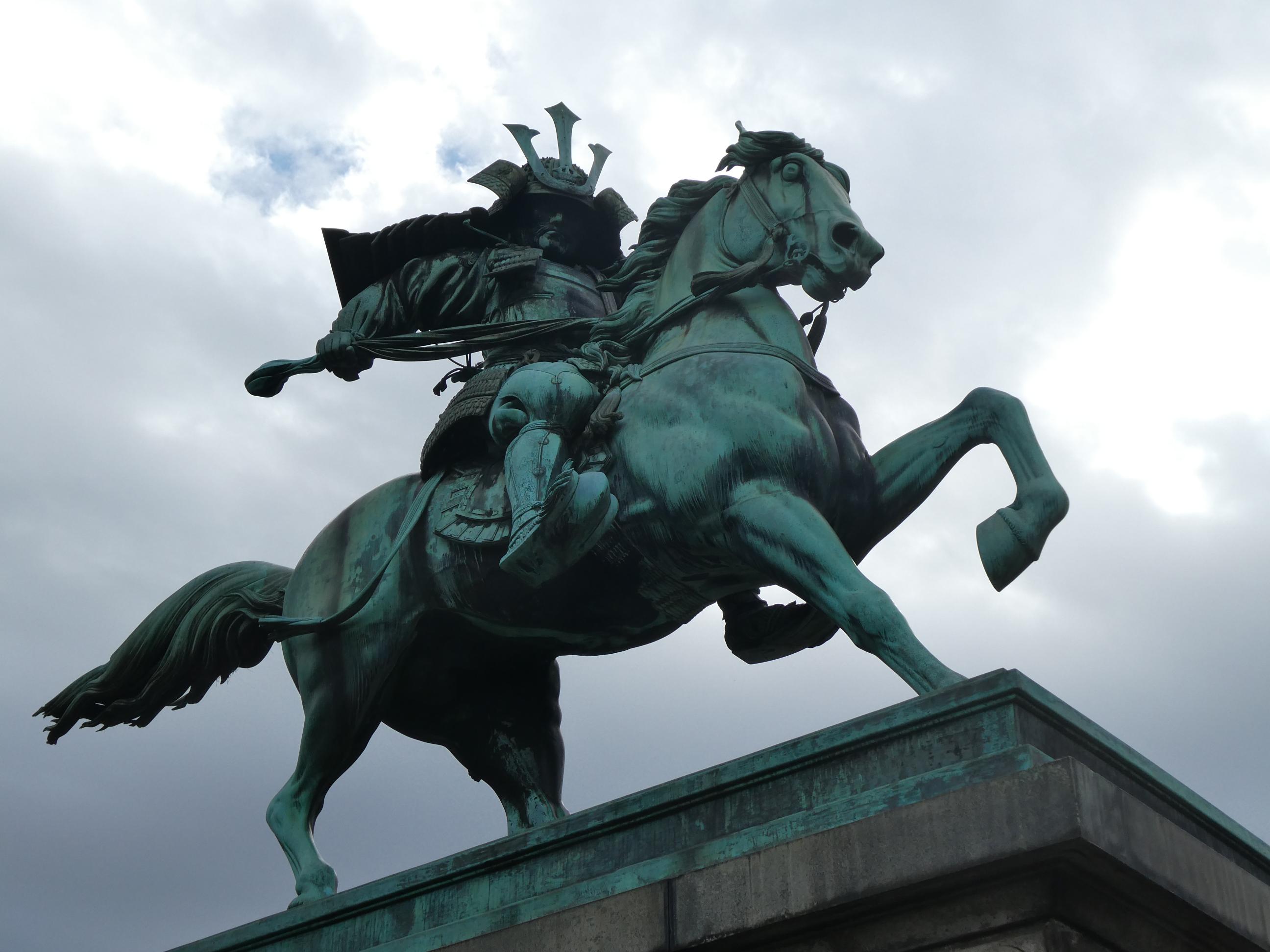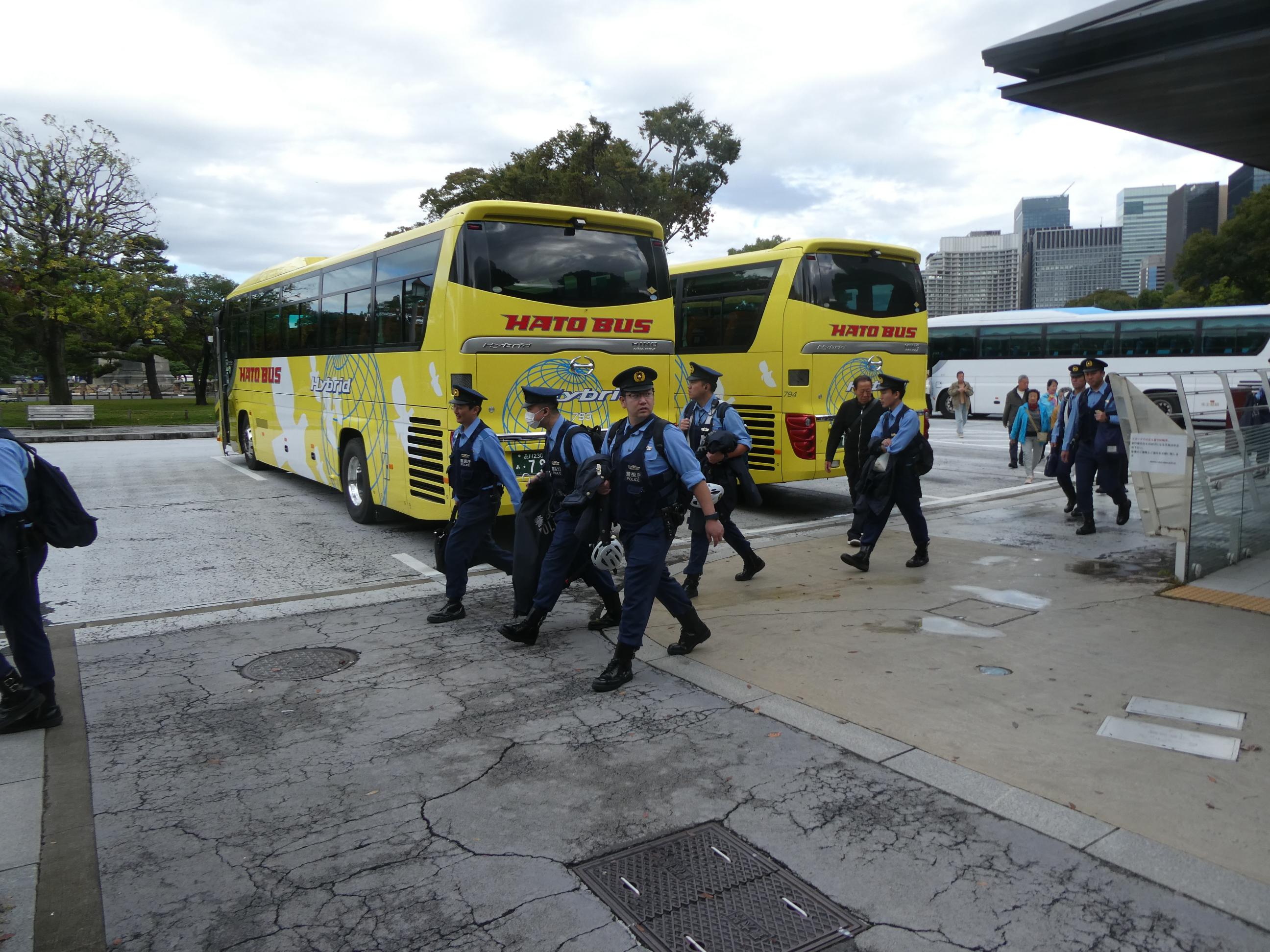 Today, only one watchtower, two bridges (the iron one was covered up due to restoration work) and the main gate were visible from our vantage point. Although there are times during the year when tourists may enter the grounds and some of the structures, it was closed today because tonight Donald Trump will fly into Tokyo and pay the inhabitants of the palace a visit. Only three people apparently live in the palace – the Japanese Emperor, his wife and daughter. Nevertheless, there are another thousand people who work there every day, from the Emperor’s advisers, assistants and security to the maintenance and gardening crews. During Trump’s visit, another 18,000 police and security people have been brought in to ensure nothing goes wrong. In my photos below you can see a leaf blower noisily clearing the road, a guy looking for litter to dispose of, and police reinforcements arriving to ensure the palace and surrounds are spick and span and that nothing could go wrong while Trump is in the vicinity. That is, of course, if Trump himself doesn’t stuff something up – I guess there’s a strong possibility of that. I really loved the statue of samurai warrior, Kusunoki Masashige, who is honoured here for his loyalty to the Emperor he served during the 1300s.