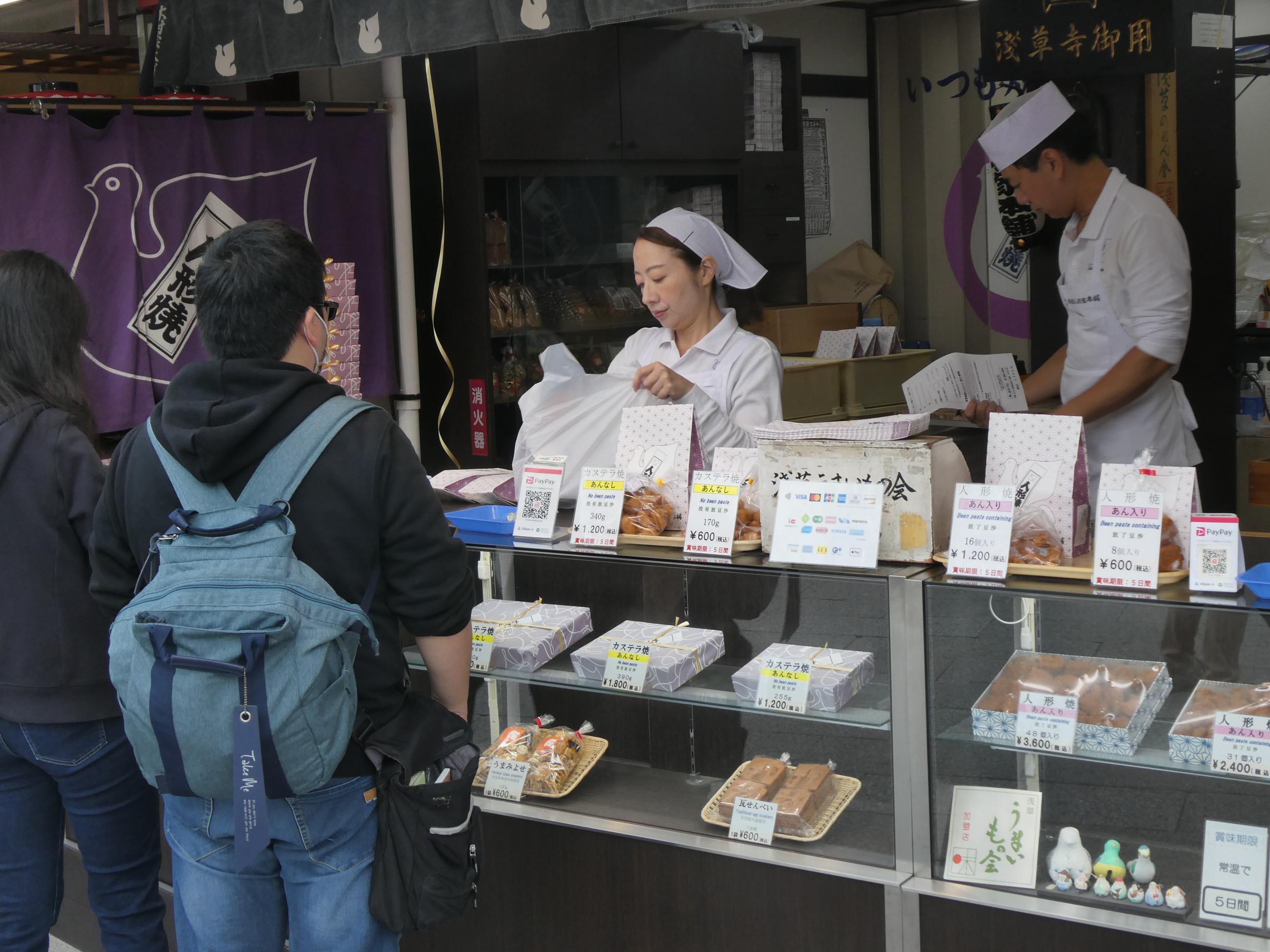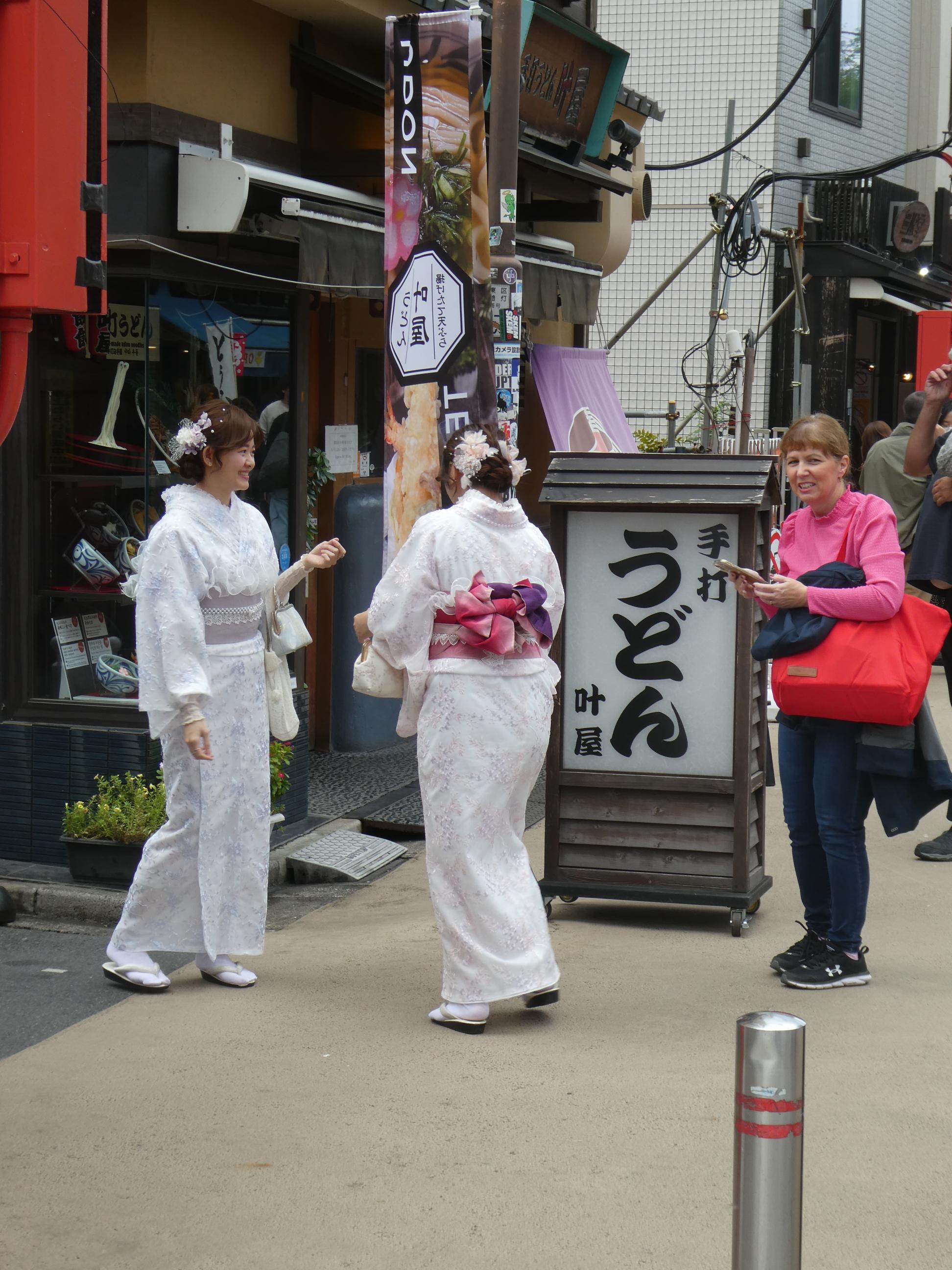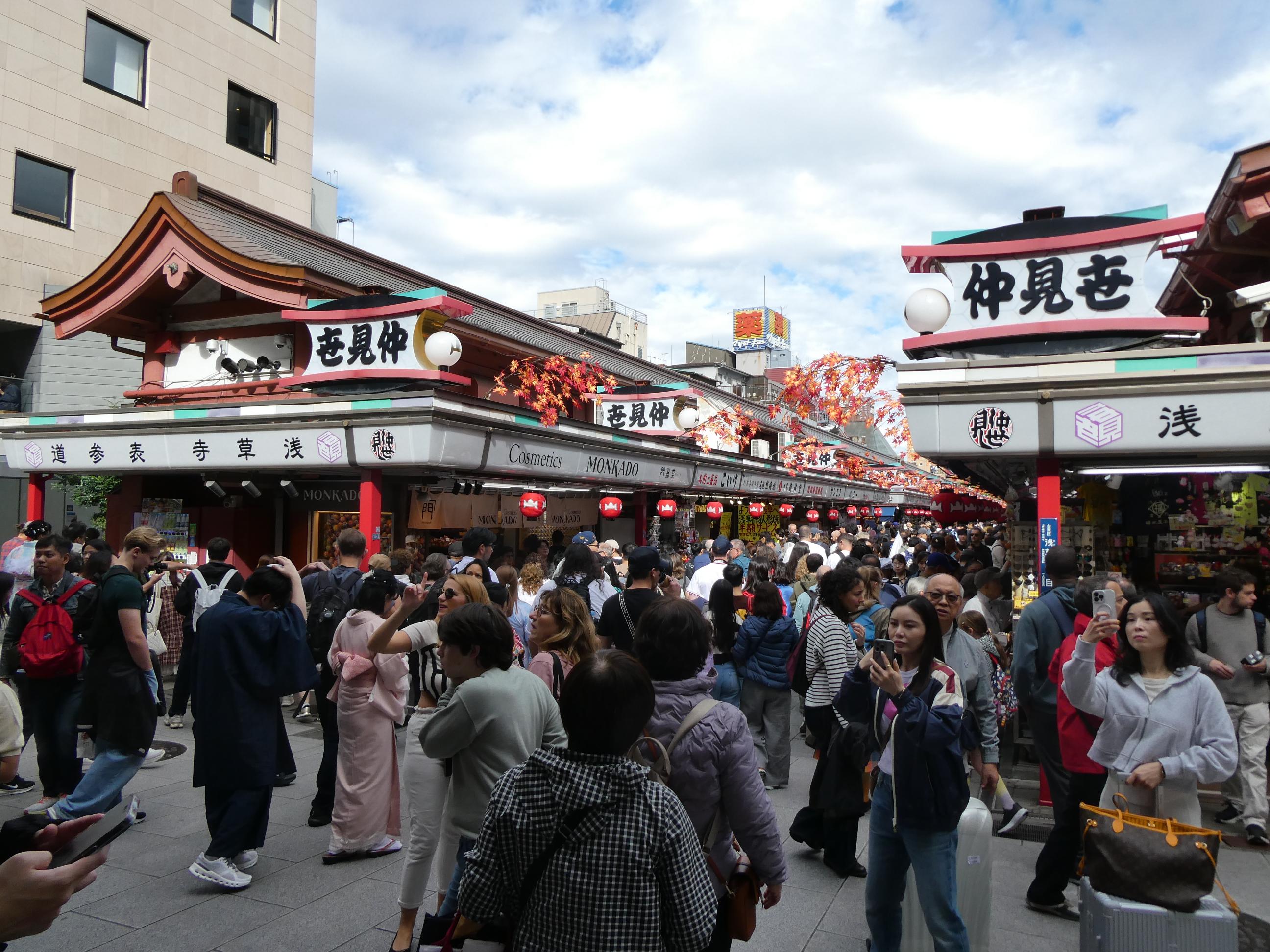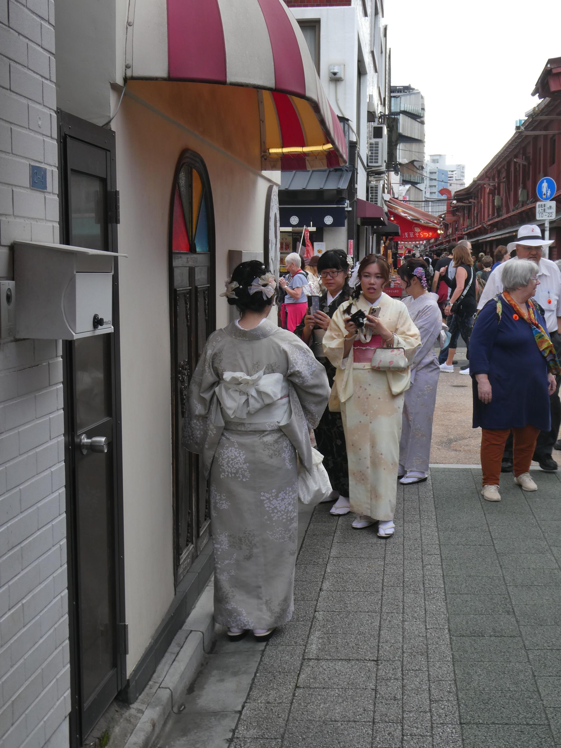 Immediately outside the temple grounds is Nakamise Shopping Street, which was teeming with people, locals and visitors alike. The size of the crowd forced us to take our time and move along slowly and steadily with the flow. We didn’t stop to buy anything, although Marg and Theresa, who are both keen to find appropriate gifts for the grandkids, were interested in a few items. There was never any pressure from any of the vendors, which made interacting with them a good deal more pleasant than other parts of Asia I’ve visited. Eventually, both Marg and Theresa discovered a shop selling scarves that they loved, but these were their only purchases for the entire morning.