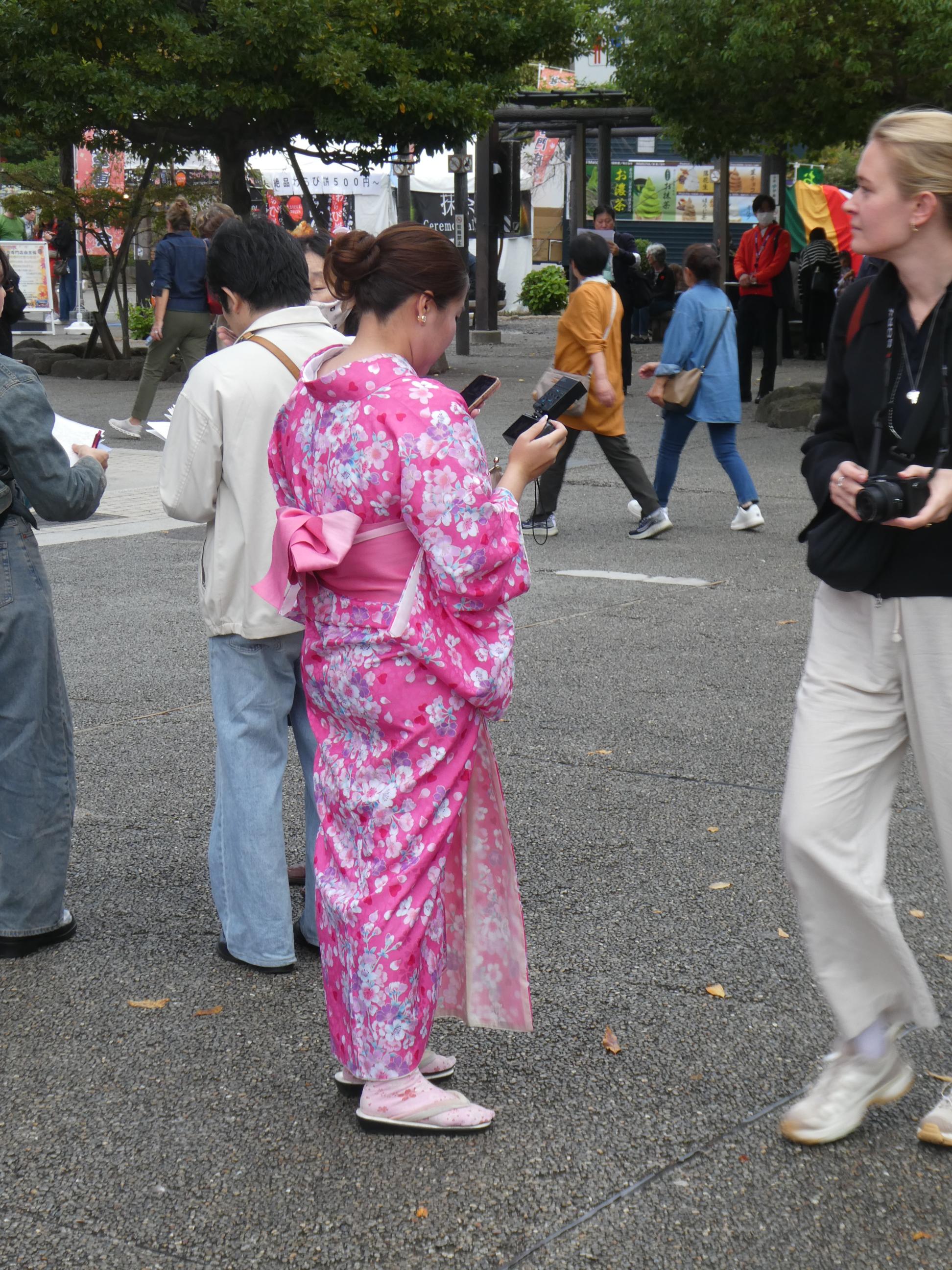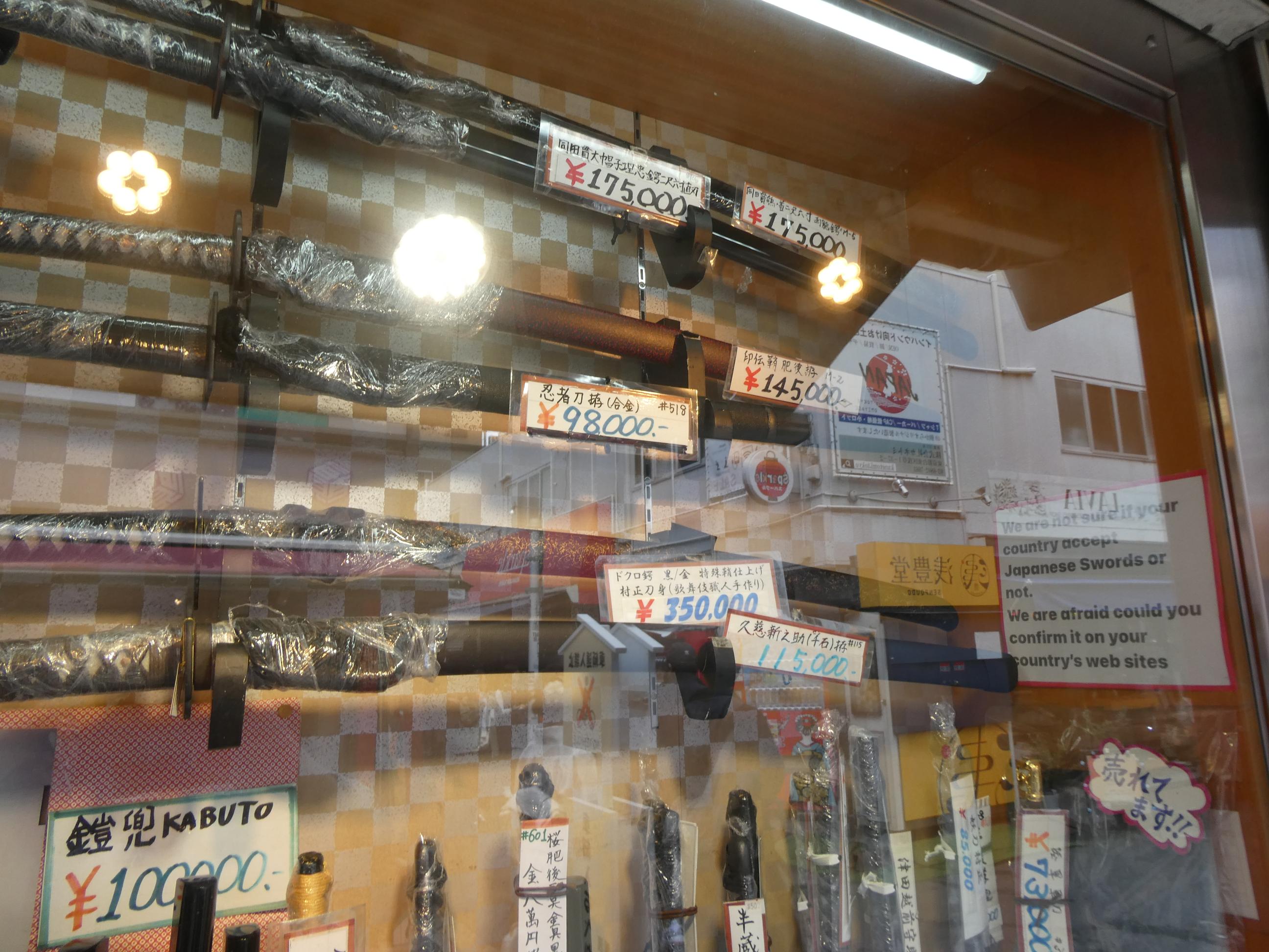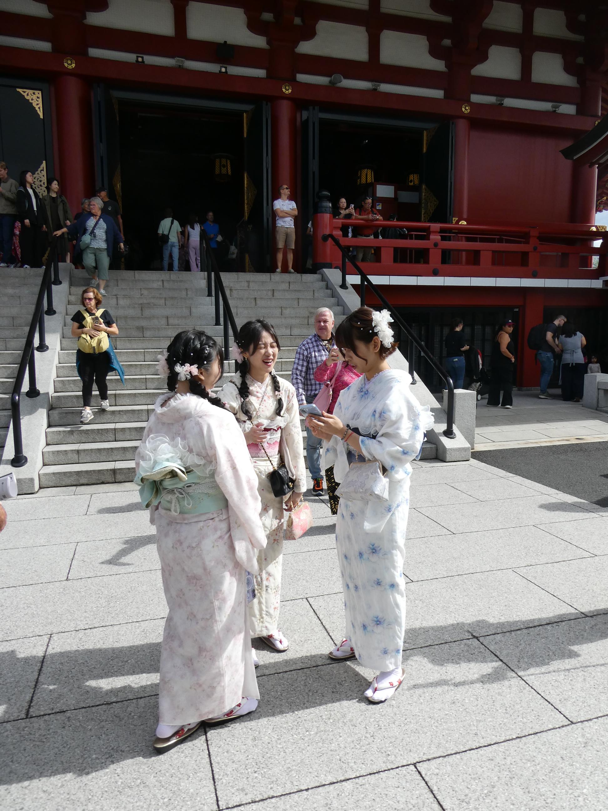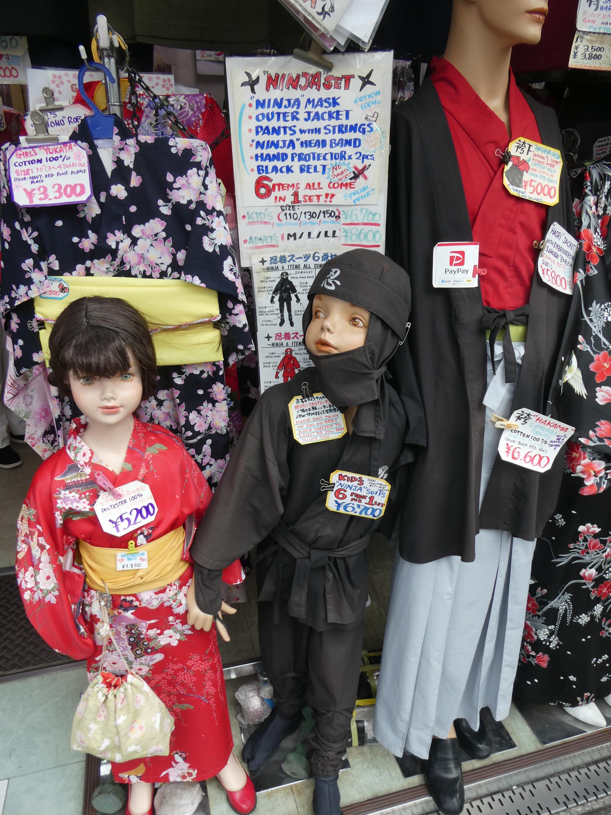 One thing that caught my attention at Asakusa was the number of people, both Japanese and foreigners, who chose to dress in traditional Japanese costume. They looked wonderful, of course, but some of the women’s kimonos must be uncomfortable to wear in such a busy, crowded place. One guy passed me in a man’s kimono, which I think might be called a yukata, with a large samurai sword hanging from his waist! Samurai swords, I might add, could be purchased in the shopping street, though I’m sure you’d have a hard time trying to get one into Australia.