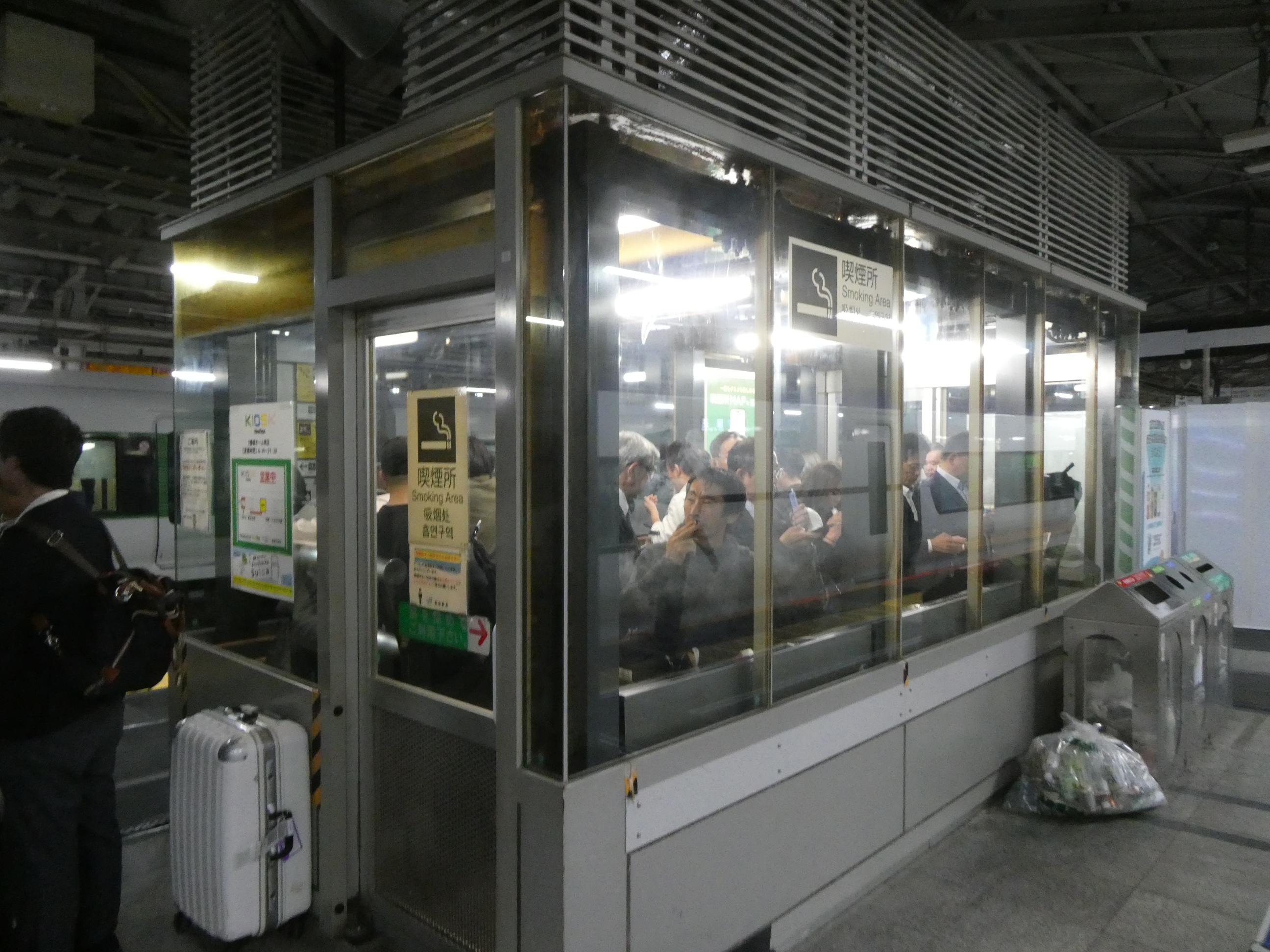Our tour ended outside Tokyo Station, which is beautiful inside and out. We caught a rapid train back to Shinjuku. Walking along the platform, I passed the smoking room, which was crowded with people desperate for a ciggie before they continued their journey home. It looked suffocating inside that room, and its occupants resembled something like battery hens cooped up inside, unable to escape. There’s a smoking room in our hotel too, but its location is better concealed and its occupants aren’t on public display like the poor guys on the railway platform.