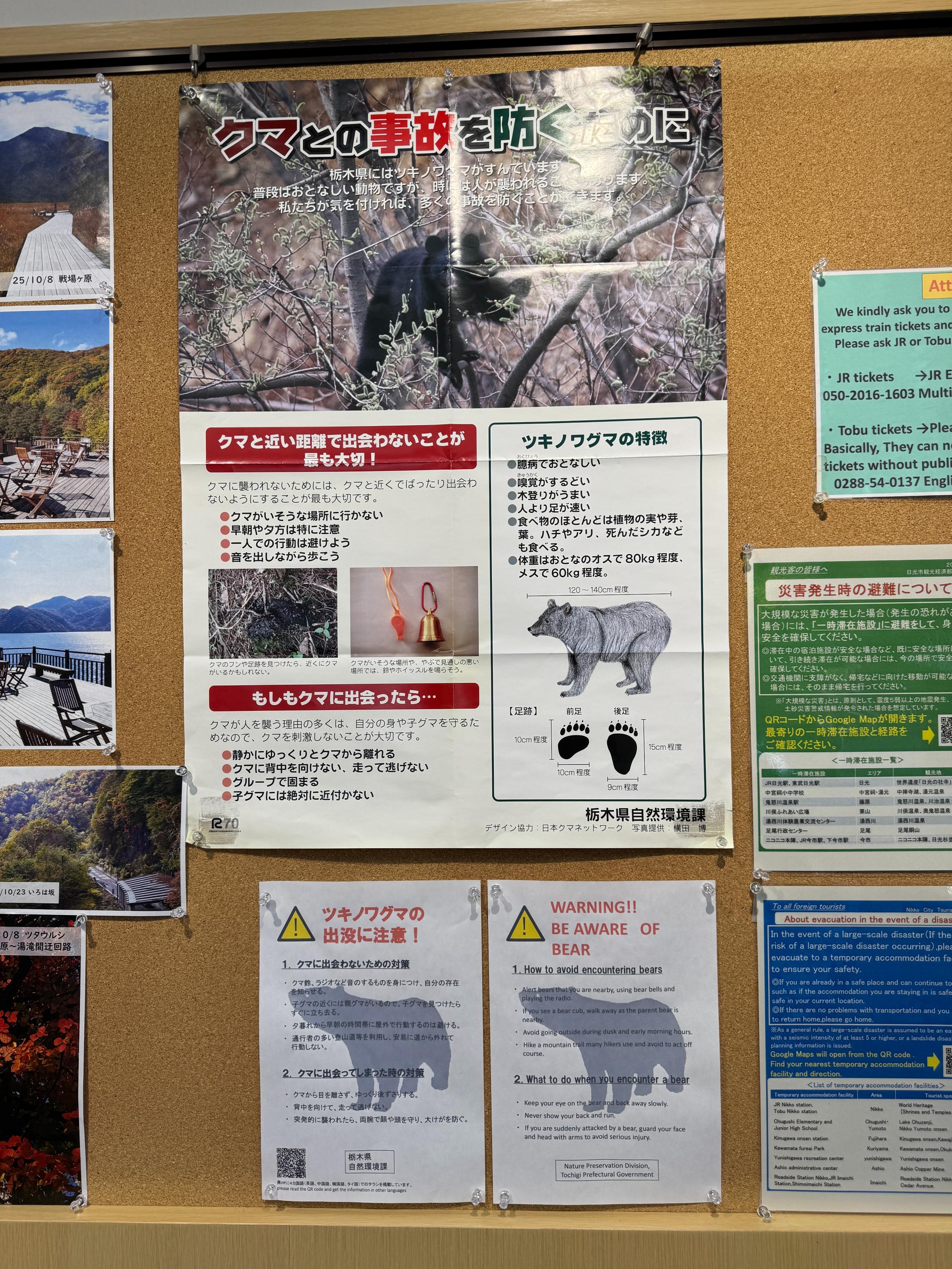 As soon as we arrived in Chuzenji Onsen, we found the Information Centre and went looking for a pamphlet listing tourist activities in and around the town. We couldn’t find one, which was a little weird for an information centre, but we did find warning posters advising us to keep an eye out for bears and giving instructions for how to react if we came across one. I read the final dot point and committed it to memory: ‘If you are suddenly attacked by a bear, guard your face and head with arms to avoid serious injury.’ Thankfully, I never had to test whether or not this strategy worked.