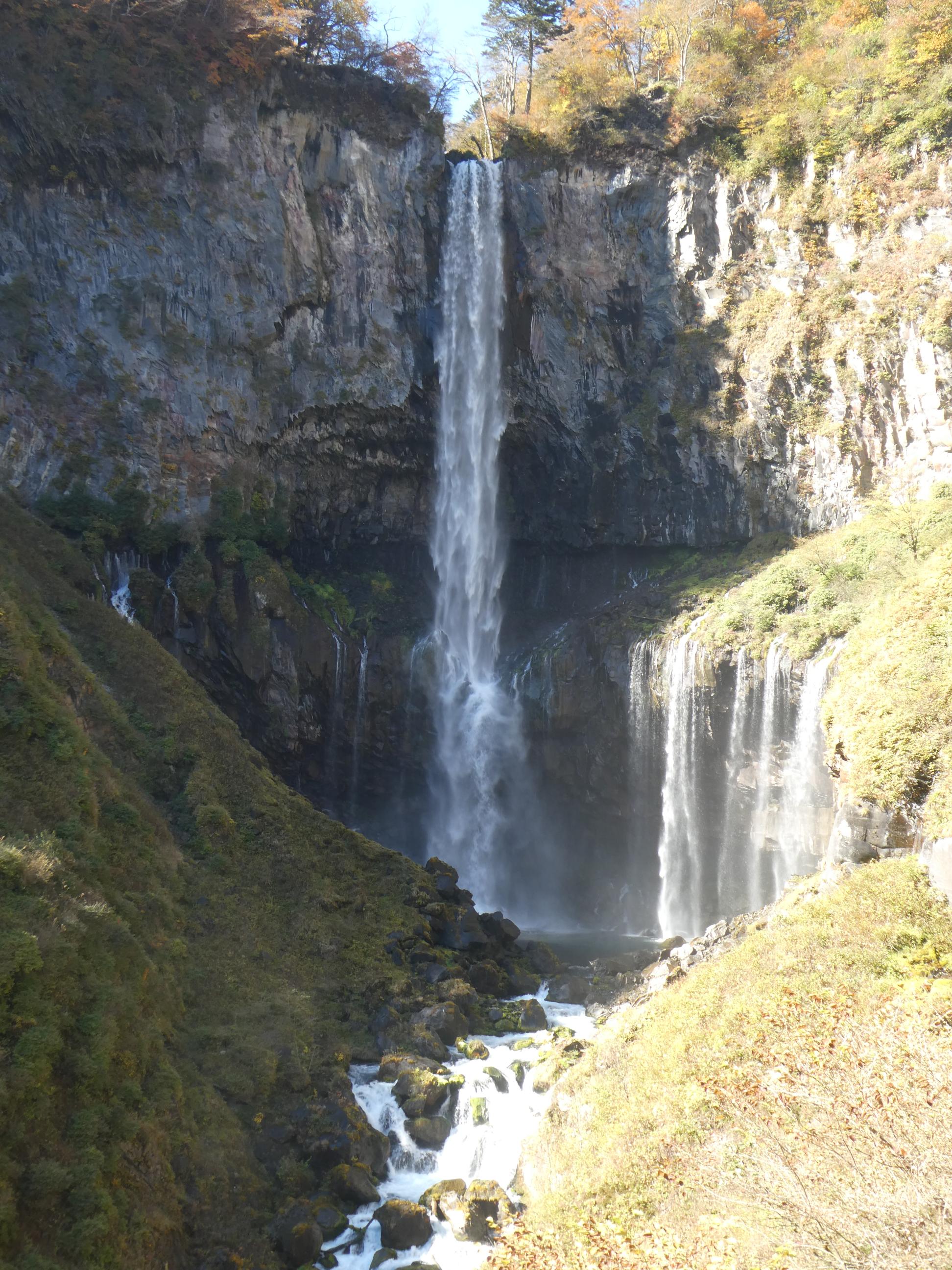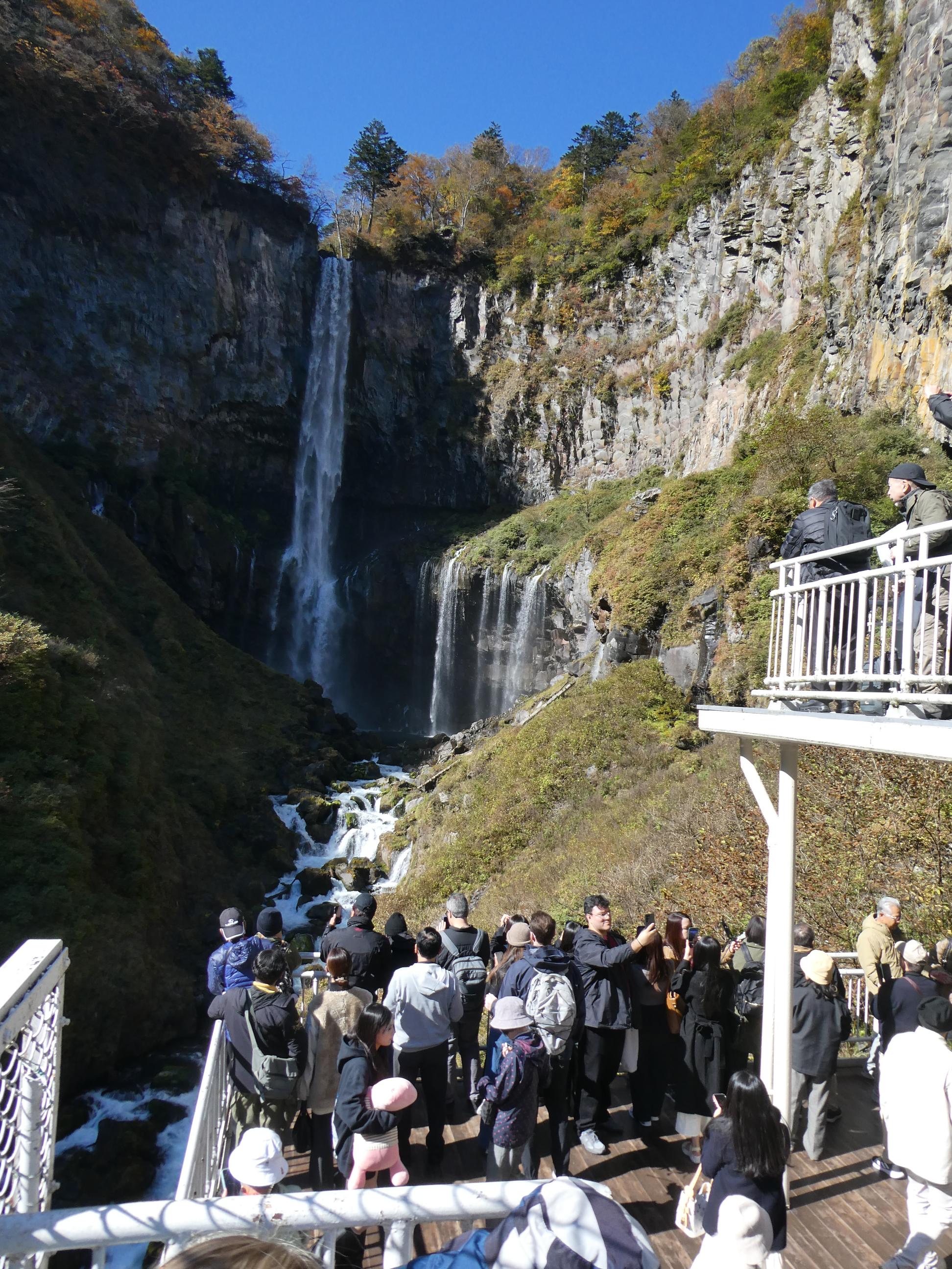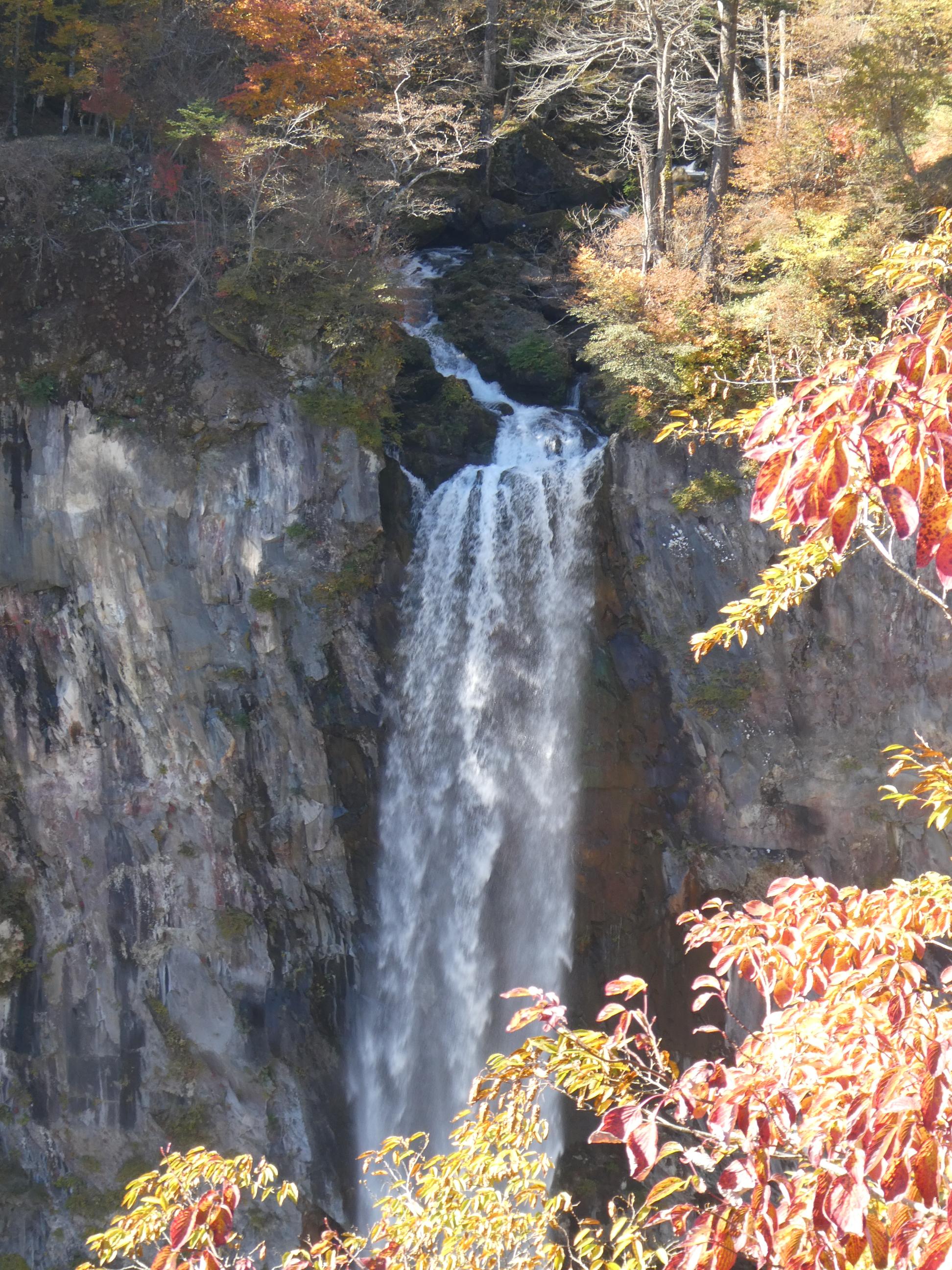 We got on the back of a queue to ride an elevator down to a viewing platform from where we were promised a memorable view of Kegon Falls. The elevator, or what I would call a lift, was built in 1930, which I thought must have been a rather innovative engineering feat for its time. At the bottom of the elevator’s descent 100 metres deep into the ground, we walked out into a long tunnel that eventually brought us to the viewing platform. The view from there was quite a sight to see – much better than the view from the railings near the entrance to the elevator. The forest, resplendent with its stunning autumn foliage, enclosed the rocky falls from each side. Of course, the natural thing to wonder about in a place like this at such a high elevation, is where all this water comes from in the first place. There were surprisingly no signs providing the answer, but I imagine melting snow, natural springs (perhaps those that feed the onsen nearby) and most likely overflow from the lake might be something to do with it.