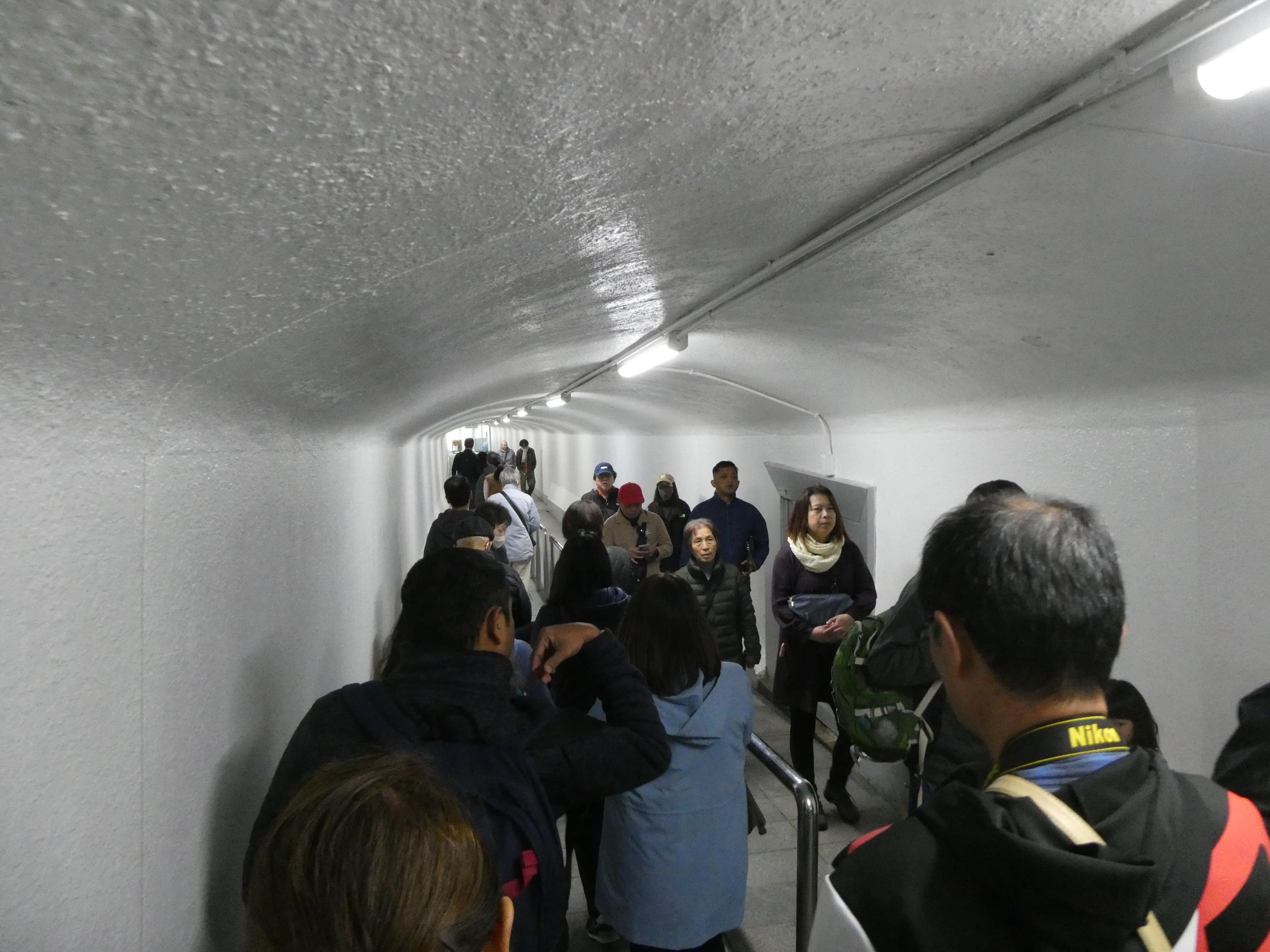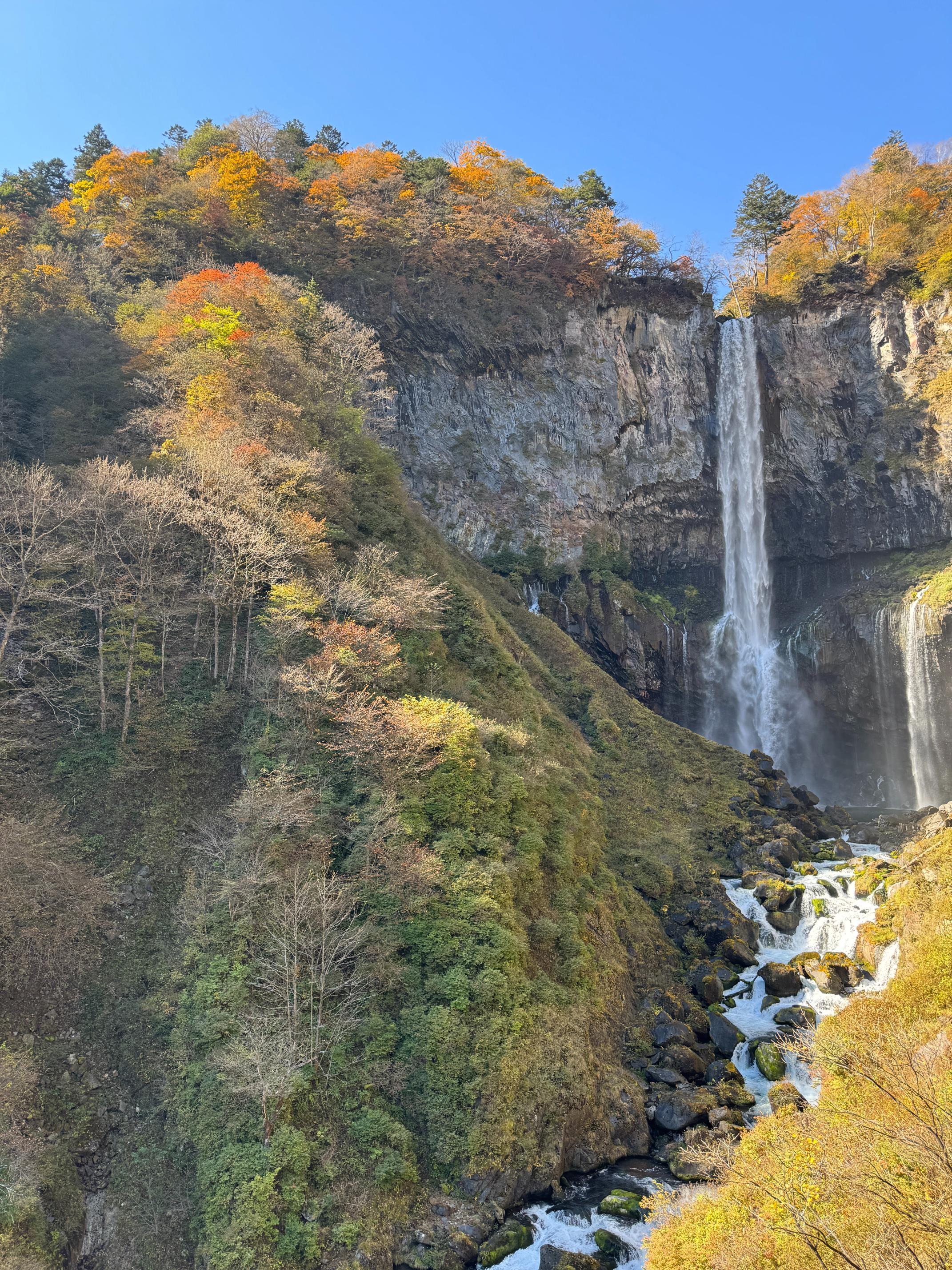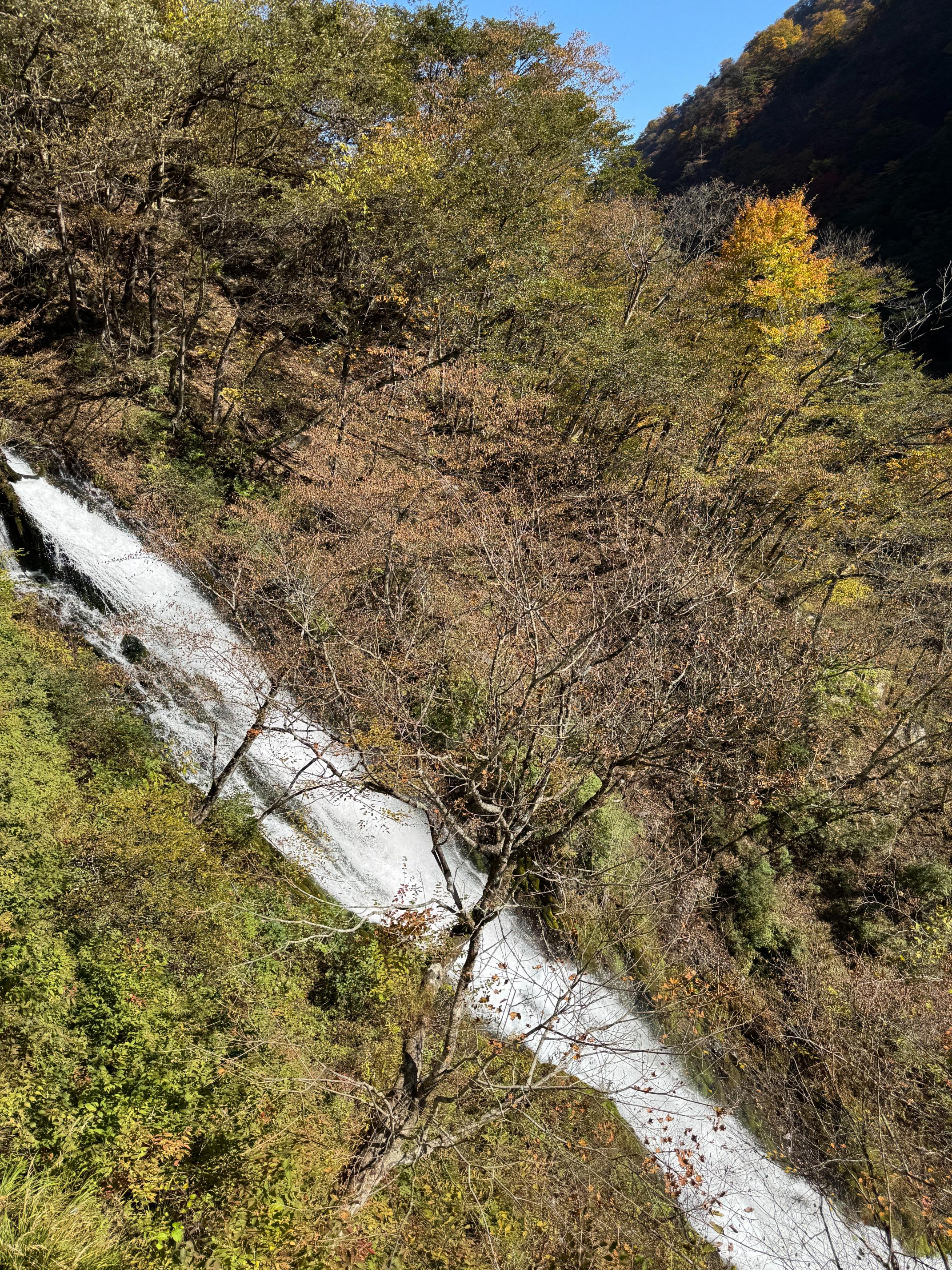 We got on the back of a queue to ride an elevator down to a viewing platform from where we were promised a memorable view of Kegon Falls. The elevator, or what I would call a lift, was built in 1930, which I thought must have been a rather innovative engineering feat for its time. At the bottom of the elevator’s descent 100 metres deep into the ground, we walked out into a long tunnel that eventually brought us to the viewing platform. The view from there was quite a sight to see – much better than the view from the railings near the entrance to the elevator. The forest, resplendent with its stunning autumn foliage, enclosed the rocky falls from each side. Of course, the natural thing to wonder about in a place like this at such a high elevation, is where all this water comes from in the first place. There were surprisingly no signs providing the answer, but I imagine melting snow, natural springs (perhaps those that feed the onsen nearby) and most likely overflow from the lake might be something to do with it.