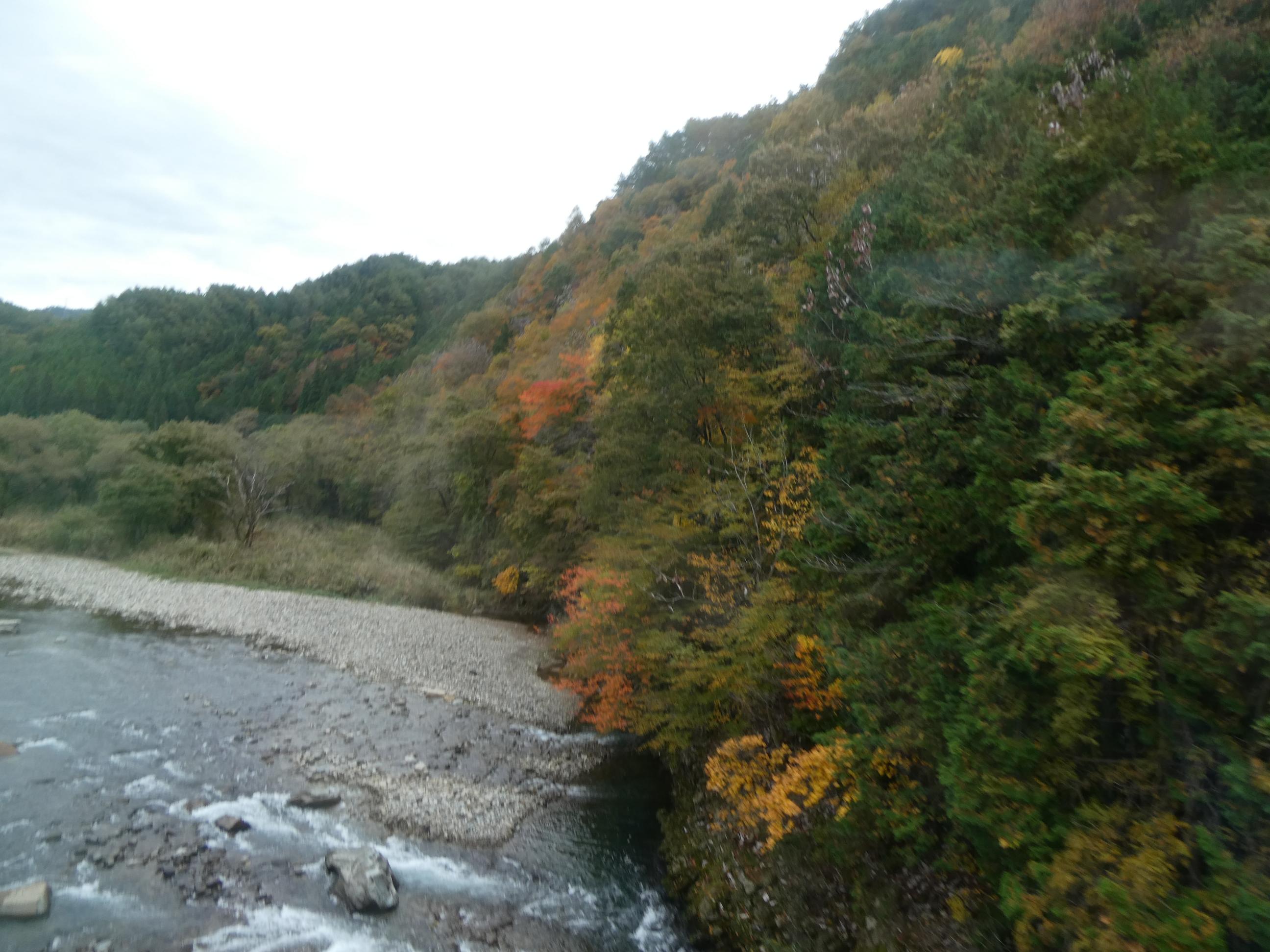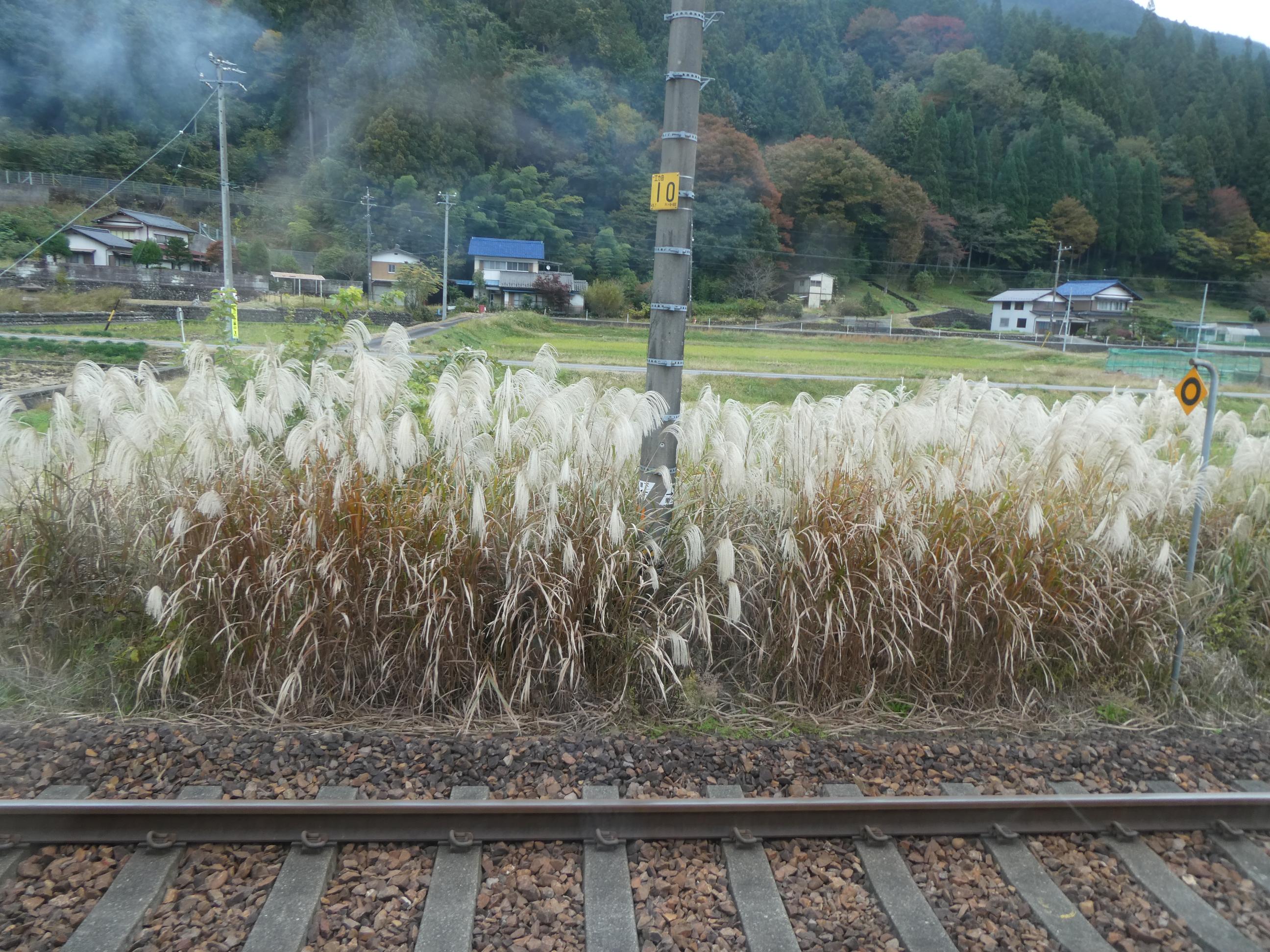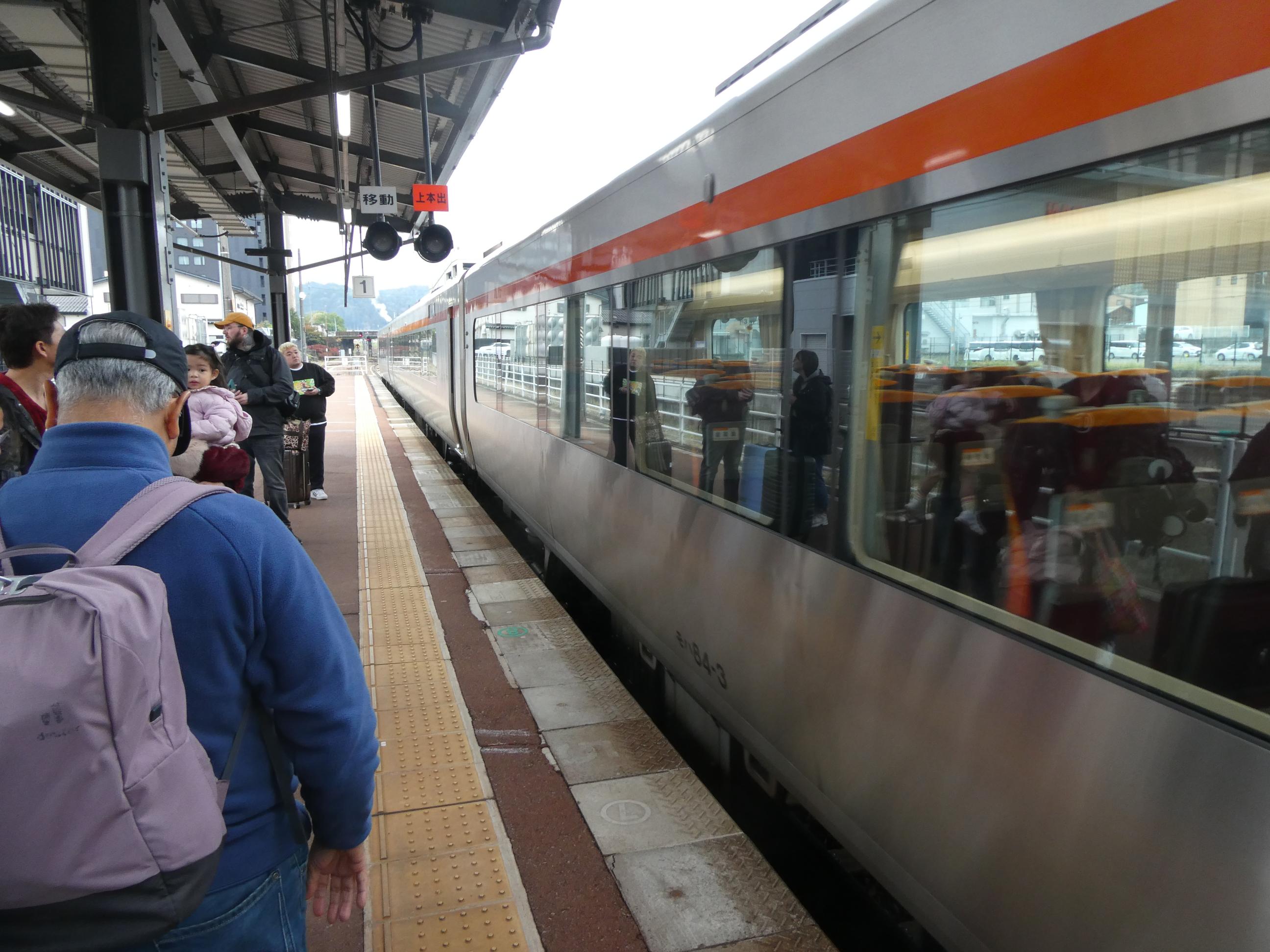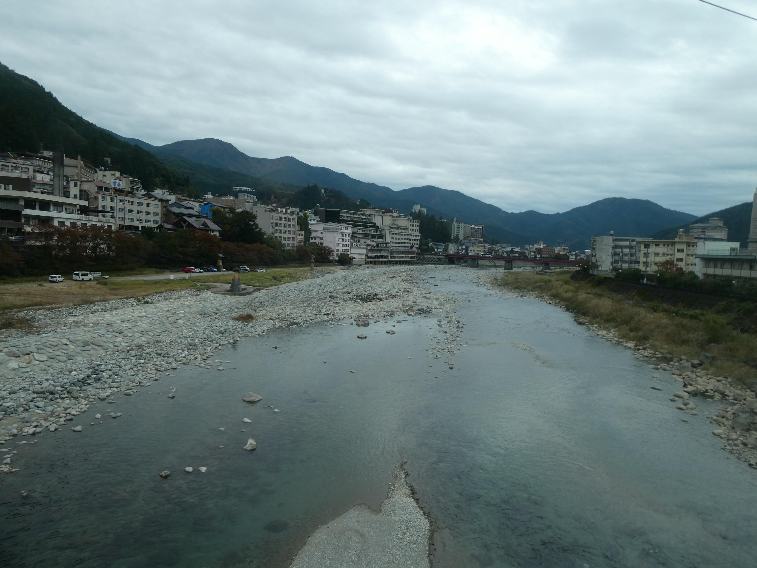 We were due to arrive at Mino-Ota at 11.18 am and change to another platform to catch our second train at 11.24 am. It was cutting it fine, especially when we weren’t sure or which platform to go to or the layout of the station. Worse still, our train got in late and it was actually 11.21 am when we hefted our suitcases onto the platform. Even worse than that, our carriage was at the far end of the platform from the stairs. We bolted down the platform as quick as our geriatric legs would carry us, avoiding dawdling passengers and trying to find a sign to show the way. Above my head I saw a sign in Japanese characters with the numbers 12.23 next to it and a large platform number 3. That was our next train. We were on Platform 1. I picked up both my suitcases and Ian grabbed his and we charged up two flights of stairs, across to the next platform, and down those stairs as fast as we could go, with Theresa and Marg hot on our heels. Below me, at the bottom of the stairs, I could see a train guard holding his baton, just about to wave to the driver to take off. ‘Tashimi?’ I called out to him. He heard me, and pointed to the open door at the bottom of the stairs. We all jumped on and he waved the driver off just seconds later. Phew! We didn’t have reserved seats on the short trip to Tashimi and their was no luggage space. We just dumped our suitcases on some empty seats and a lovely old Japanese couple voluntarily moved back a seat so we could sit together. One end of the carriage was full of school kids going on an excursion. From Tashimi, we had another very relaxing one hour journey to Kiso Fukushima, which lies in the Kiso River valley. I’m really enjoying Japanese train travel.