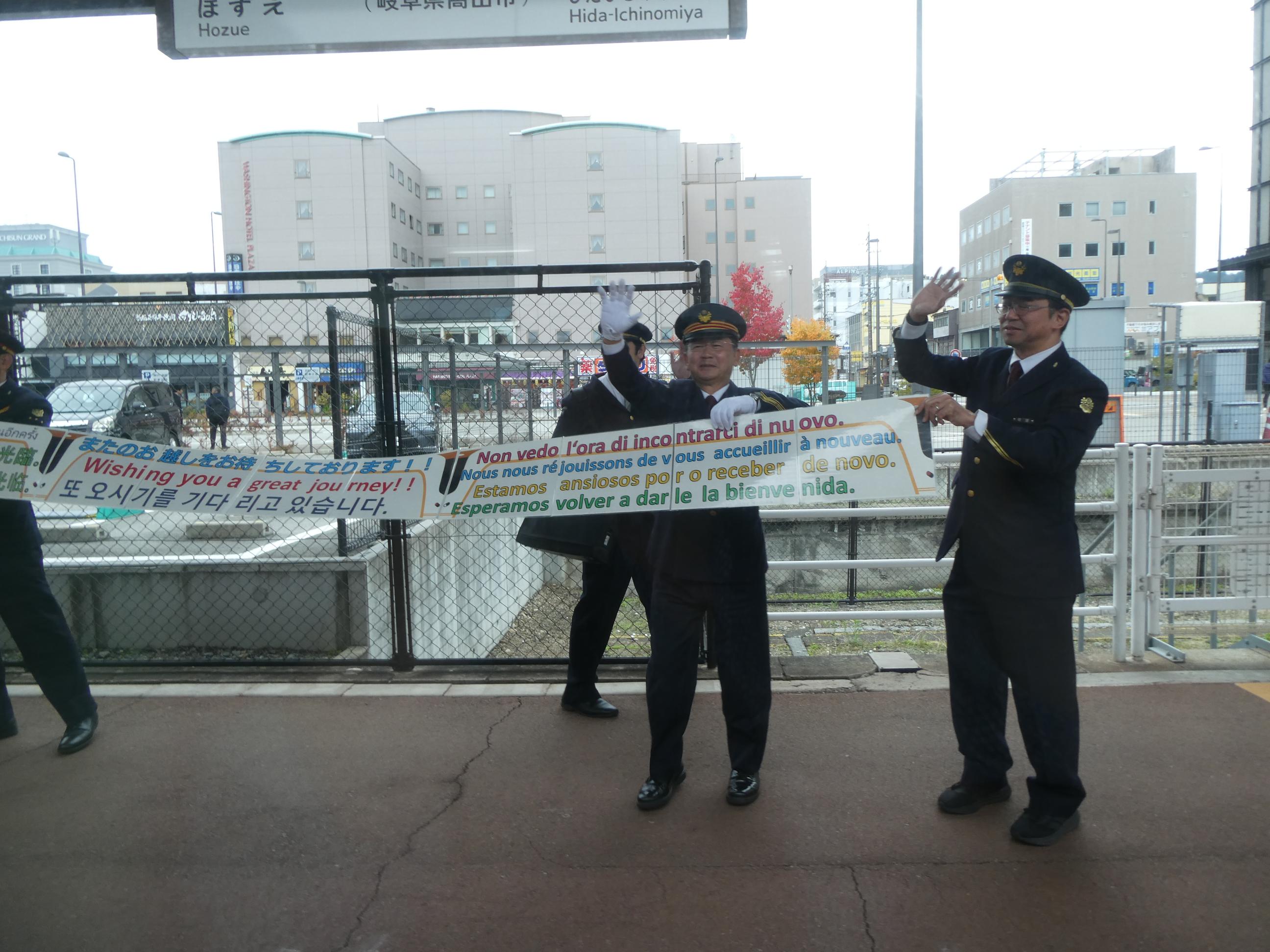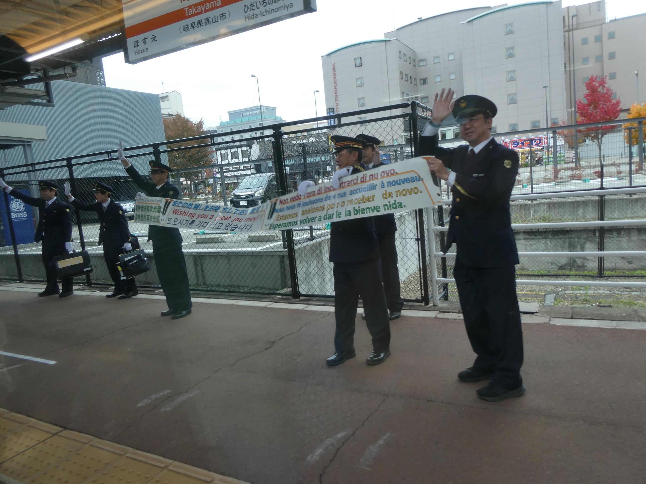 We had to catch three trains today. None of them was a Shinkansen. Our hotel host drove us to the railway station after breakfast. We waited on the platform while chatting to Dennis and Kay from East Doncaster, who we’ve kept bumping into over the last 3 or 4 days. We discovered that they booked their tour with Haydn at Japan Package Tours too, hence some similarities in parts of our itineraries. What a pleasant surprise it was when the railway station staff came to the end of the platform to wish everyone a safe journey as the train was leaving. I wasn’t really surprised. The Japanese people we’ve encountered, almost without exception, have been friendly, courteous and willing to help, even when it means interrupting what they’re doing. Even the people on the street or passengers on the train we’ve had to ask a question have answered with a smile and a bow of the head. Theresa found one exception to this in the Kanazawa Omicho Market a few days ago when she tried to take a photo of a seafood stall and the guy behind the counter barked at her and pointed to a very small ‘No photos sign’. It’s good to know that even in Japan there’s at least one grumpy old man.