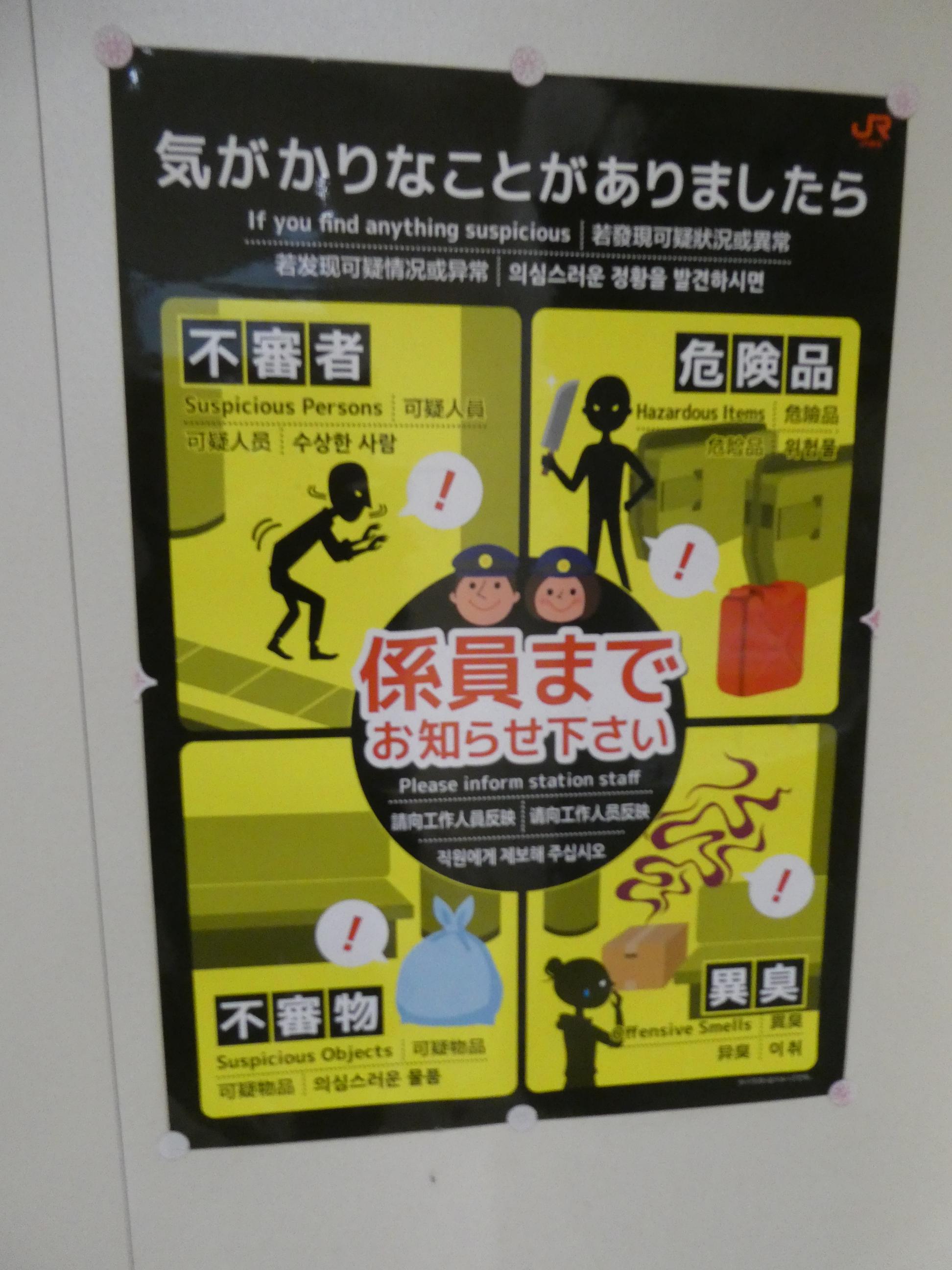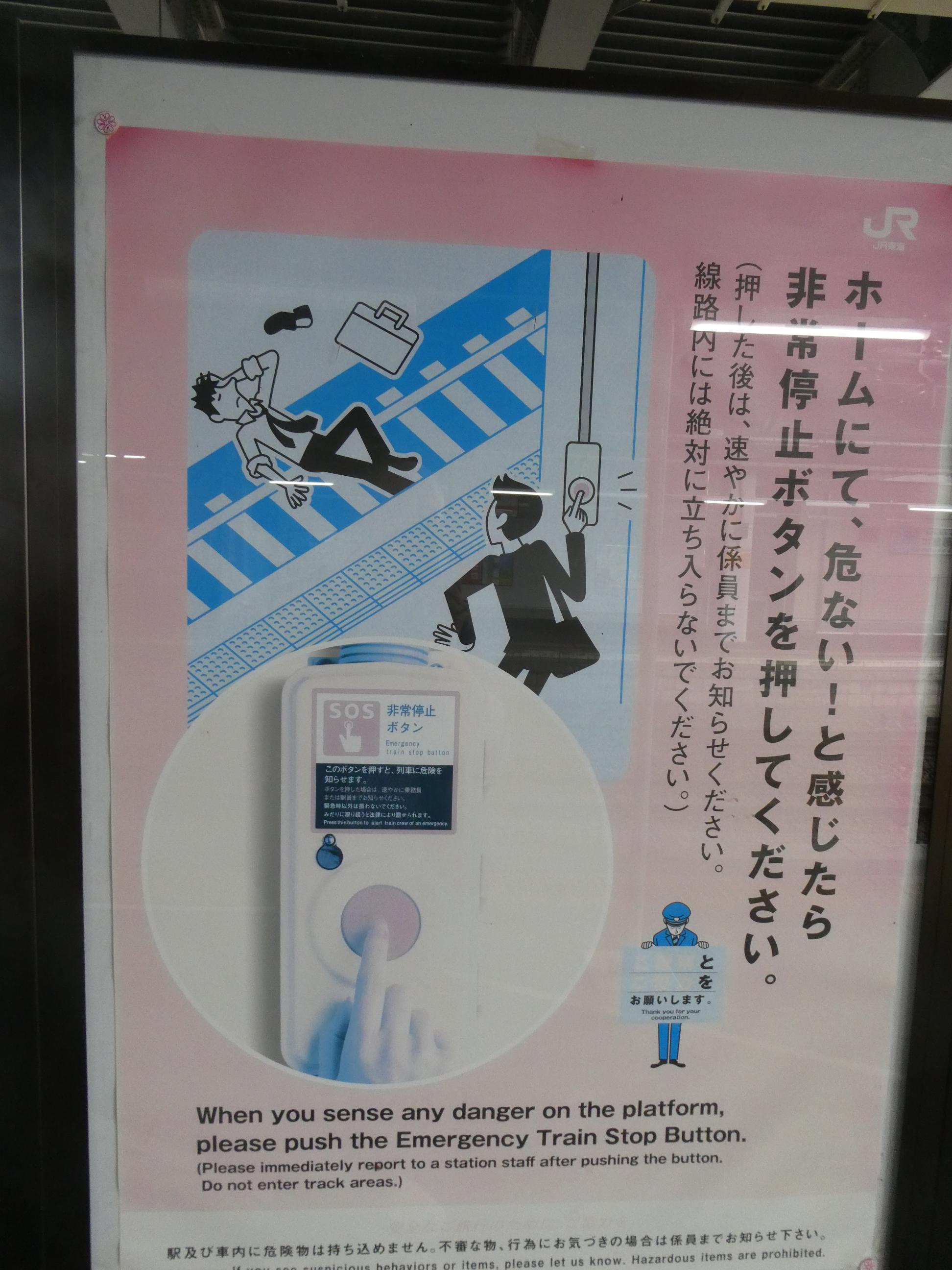 We’ve spent a bit of time in Japanese railway stations and on platforms now, and some of the graphics on the signs are rather amusing. Of course, some of them deal with very serious subject matter which I don’t find amusing. And while we’re on the subject of amusing signs, the last three are from our walk around the town later in the day. I wonder if anyone’s ever felt hungry and rung for a tomato home delivery.