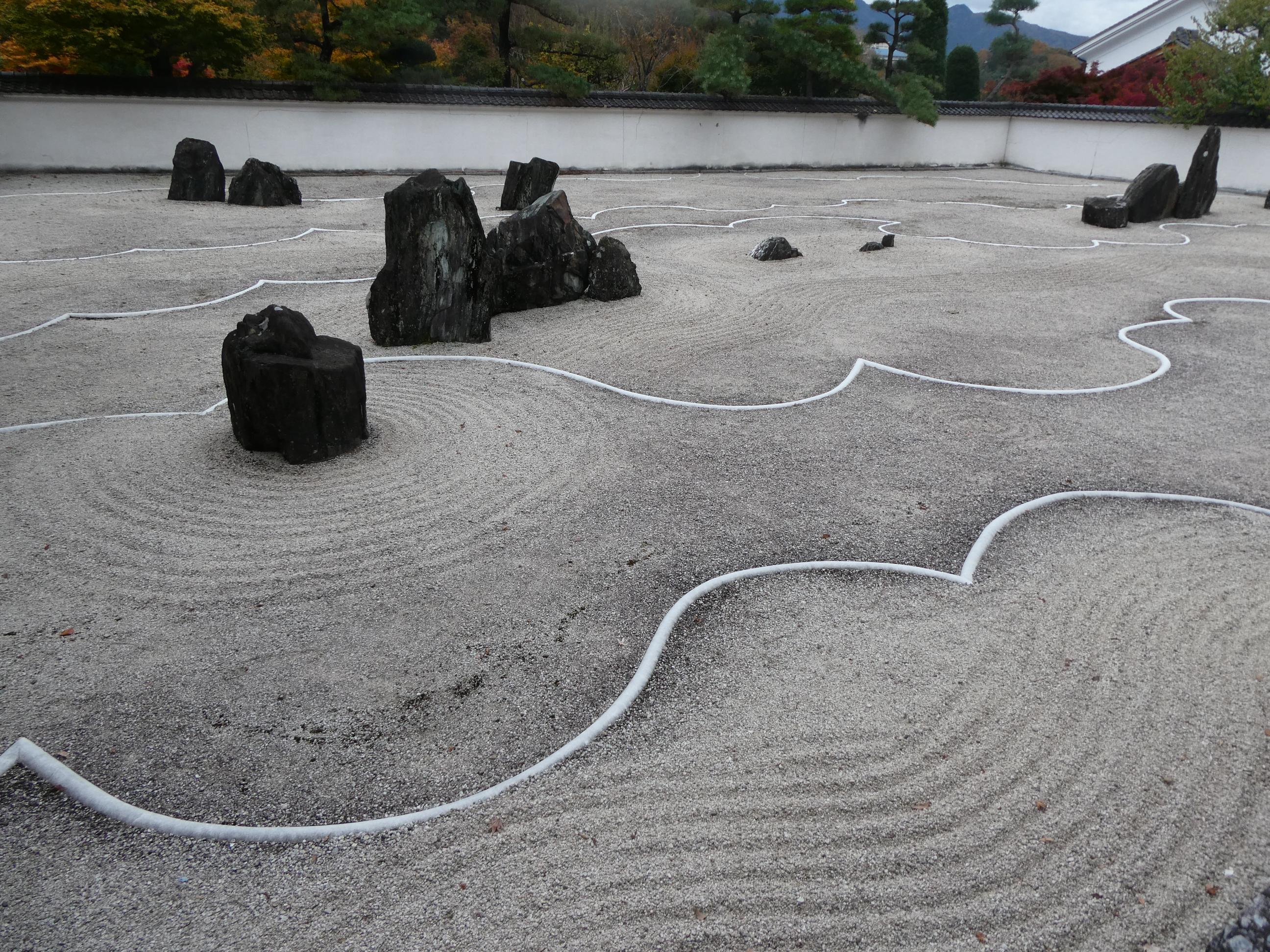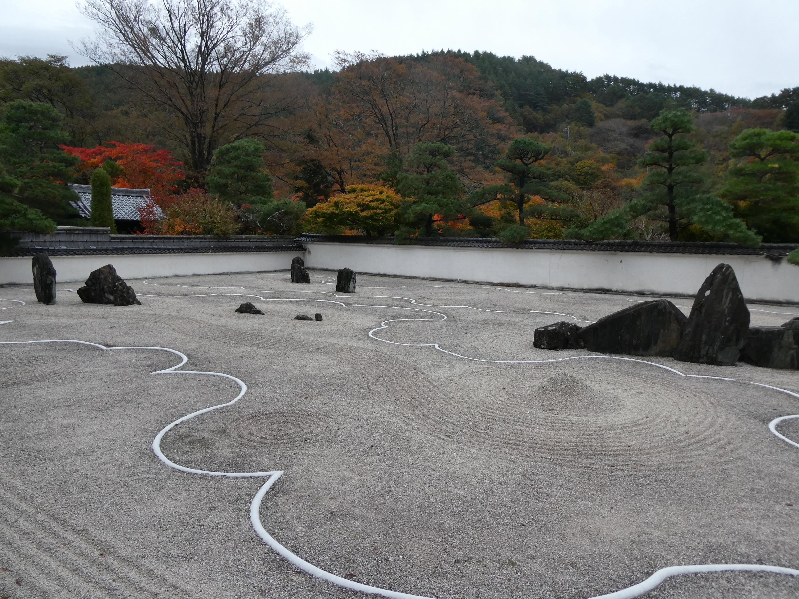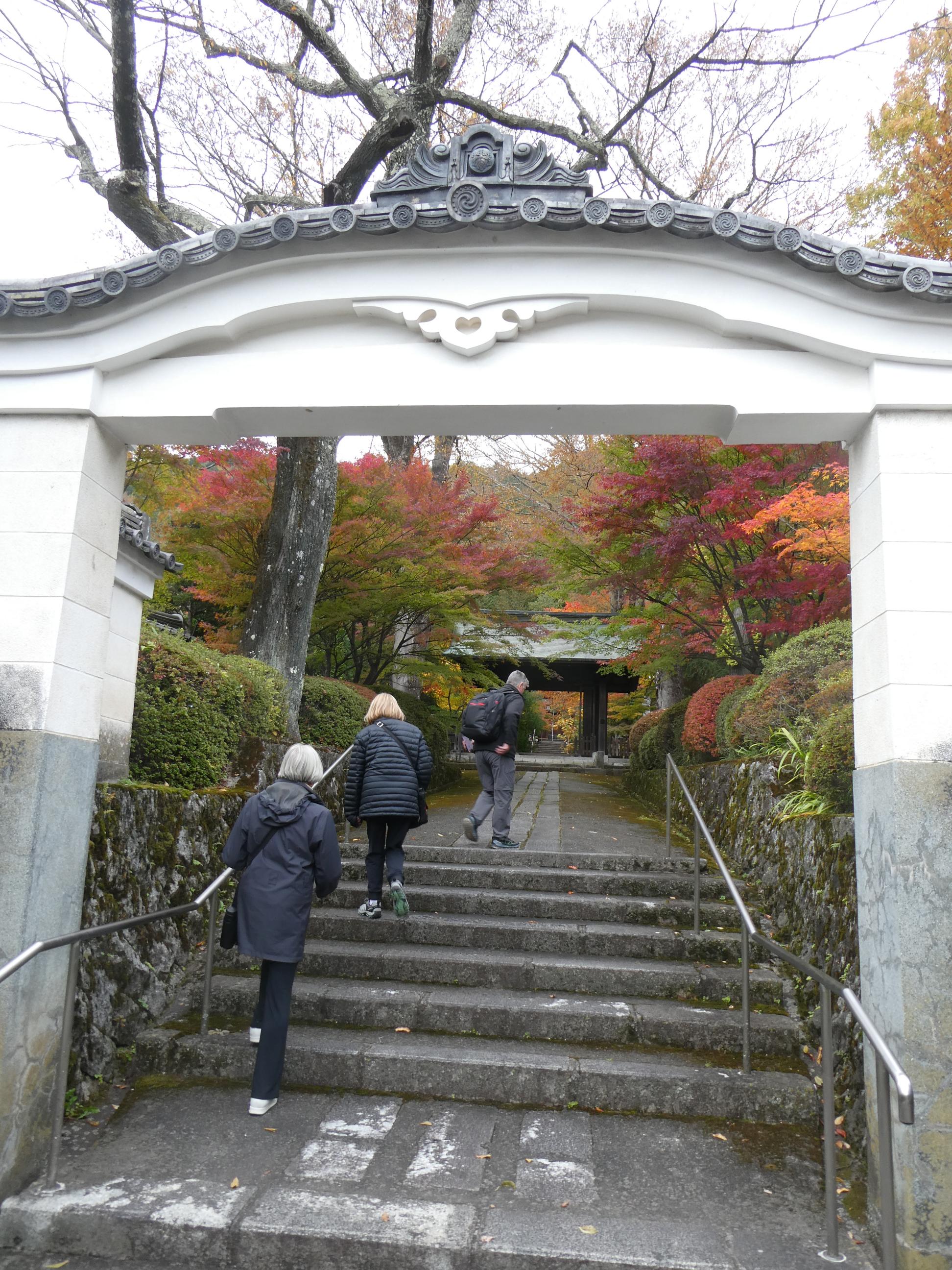 We walked across the Tekisho Bridge, stopping for a photo, and entered the grounds of Kozenji Temple on the other side. We certainly picked the right time of year to visit. The autumn foliage of the temple garden was quite breathtaking in its display of colours. It’s not a large garden, compared with the one we visited in the rain in Kanazawa a few days ago, but it was an absolute delight to walk through. Also featured here is Asia’s largest dry stone garden. The temple itself was closed to visitors, but we were able to visit a hall where the work of local artisans was on display.